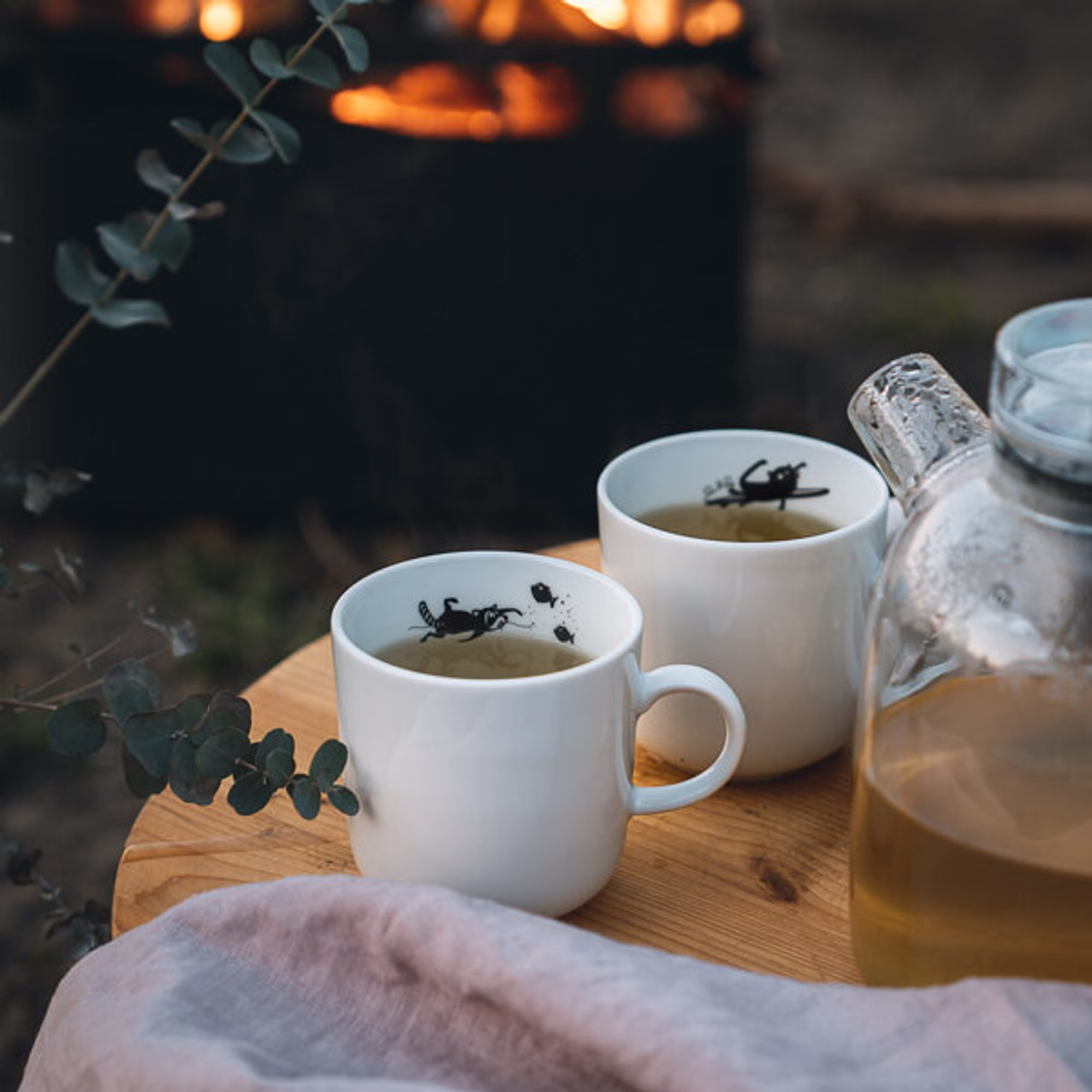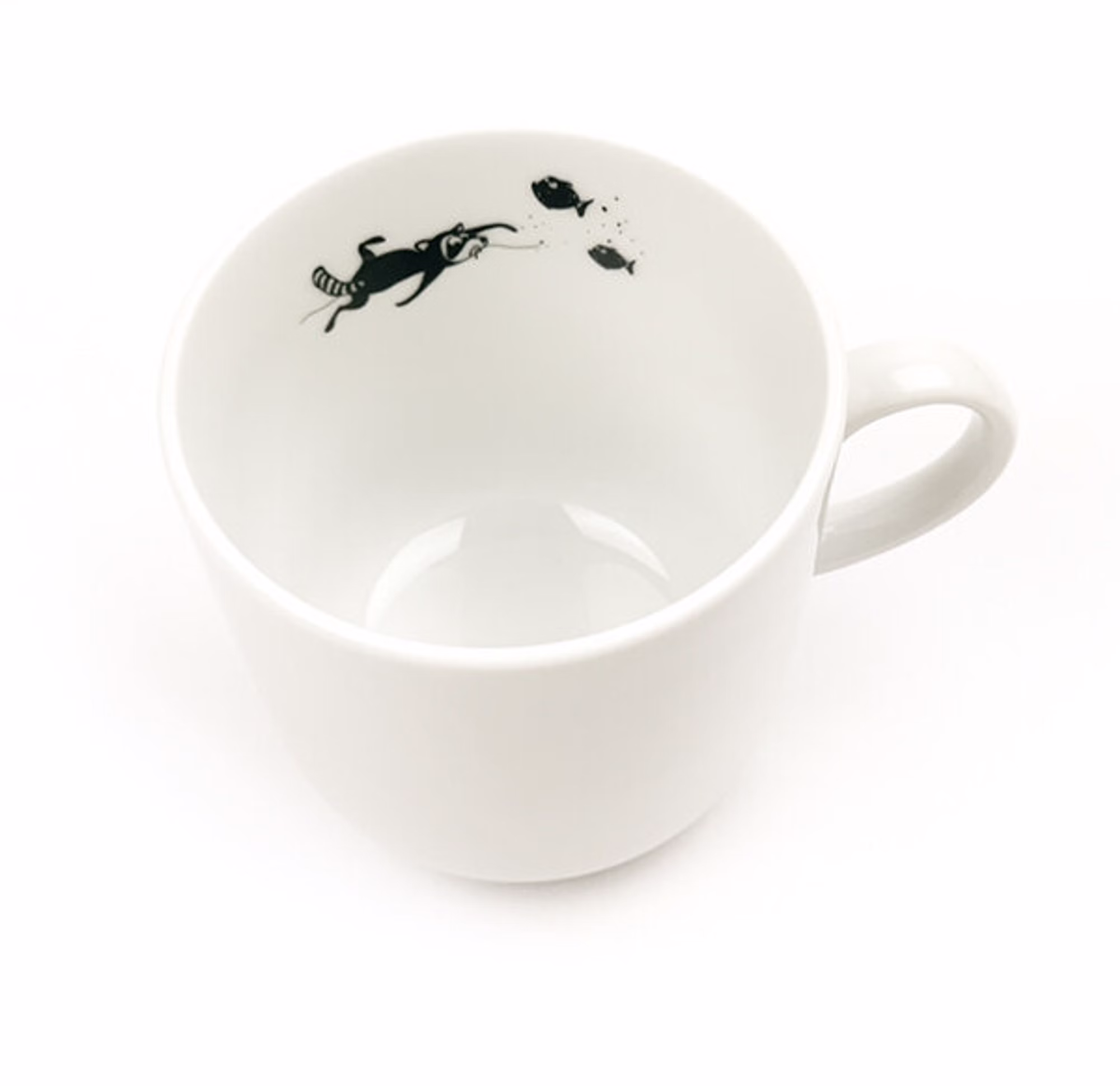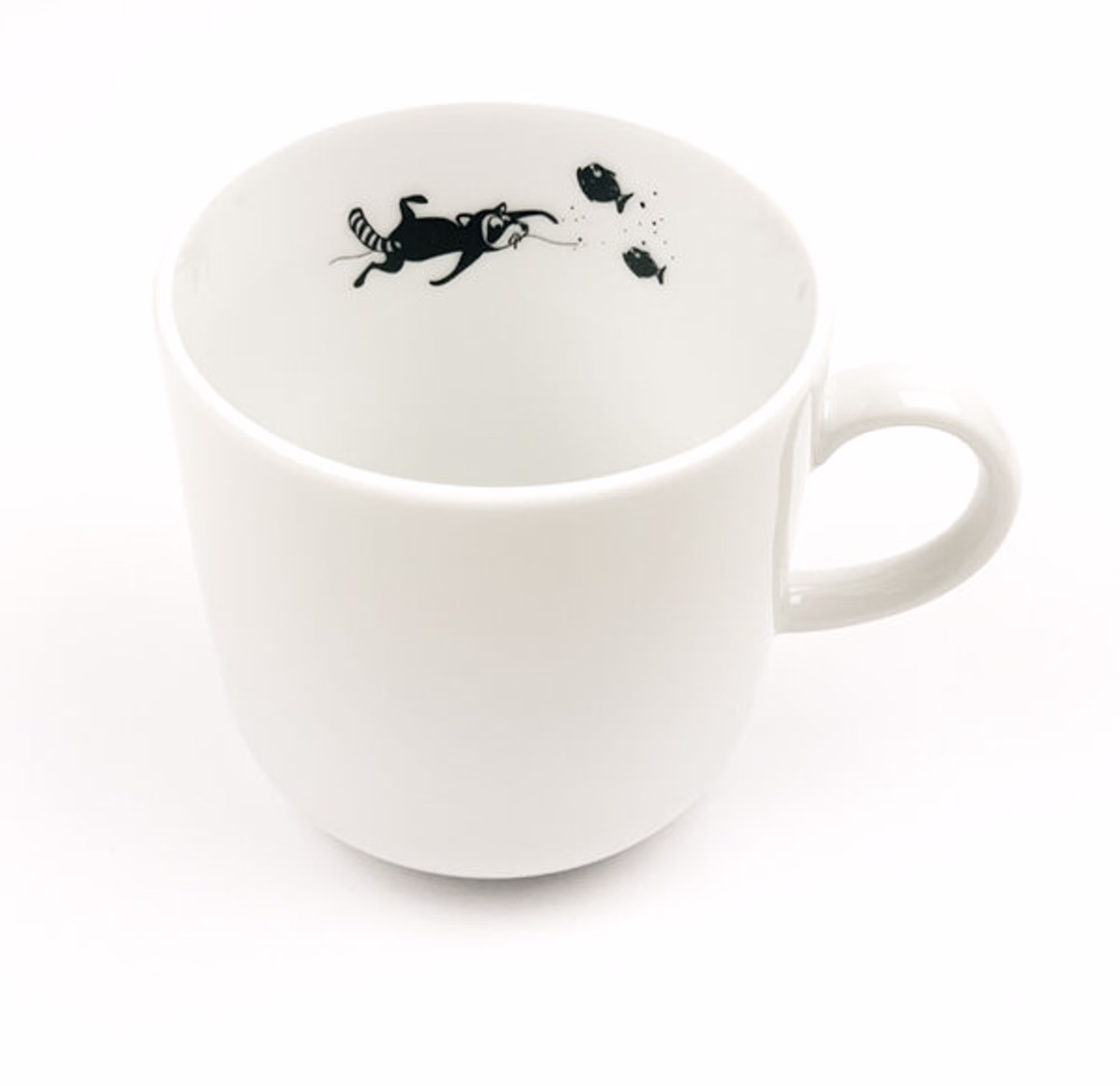 Im Inneren schwimmt Waschbär Mats entspannt mit den Fischen – ein charmantes Motiv mit liebevollem Detail. Die Tasse liegt angenehm in der Hand, ist spülmaschinengeeignet und damit perfekt für den täglichen Einsatz.