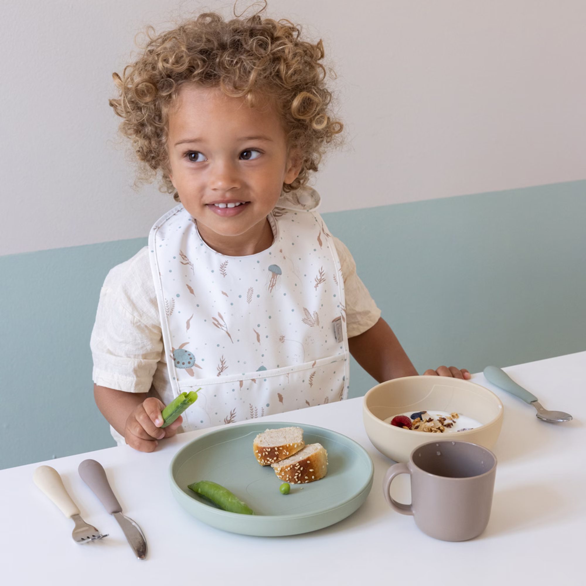 Hübschs und praktische, abwischbare Lätzchen mit Tasche. Ein alltägliches Must-Have für die etwas chaotischen Mahlzeiten. Wird in einem Zweier-Set mit zwei Lätzchen geliefert, einem bedruckten und einem einfarbigen. Das Lätzchen kann mit 3 Druckknöpfen in der Größe angepasst werden.