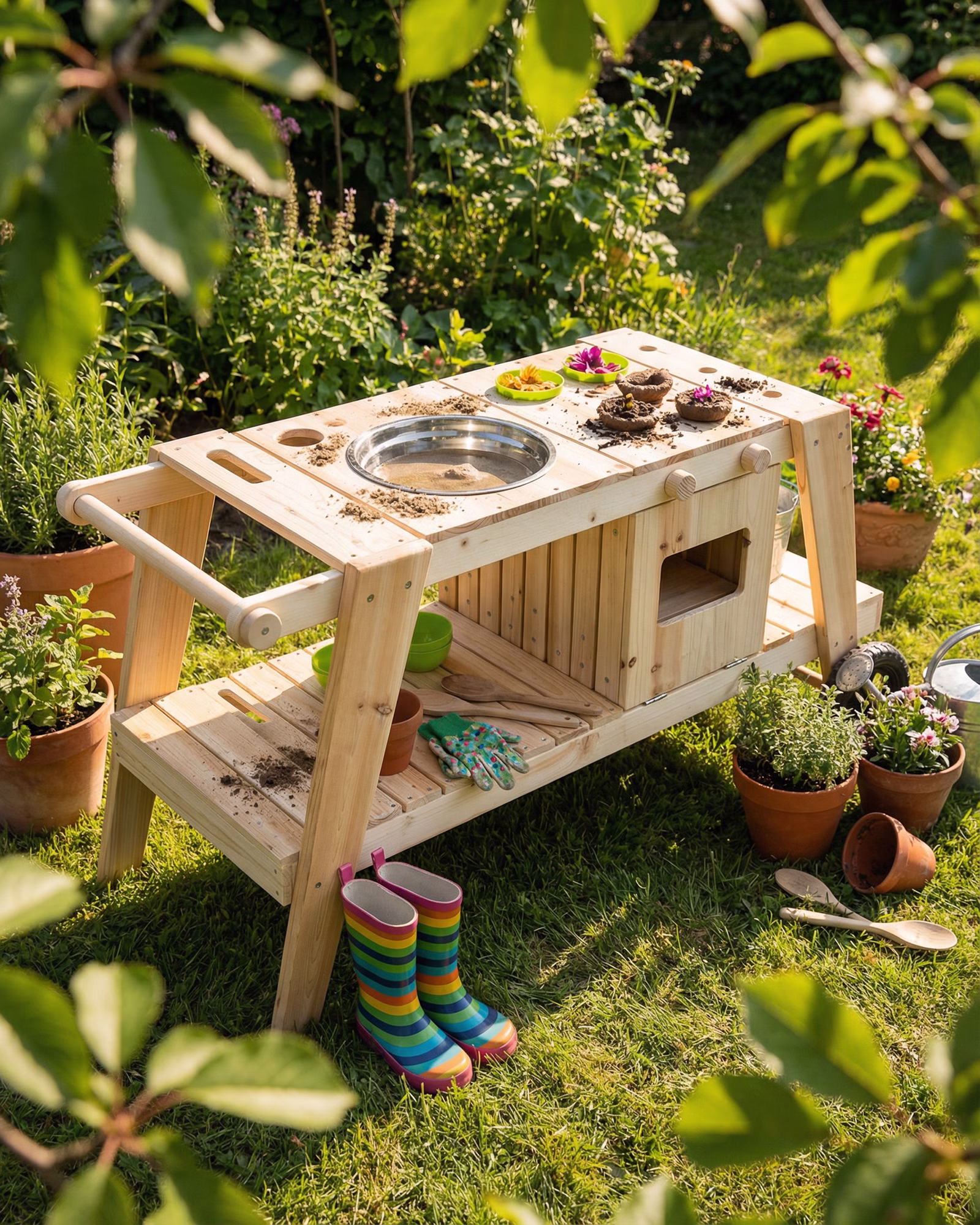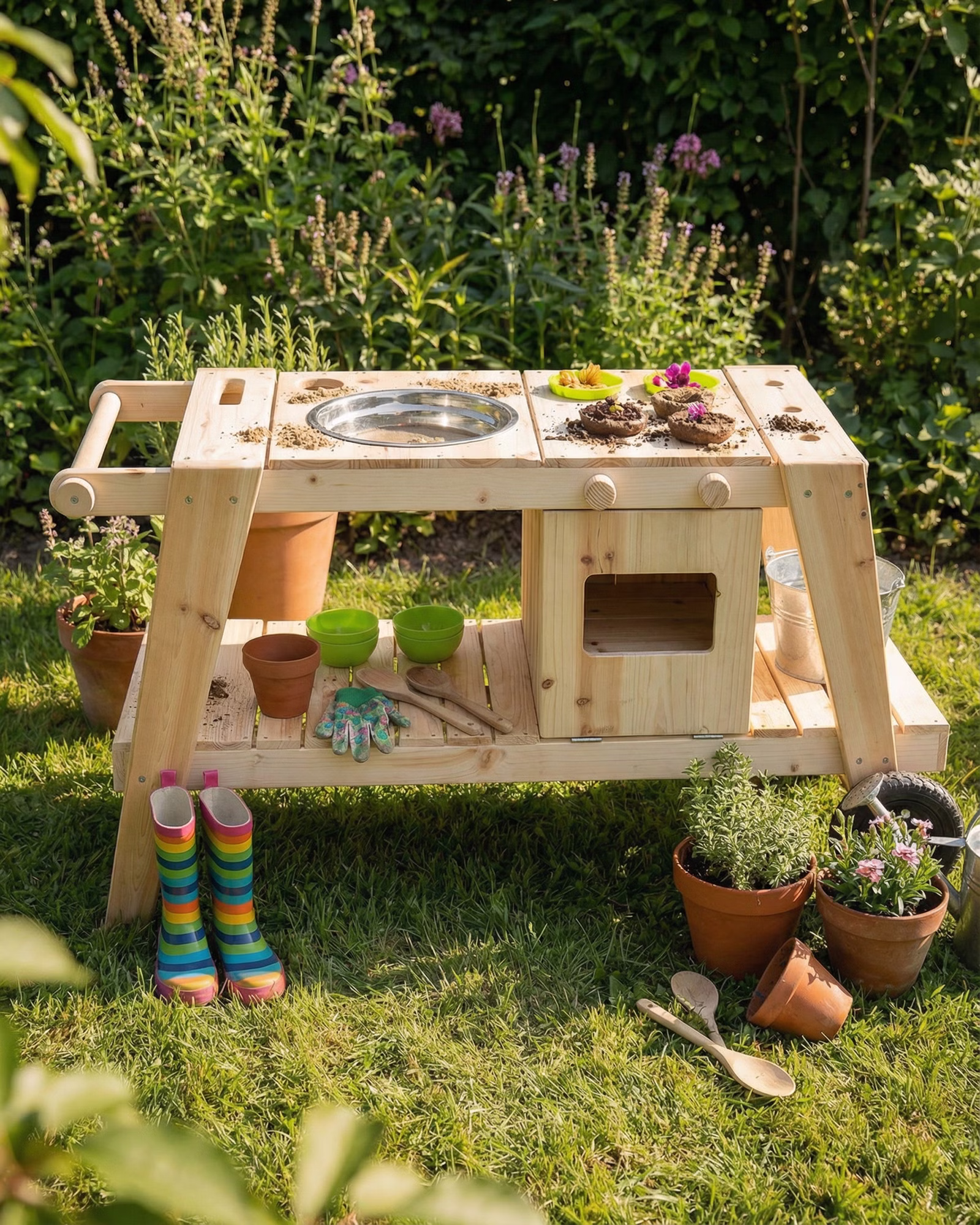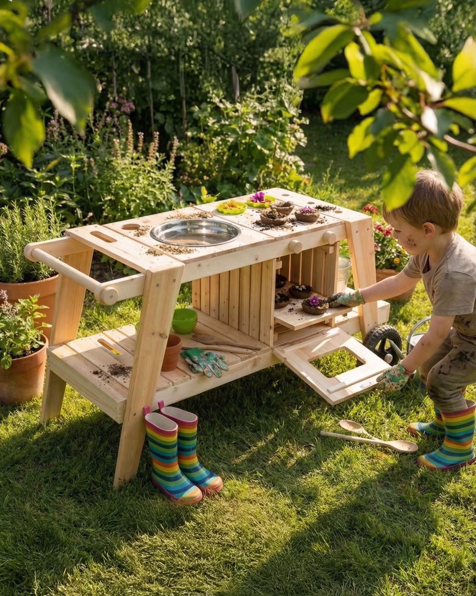 Diese massive, witterungsbeständige und modern gestaltete Matschküche aus unbehandeltem Massivholz ist der neue Star im Garten und auf dem Balkon! Von allen vier Seiten bespielbar, bietet sie als Outdoorküche mehreren Kindern Platz für kreatives Spiel. Einzigartig: Dank unkaputtbarer Räder lässt sie sich nach Herzenslust verschieben! Ein Backofen, dessen zwei Drehknöpfe ein „Klickgeräusch“ machen, eine große Matschschüssel, zwei Matschtöpfchen und zwei Pflanztöpfe aus Metall sowie Aussparungen, Langlöcher, Haken und Staufläche für die Ordnung von Gartengeräten, Kochequipment und Matschutensilien machen die außergewöhnliche „Sommerküche“ komplett! Diese Matschküche lädt Kinder ein, nach Herzenslust zu matschen. Ein besonderes Spielhighlight stellt der Backofen dar! Für das Einschieben des „Backblechs“ verfügt er über zwei vormontierte Leisten. Die Backofentür kann durch das Hineingreifen in die Aussparung komplett geöffnet werden. Ein Magnetschnapper sorgt für ein sicheres Schließen der Tür. Die zwei Pflanztöpfe können nicht nur zum Matschen verwendet werden, sondern auch mit Blumen, Kräutern und vielem mehr bepflanzt werden oder dienen als Sammelbehälter. Auch die beiden kleinen Töpfe in der oberen Fläche sind zum Organisieren von kleineren Teilen nutzbar. Langes Gartenwerkzeug kann mit Hilfe der Langlöcher durch zwei Ebenen sicher verstaut werden. Für eine langlebige Nutzung kann das unbehandelte Holz mit einer Holzschutzlasur farblich an die eigenen Bedürfnisse angepasst werden.