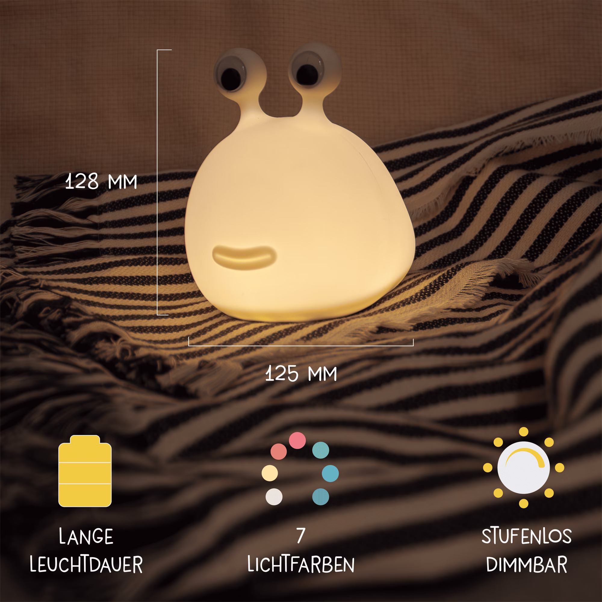 Das Nachtlicht „MOMO MOON“ vereint Funktionalität und Design auf besondere Weise. Entwickelt, um Kindern beim Einschlafen zu helfen, spendet es ein warmes, schlaffreundliches Licht, das durch einfaches Zusammendrücken der „Äuglein“ ein- oder ausgeschaltet sowie gedimmt werden kann.