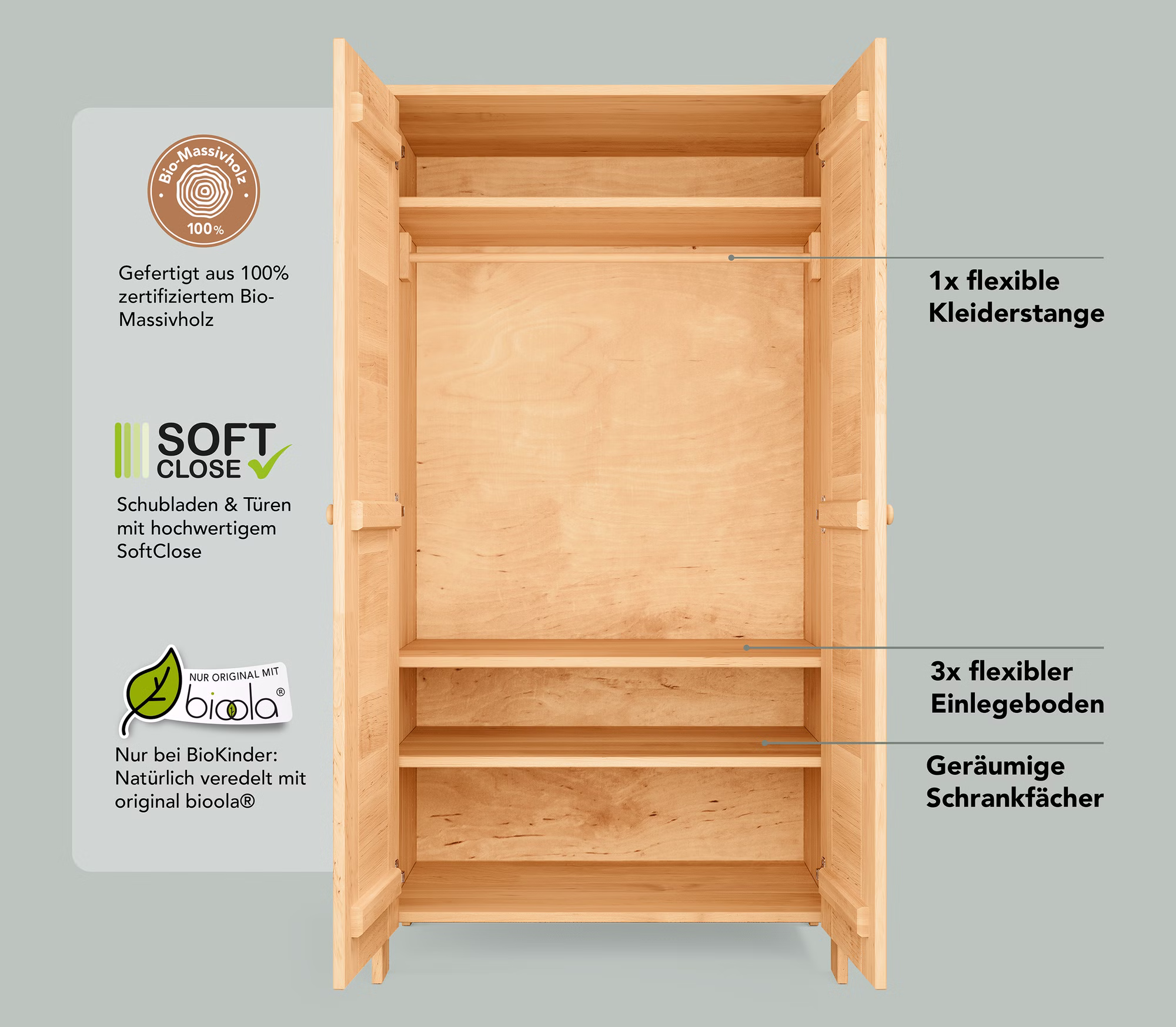 • Kinderkleiderschrank Niklas: Inkl. Kleiderstange und 3 flexiblen Einlegeböden, hochwertige Scharniere, Vollholz-Griffe, zusätzliche Einlegeböden (Artikel Nr. 22928) erhältlich