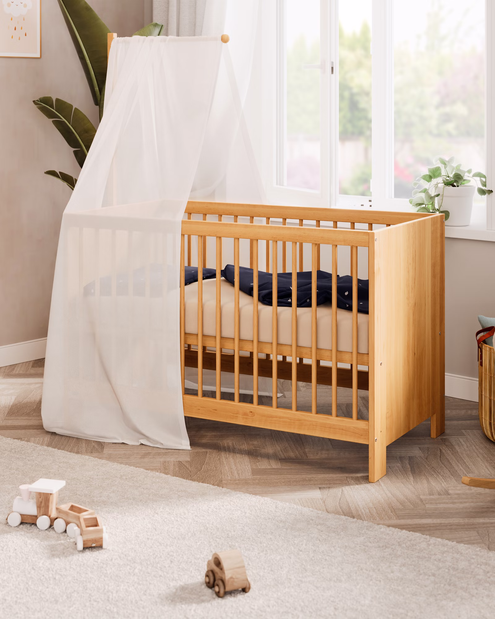 Ideal fürs kleinere Kinderzimmer und Elternschlafzimmer: Das BioKinder Niklas Babybett mit Liegefläche 60 x 120 cm aus Bio-Massivholz.