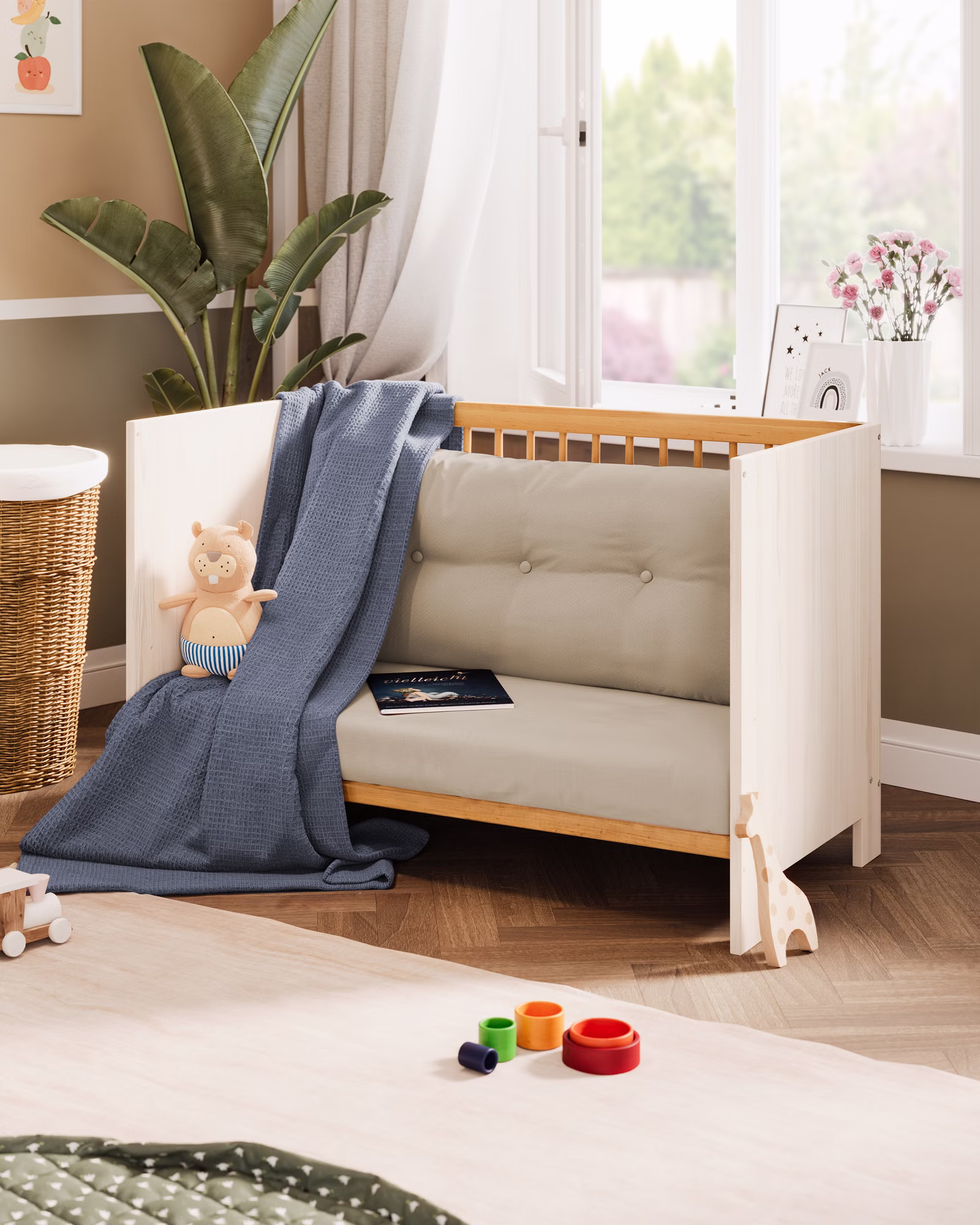 • Mitwachsend zum offenen Kinderbett durch Entfernen einer Gitterbettseite