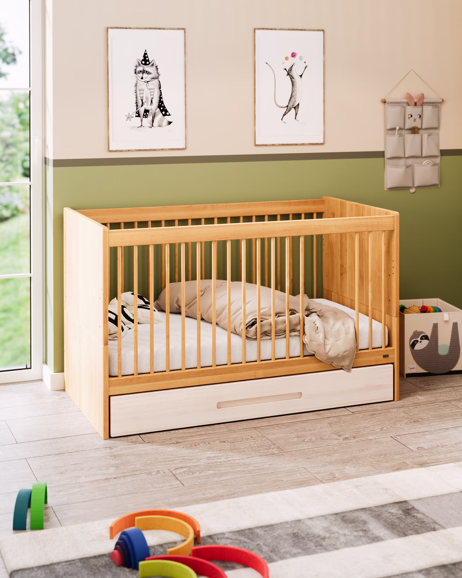 Unser formschönes Lina Babybett ist aus biologischem Massivholz gefertigt und fügt sich dank der praktischen Details ideal in jedes Baby- und Kinderzimmer ein.
