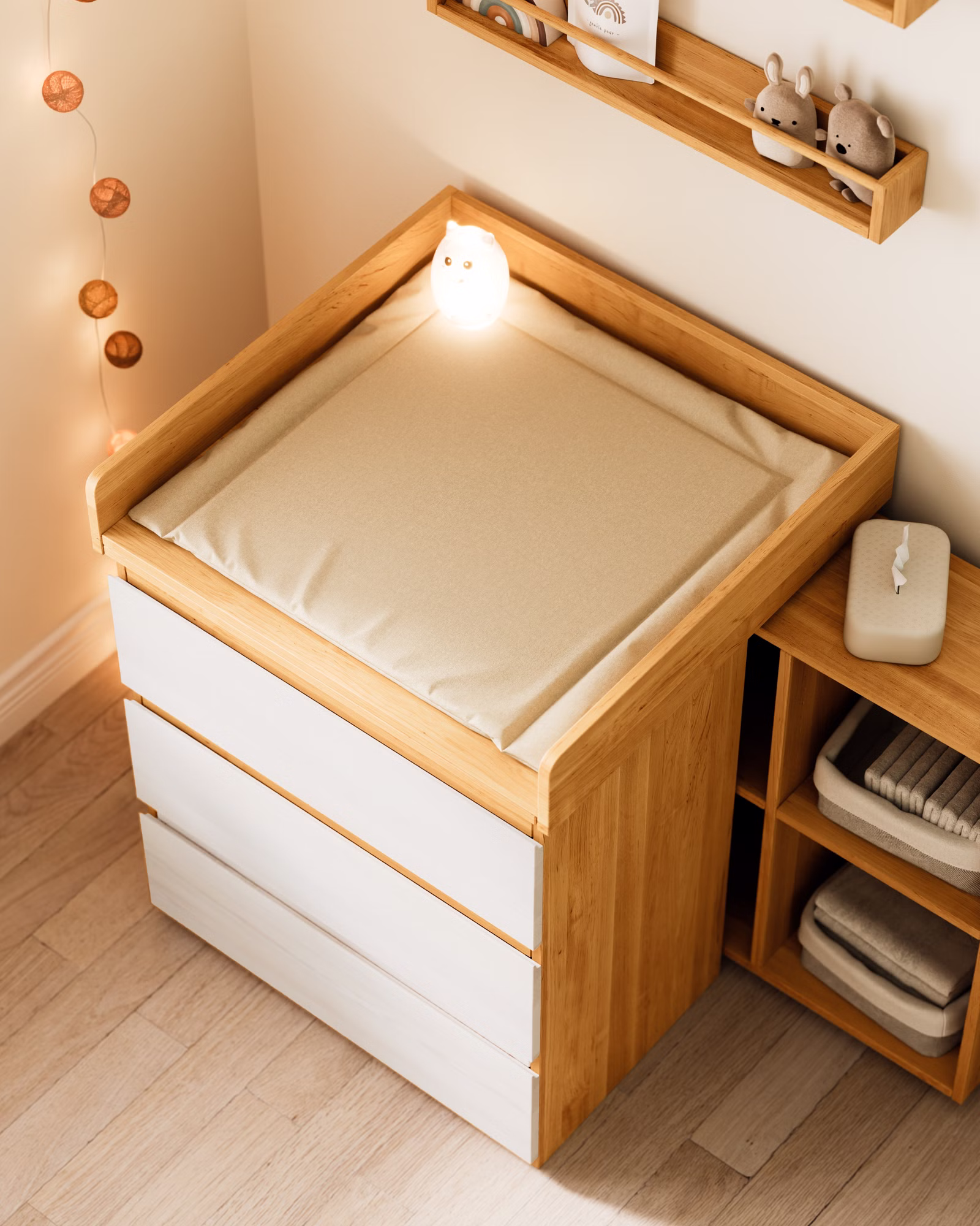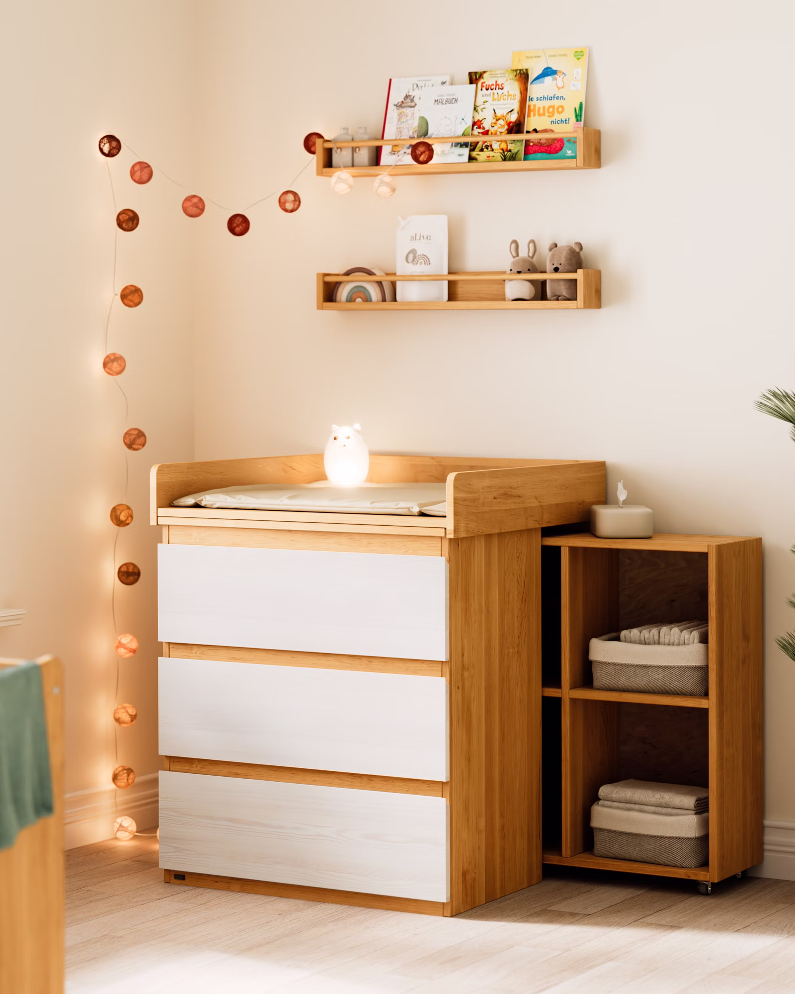 Die Wickelkommode dient zunächst zum Wickeln und kann später mühelos in ein vielseitiges Möbelstück für das Kinderzimmer umgewandelt werden, um Kleidung, Spielzeug und mehr aufzubewahren.