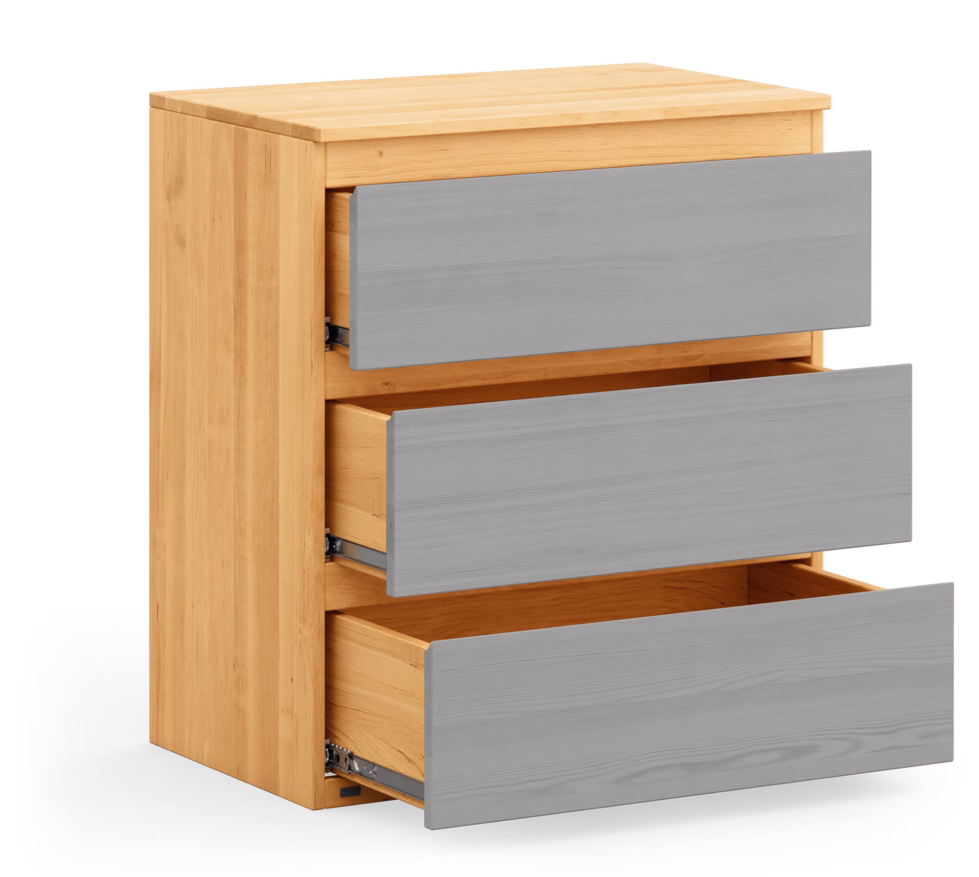 Die drei Schubladen mit kugelgelagerten Leichtlaufschienen und Vollauszug bieten genügend Stauraum und ermöglichen einen Einblick bis in den hintersten Teil der Schublade. Die stabilen Schubladen sind aus ganzen Massivholzplatten und somit bruchsicher.