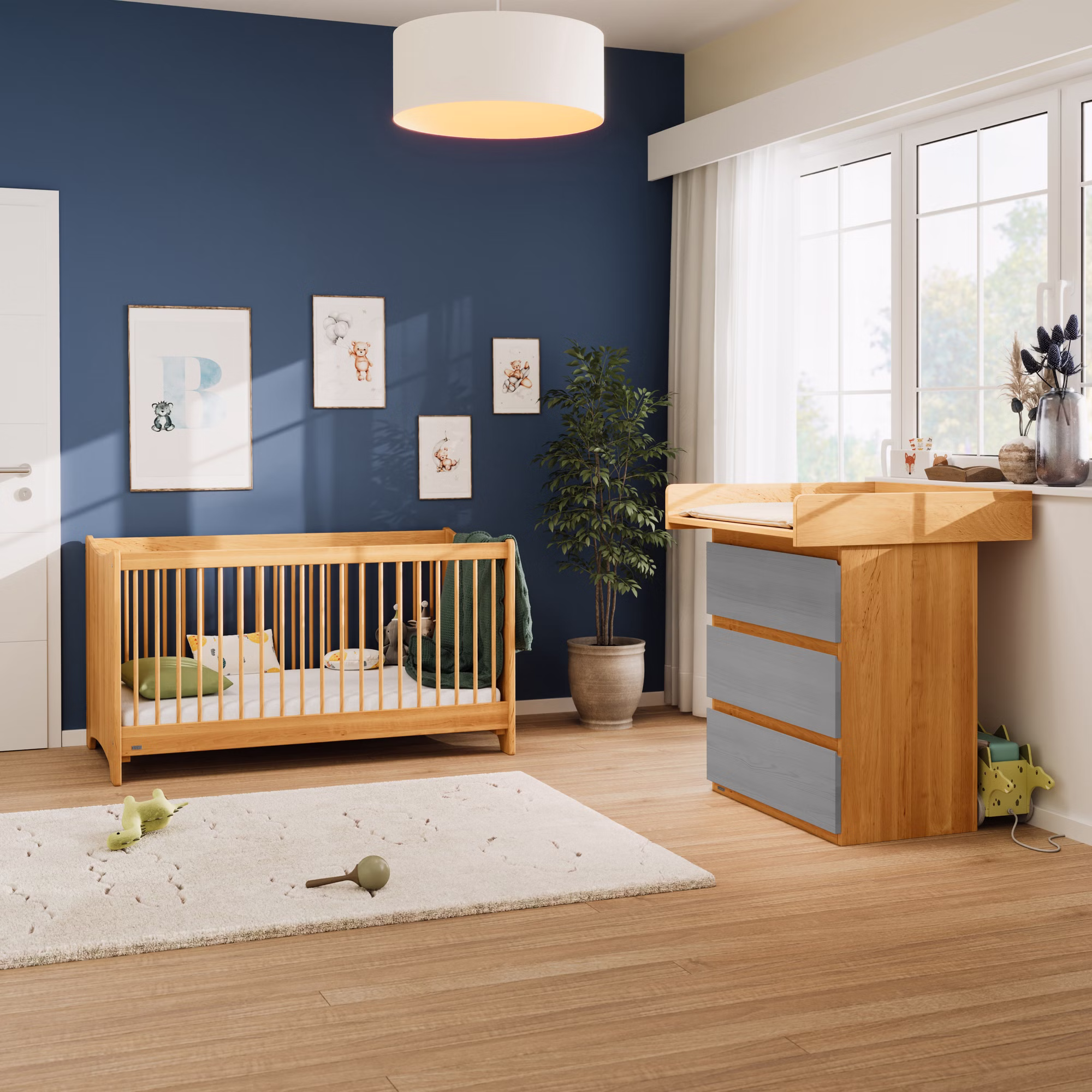 Mit unserer Wickelkommode Finn ist Staufläche kein Problem mehr. Egal ob im Schlafzimmer, Babyzimmer oder auch im Wohnzimmer, unserer Kommode aus Massivholz macht in jedem Zimmer eine gute Figur. Das geradlinige Design der Kommode fügt sich problemlos in jede Zimmereinrichtung und besticht durch die schöne Maserung des Holzes auf den breiten Fronten.