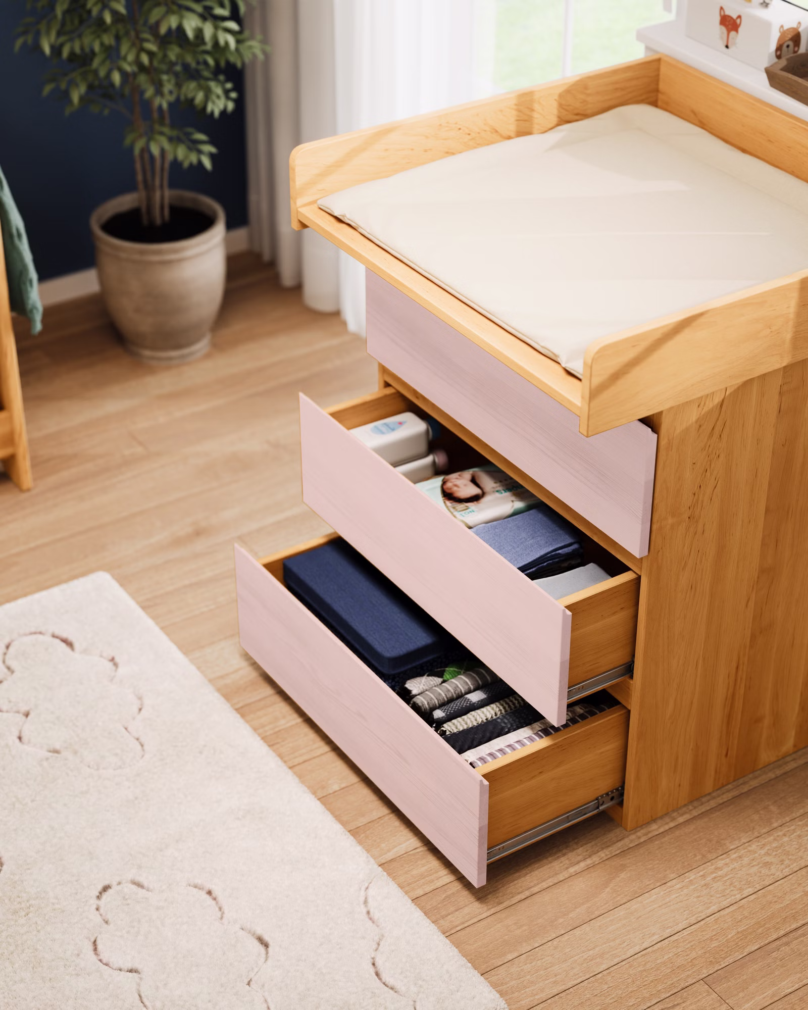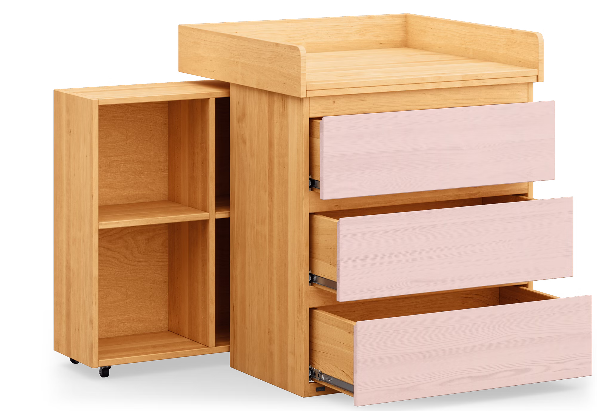 Die Wickelkommode dient zunächst zum Wickeln und kann später mühelos in ein vielseitiges Möbelstück für das Kinderzimmer umgewandelt werden, um Kleidung, Spielzeug und mehr aufzubewahren.