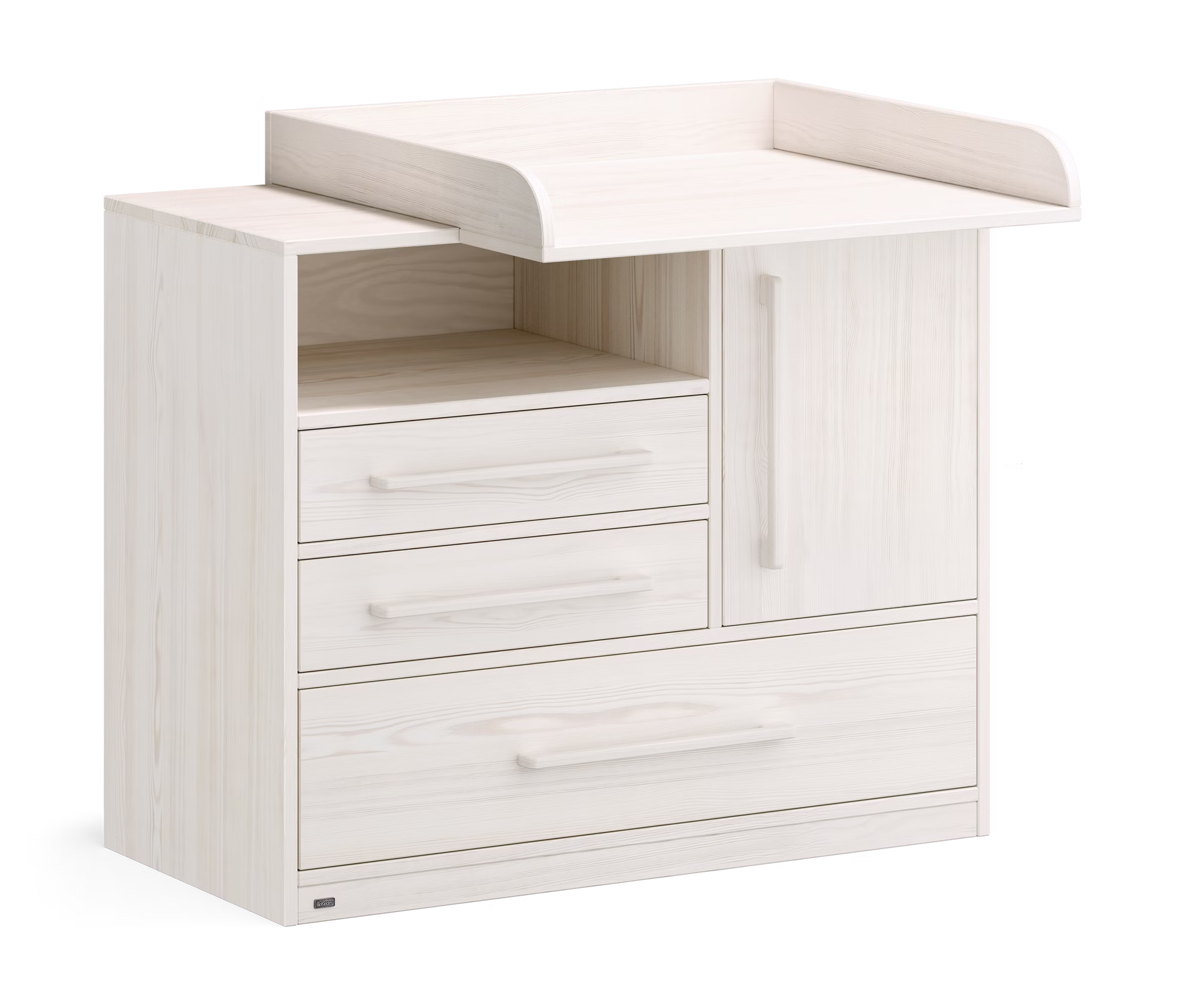 Dank der praktischen Scharniere wird die Tür des Schrankfachs beim Schließen gedämpft und verhindert so das Einklemmen von Kinderhänden. Das große offenen Fach direkt unterhalb der Wickelfläche ermöglicht einen schnellen, direkten Zugriff auf Windeln und weitere Gegenstände.