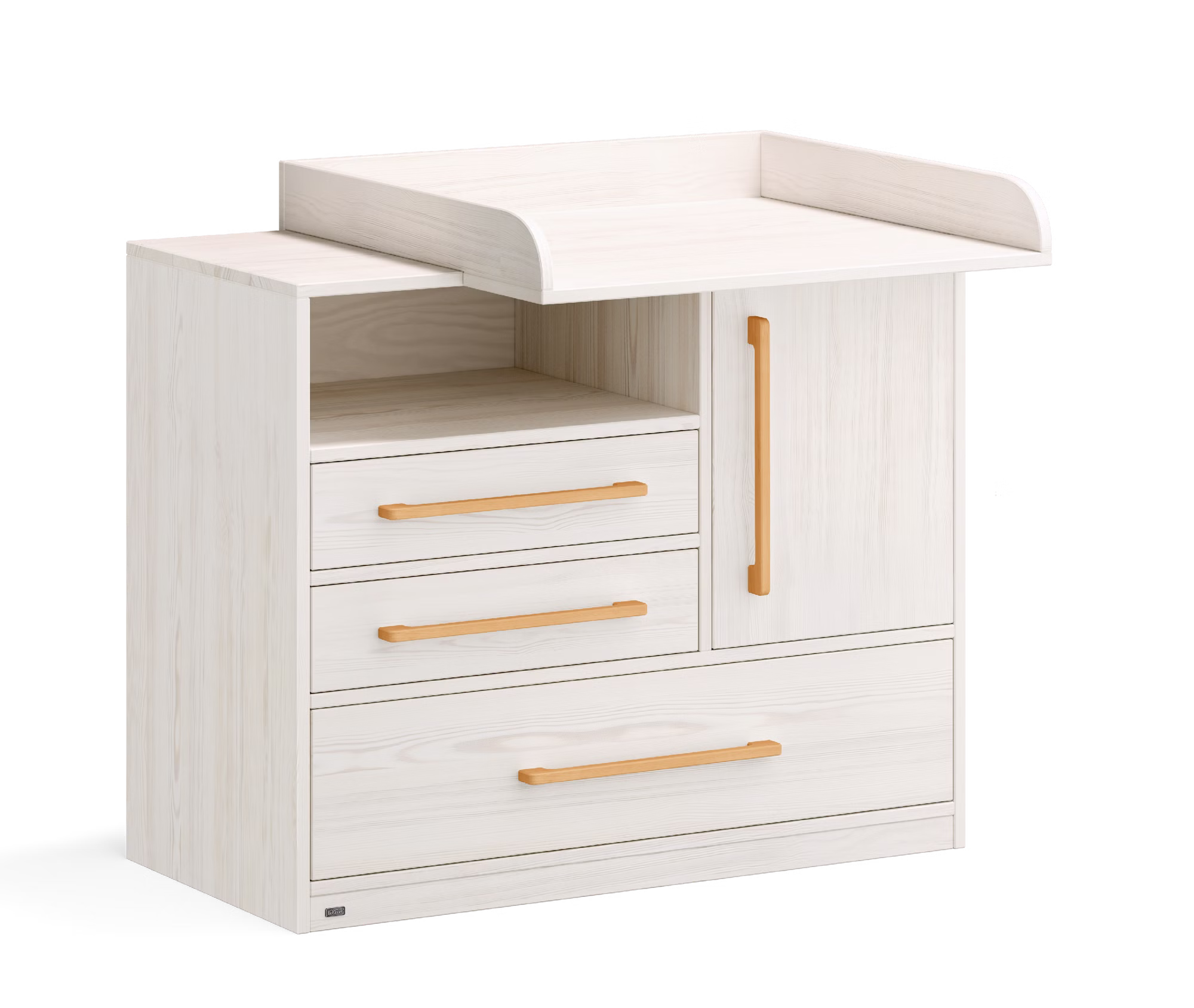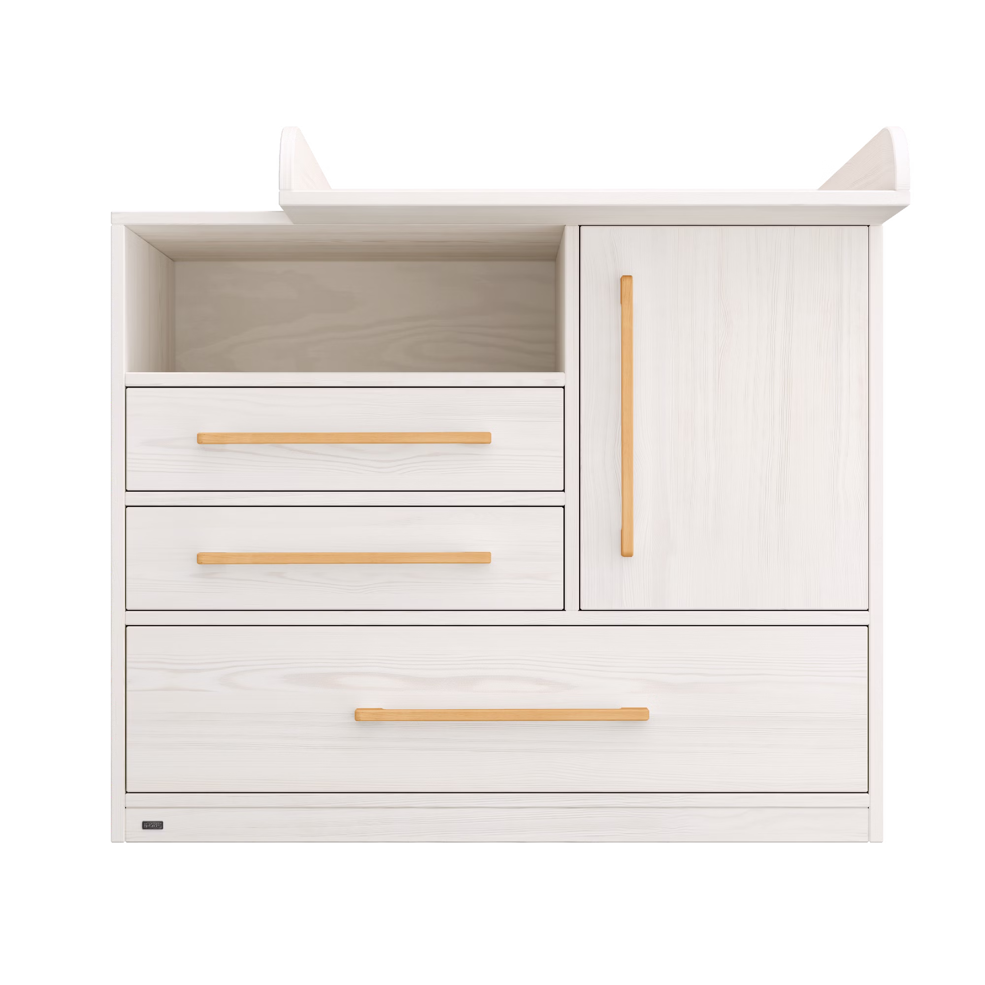 Für die Zeit nach dem Wickelalter lässt sich der Wickelaufsatz einfach abnehmen und Henry fügt sich als vollwertiges Möbelstück harmonisch in jede Kinderzimmereinrichtung ein. Die eleganten Griffe und das geometrische Design sorgen dabei für einen zeitlosen Charme.