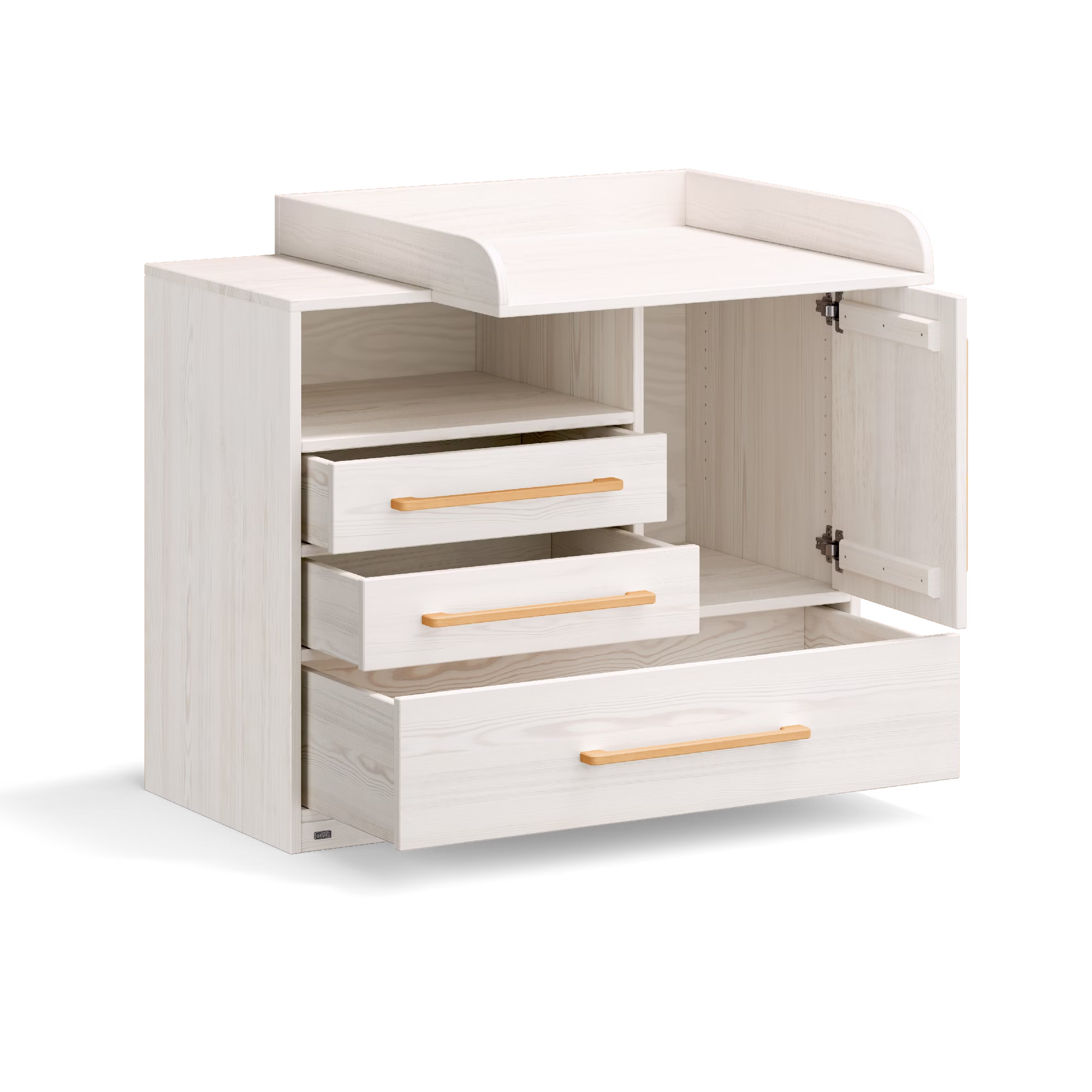 Unsere Henry Wickelkommode ist wandelbar und bietet viel Platz für Wickel- und Pflegeutensilien. Die drei geräumigen Schubladen sind mit kugelgelagerten Leichtlaufschienen mit Selbsteinzug und Soft-Close-Mechanismus für ein sicheres und geräuscharmes Schließen ausgestattet. Zudem lassen sie sich voll ausziehen und bieten so Einblicke bis in den hintersten Bereich der Schublade.