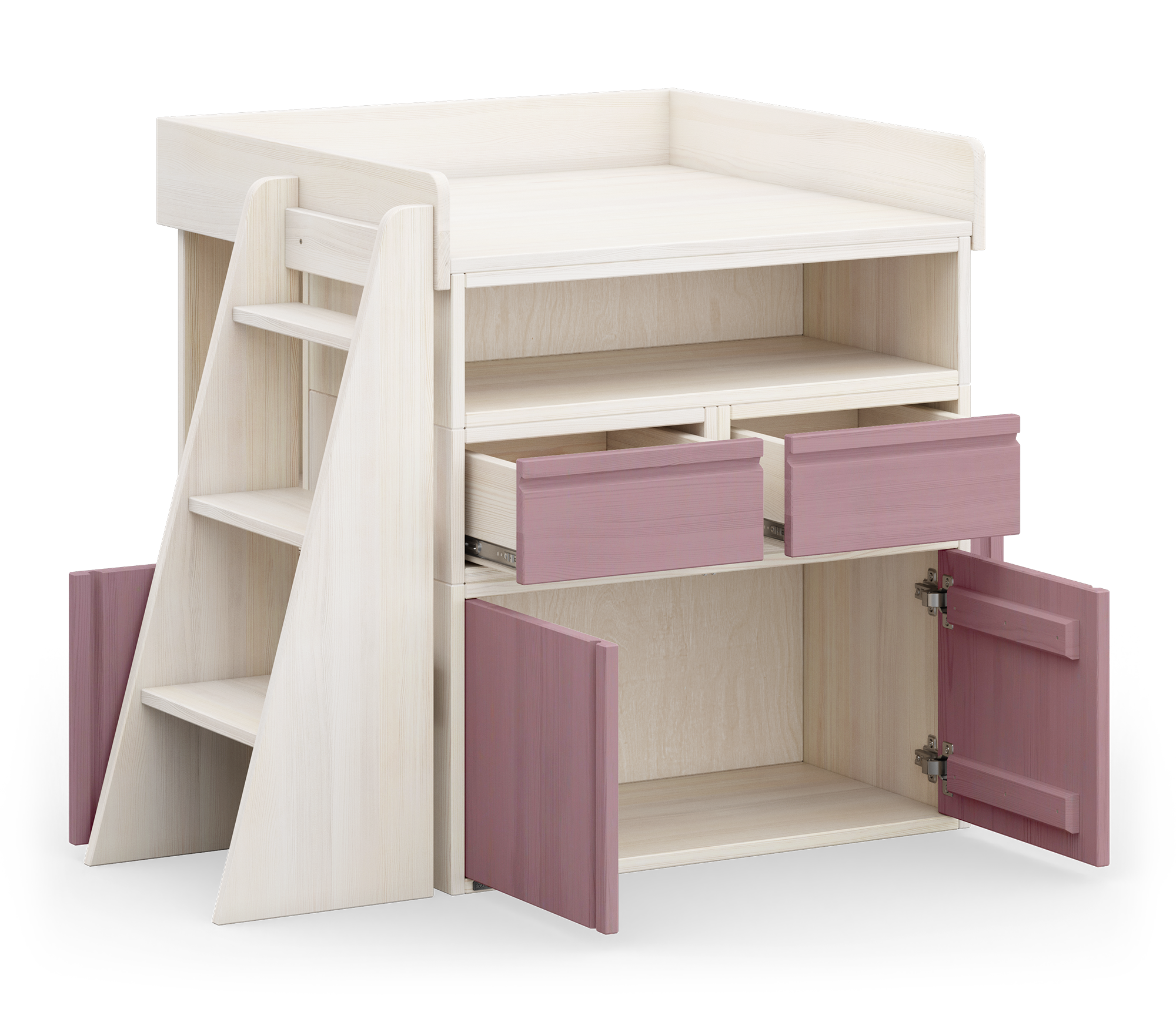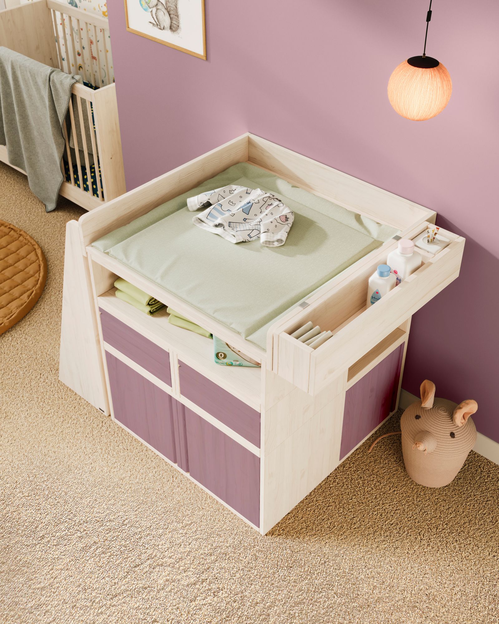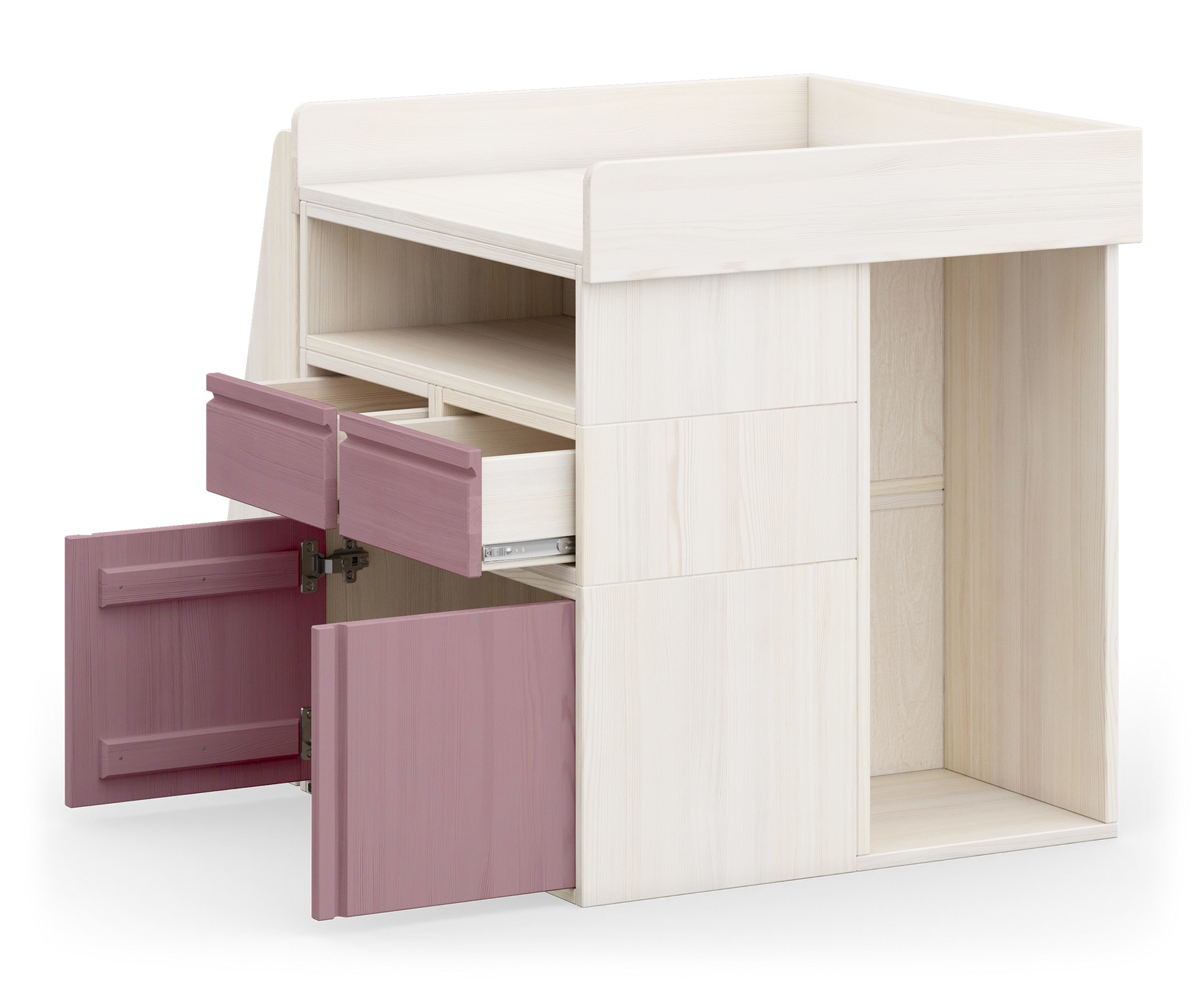 Die acht Laura Elemente dieses praktischen Sets lassen sich zu einem individuellen Wickeltisch zusammenfügen, der immer wieder neu gestaltet werden kann. Der formschöne und ergonomische Wickeltisch ist dabei gleichzeitig rückenschonend und geräumig, sodass sich Wickelutensilien und Kleidung bequem verstauen lassen. Die offenen Regalwürfel bieten zudem einen schnellen und direkten Zugriff auf die wichtigsten Gegenstände. Die elegant gefrästen Griffmulden der Türen und Schubladen ermöglichen ein leichtes Öffnen und Schließen und machen das Set auch optisch zu einem echten Blickfang.
