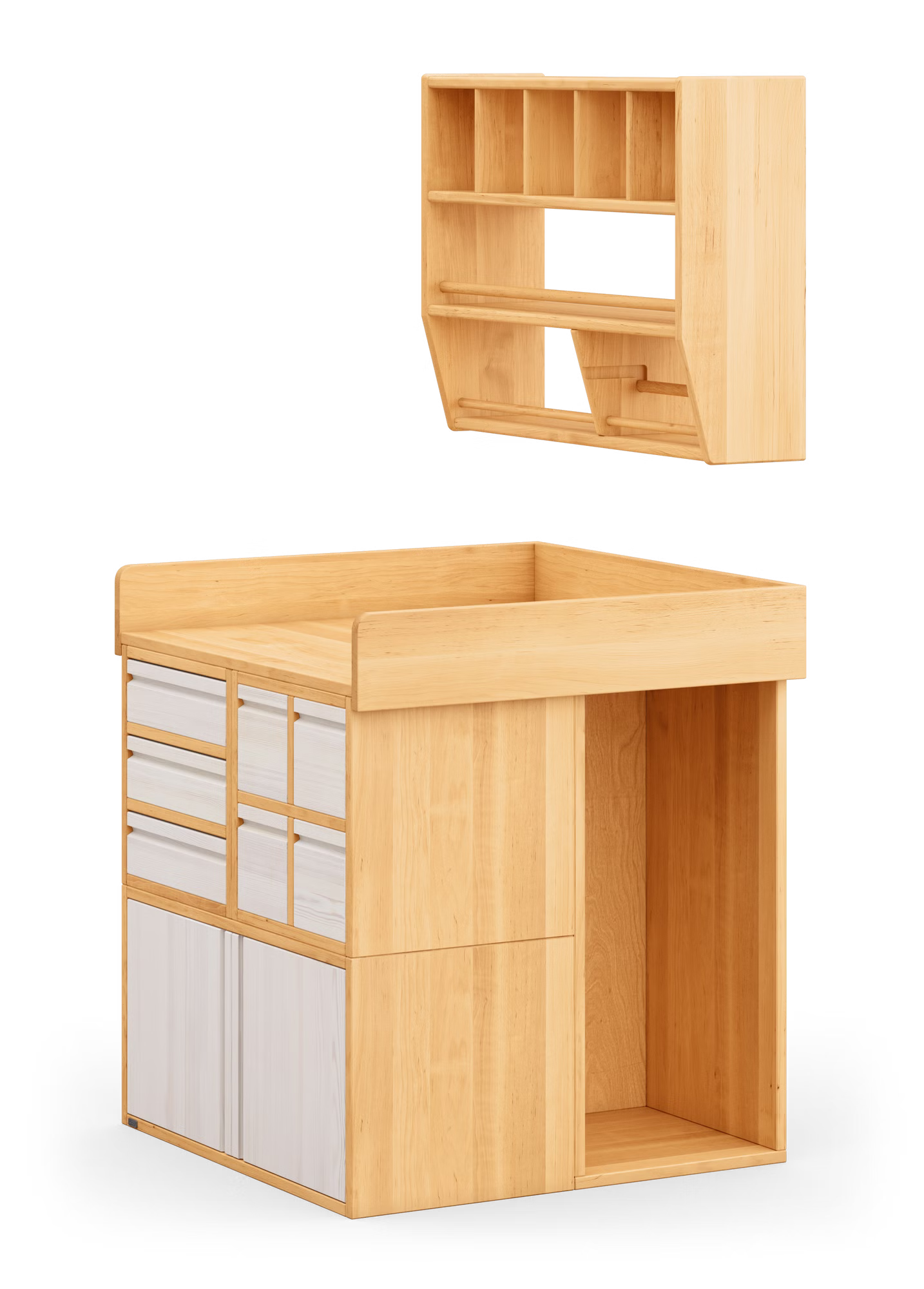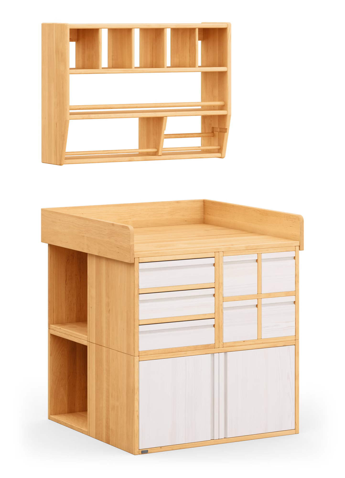 Der Wickeltisch aus verschiedenen Laura Elementen. Nach der Wickelzeit gestalten Sie aus den Lauras ein anderes Möbel, ganz nach Bedarf und Geschmack. Das Robin Hängeregal macht sich dann gut als nostalgischer Ordnungshelfer oder Küchenregal.