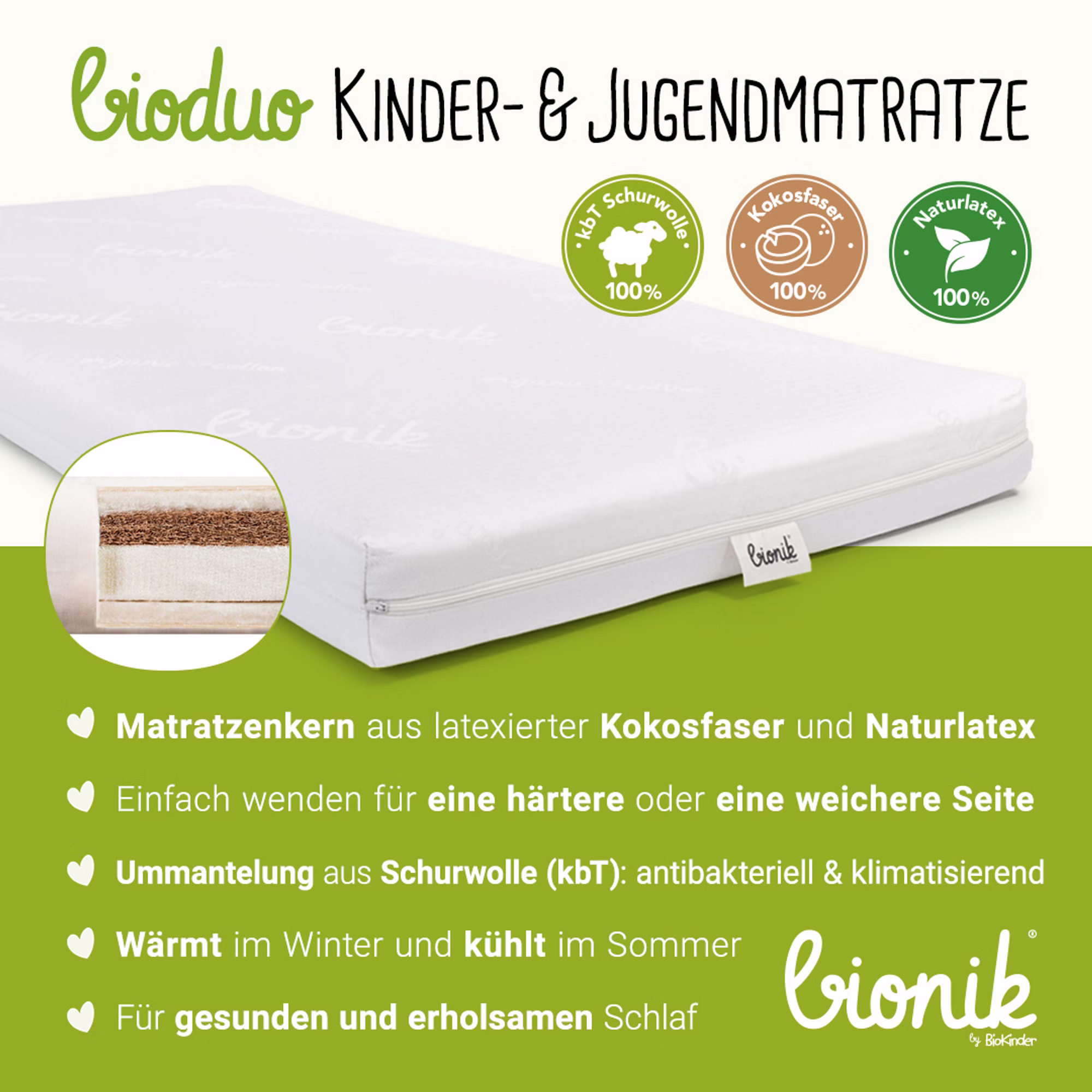 Die bionik Bioduo Kinder- und Jugendmatratze mit einem Kern aus 5 cm latexierter Kokosfaser und 5 cm Naturlatex ist zum Wenden und bietet Kindern und Heranwachsenden die Option einer härteren und einer weicheren Seite, ganz nach Alter und persönlicher Vorliebe.