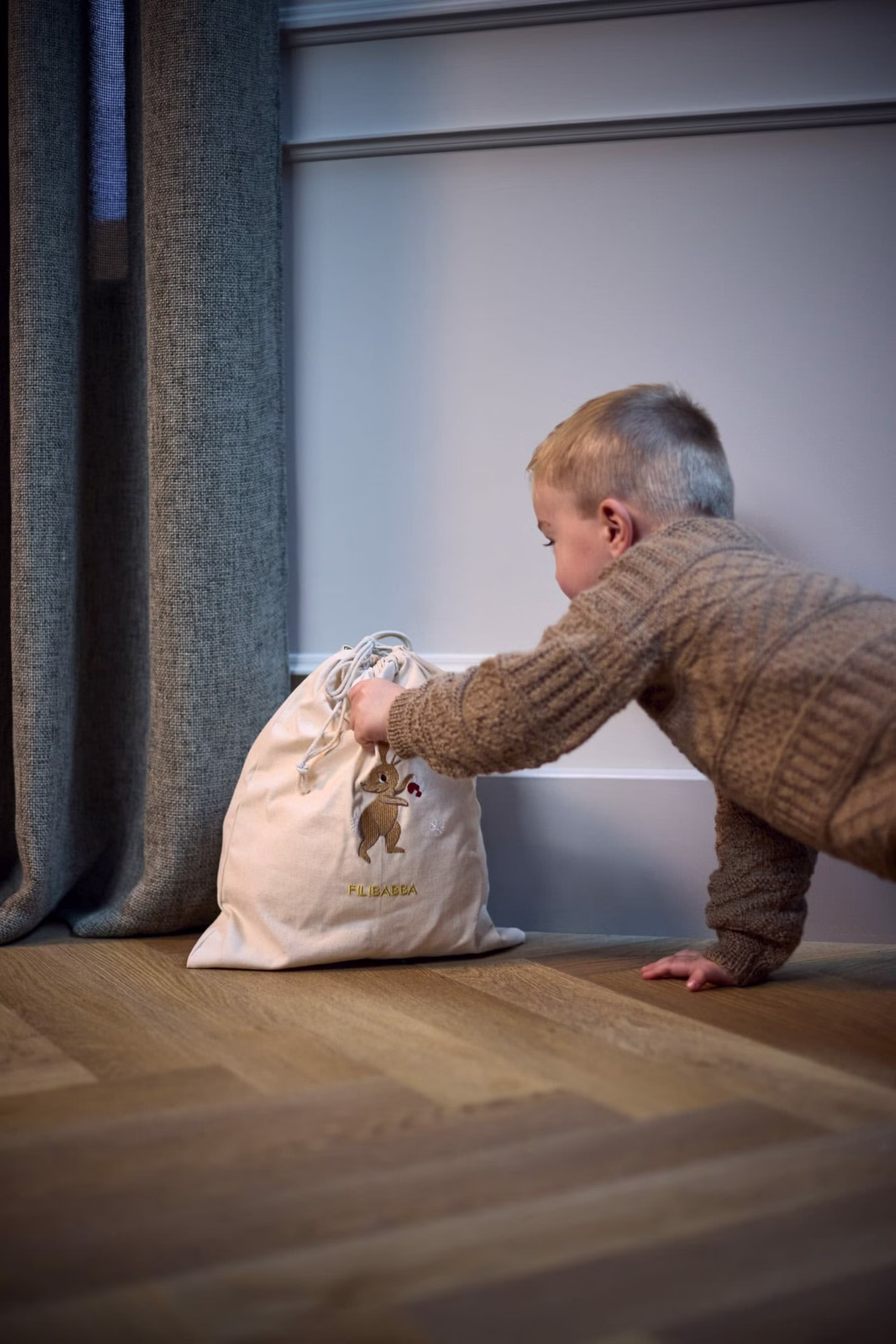 Der wunderschöne Geschenkbeutel besteht aus unbedruckter Bio-Baumwolle und ist mit filigranen Stickereien verziert. Ein Geschenkbeutel, der das Verpacken von Geschenken Jahr für Jahr sowohl gemütlich als auch stilvoll macht.