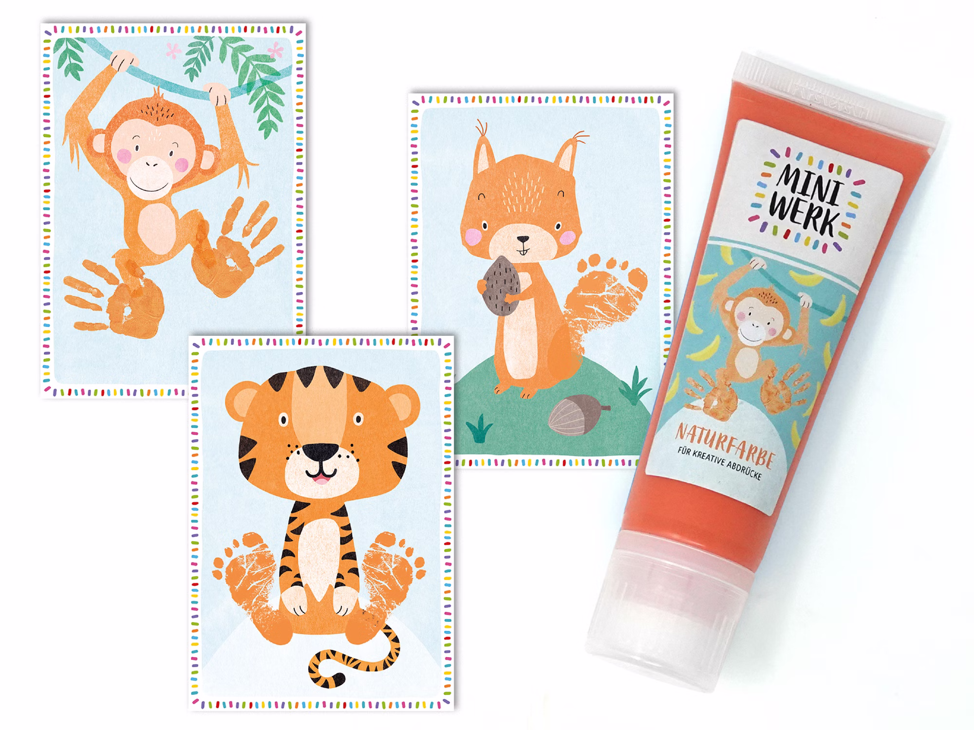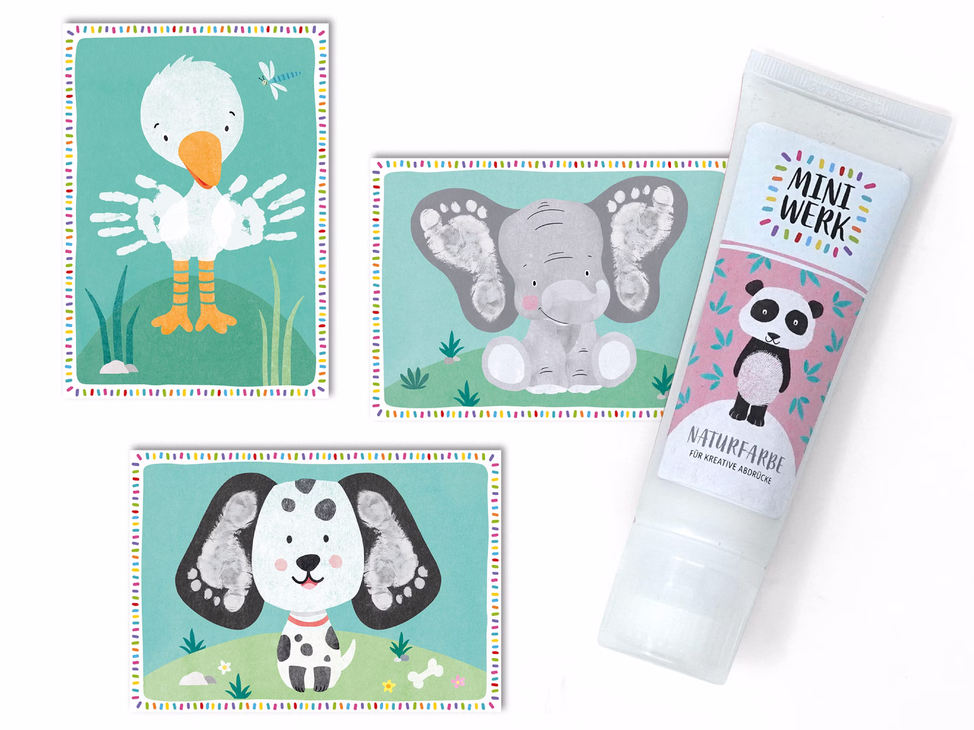 Das 3er Abdruckset, bestehend aus 3 Bio-Malfarben (blau, grün und weiß), (rosa, orange und weiß) Schwammaufsätzen und vielen passenden Tier-Motivkarten, bieten euch nicht nur die Möglichkeit Abdrücke zu gestalten, sondern auch jede Menge Mal-und Stempelspaß sowie freie Gestaltungsmöglichkeiten. Der Schwammaufsatz ermöglicht einfaches und gleichmäßiges Auftragen , um damit schöne Hand-, Fuß- und Fingerabdrücke zu kreieren oder freie Experimente, wie direktes Malen und Tupfen aus der Tube. Die beiliegenden Tiermotiv-Karten können dabei, je nach Motiv, mit Hand-, Fuß- oder Fingerabdrücken ergänzt werden und zu wunderschönen Erinnerungen ausgearbeitet werden.