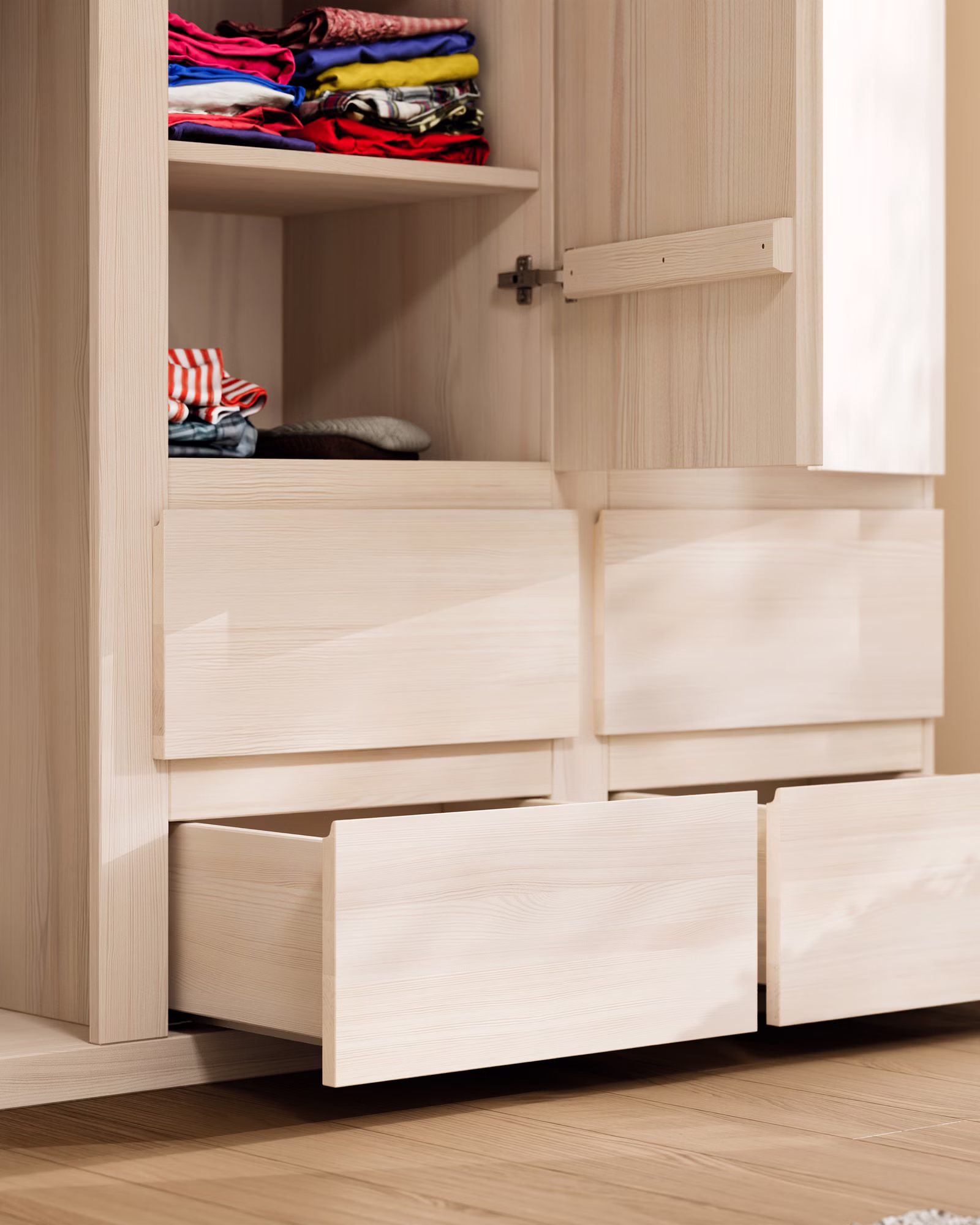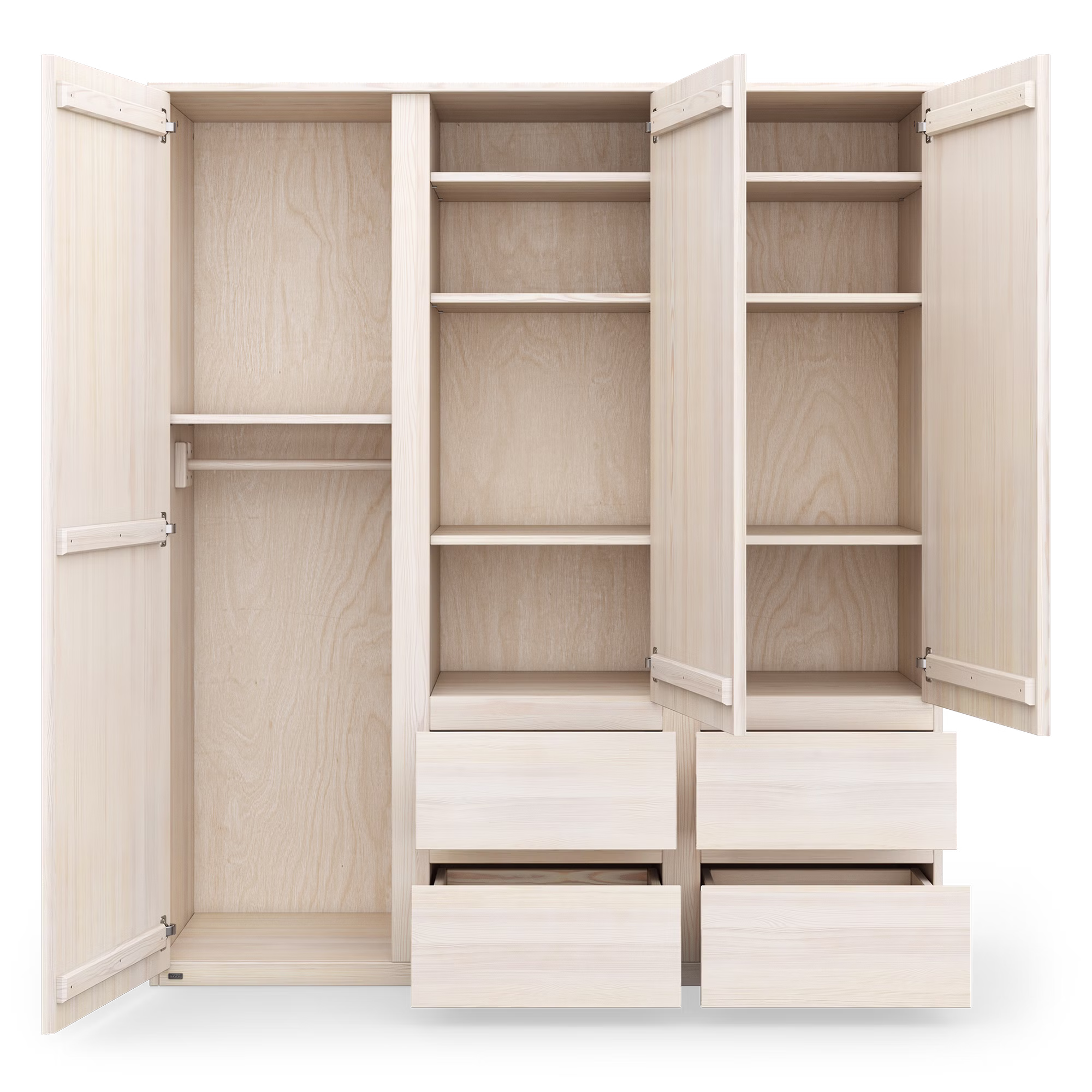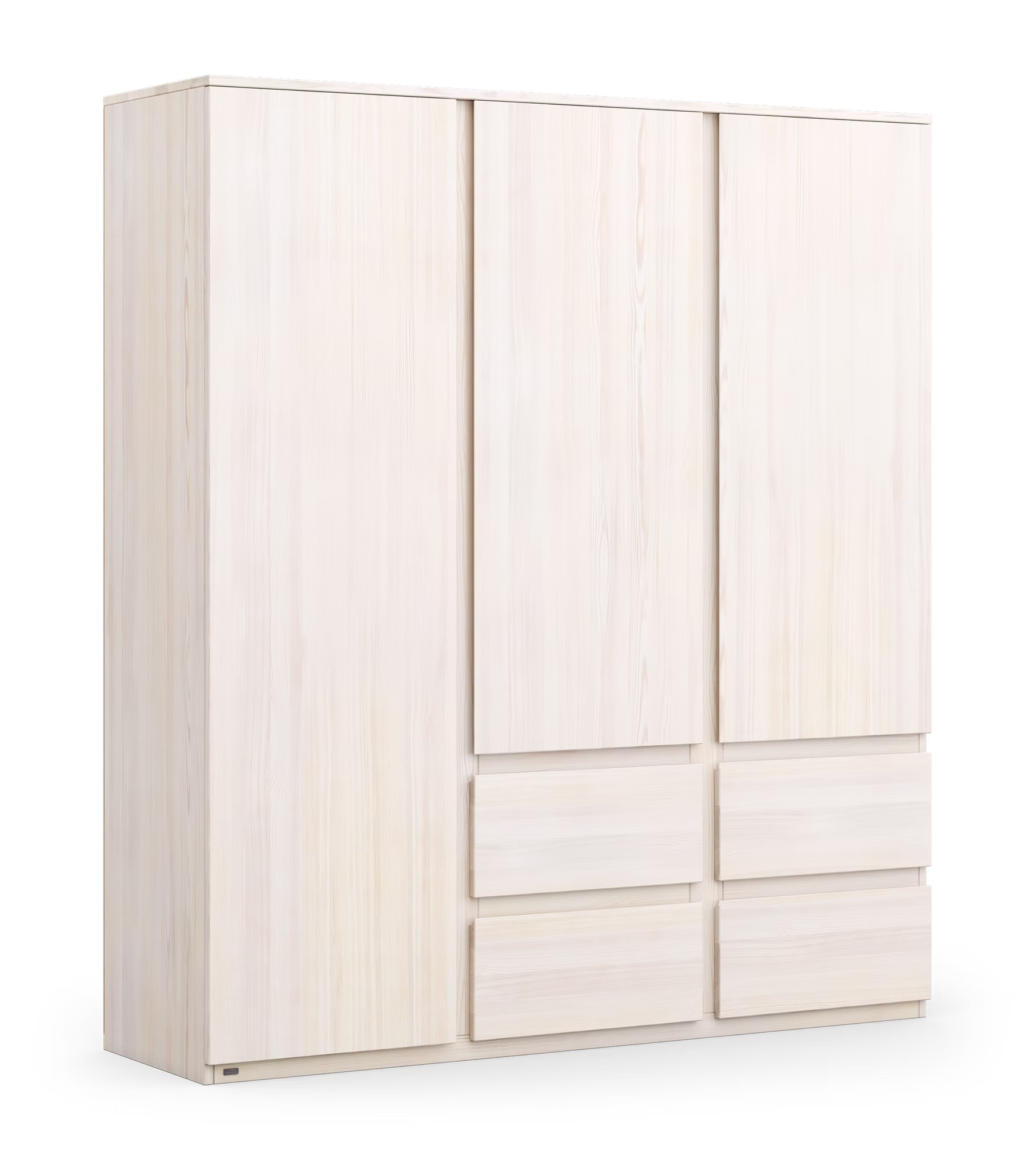 In der neuen, geräumigeren Variante mit drei Türen und vier Schubladen bietet der Schrank noch mehr Platz für Kleidung, Spielzeug und Alltagsgegenstände. Sieben Einlegeböden und eine Kleiderstange sorgen für eine flexible Innenaufteilung. Die Schubladen sind mit Leichtlaufschienen, Soft-Close und Vollauszug ausgestattet, sodass sie sich mühelos und geräuschlos öffnen und schließen lassen. Dank der Griffmulden sind Türen und Schubladen auch für kleine Kinderhände leicht zu bedienen.