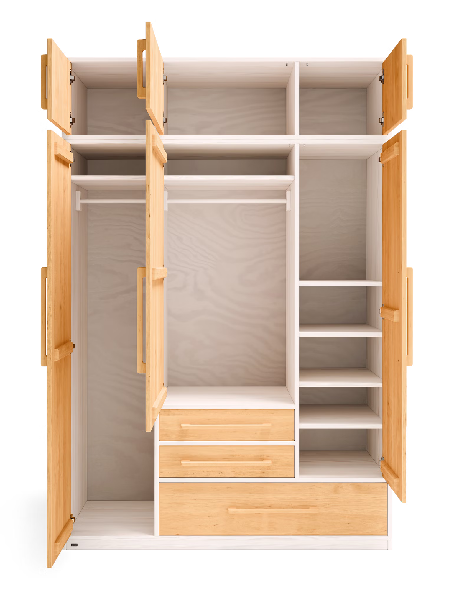 Zudem verfügt der Schrank im Mittelteil über ein großes Fach mit verstellbarer Kleiderstange und Einlegeboden. Die Seitenteile mit flexiblen Einlegeböden und Kleiderstange bieten weitere Ablage- und Aufbewahrungsflächen, sodass alles im Kleiderschrank einen Platz findet. Dabei lassen sich die schmalen Einlegeböden für das linke und rechte Fach, als auch der breite Einlegeboden für das Mittelteil frei und flexibel in der Höhe einsetzen.