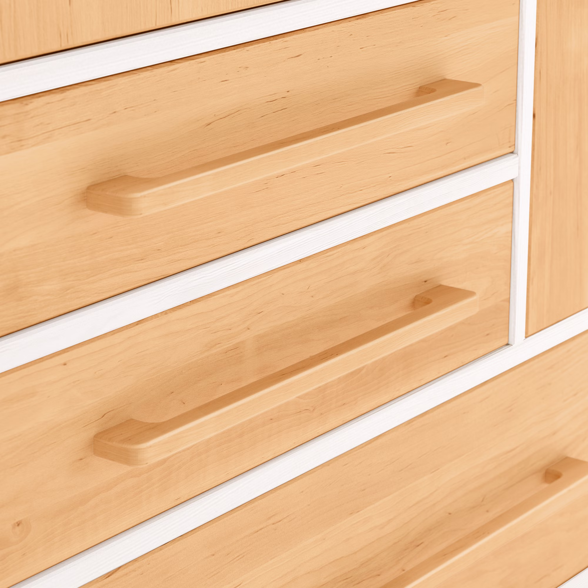 Das Schrank-Mittelteil umfasst in der Basis eine große und zwei kleine Schubladen mit Selbsteinzug und Soft-Close-Mechanismus für ein sicheres und geräuscharmes Schließen. Zudem lassen sich die Schubkästen auf kugelgelagerten Leichtlaufschienen voll ausziehen, sodass sich auch der hinterste Bereich der Schublade bequem einsehen lässt.