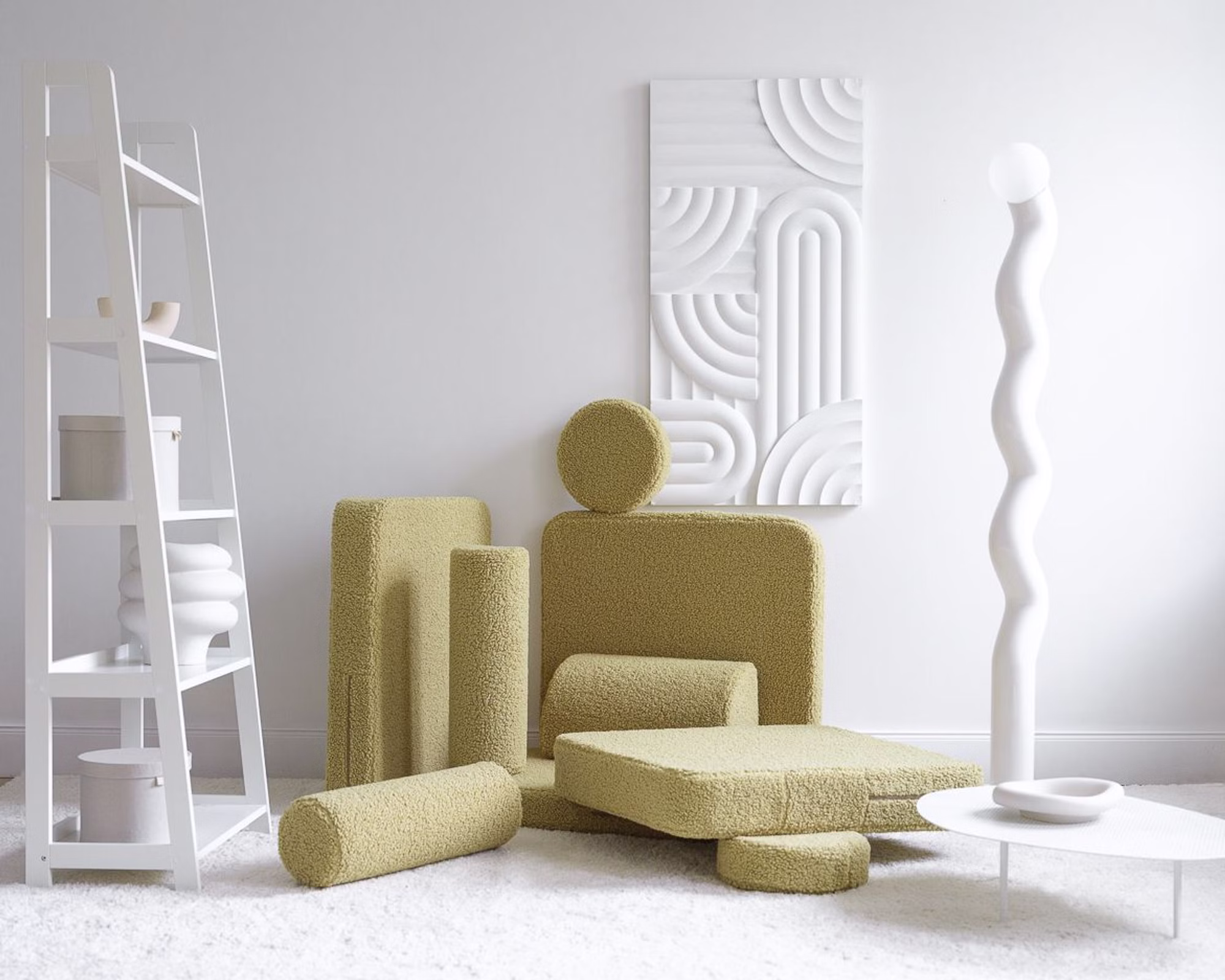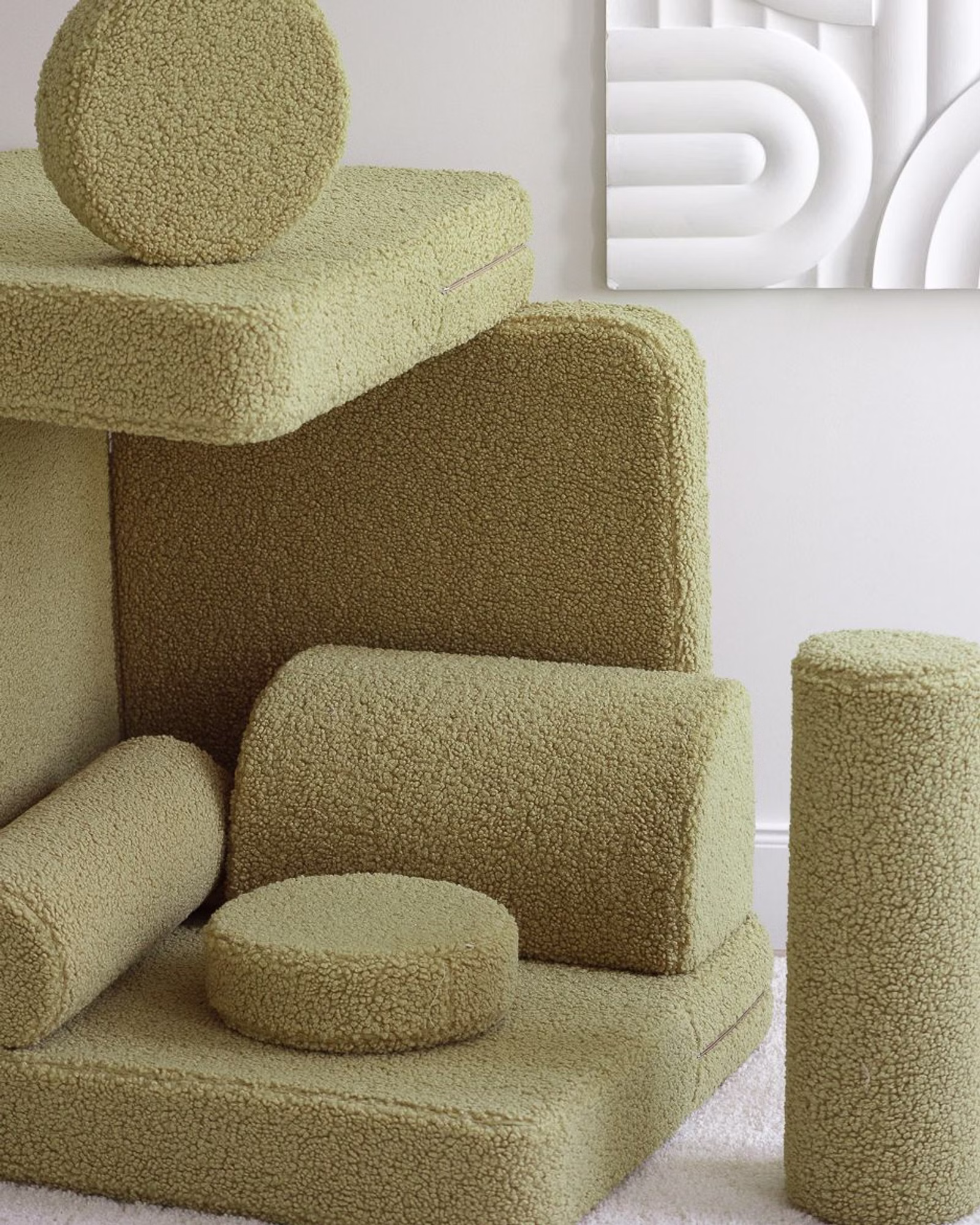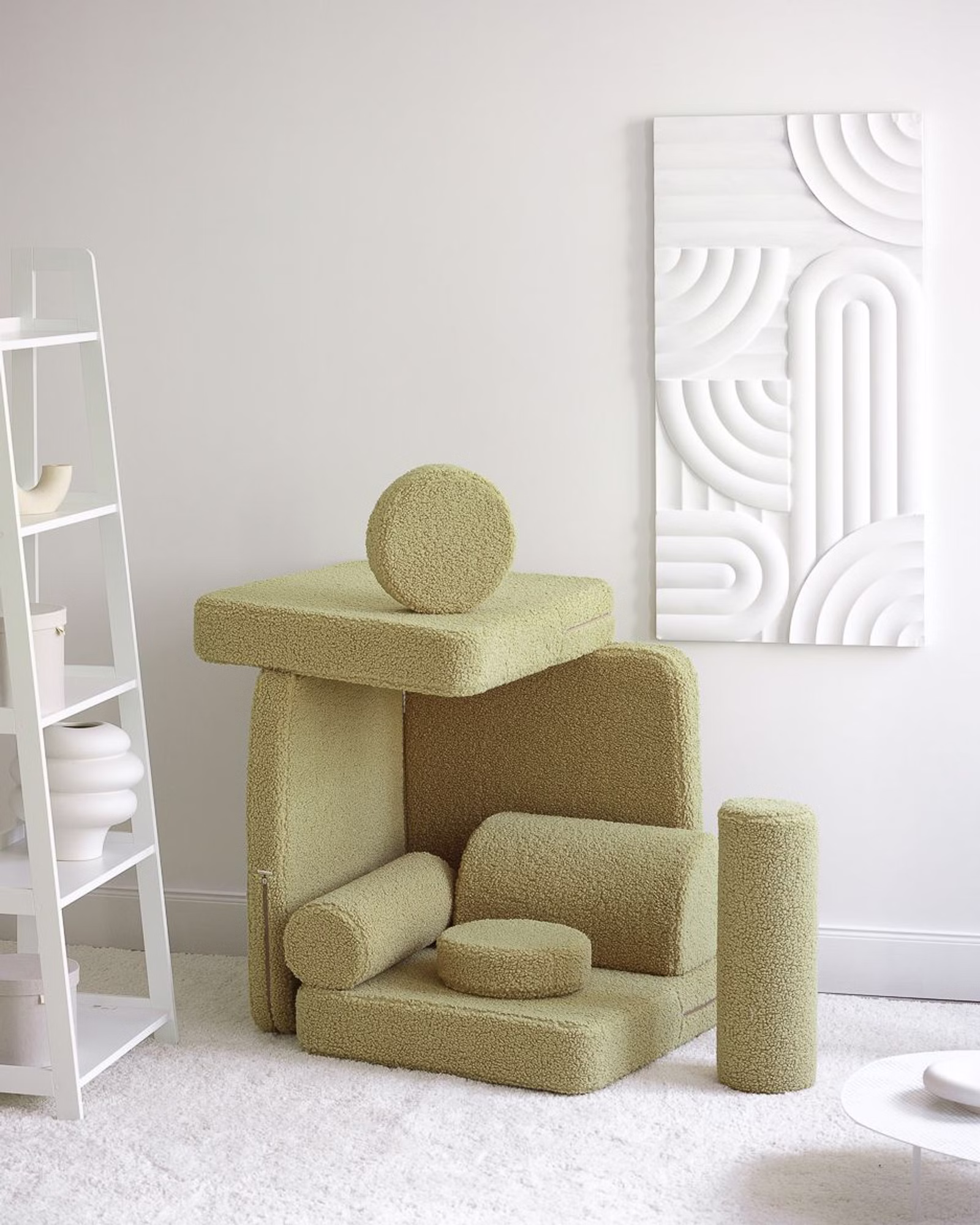 Das Sofa besteht aus 10 Teilen - zwei kleine Sitzkissen, zwei große Sitzkissen, zwei dreieckige Kissen als Rückenlehnen, zwei Rollkissen als Armlehnen und zwei runde Kissen - eine perfekte Kombination mit grenzenlosem Potenzial für fantasievolles Spiel und Entspannung. Das Spielsofa ist nicht nur ein Möbelstück - es ist eine Einladung in eine Welt voller Freude und Entdeckungen!