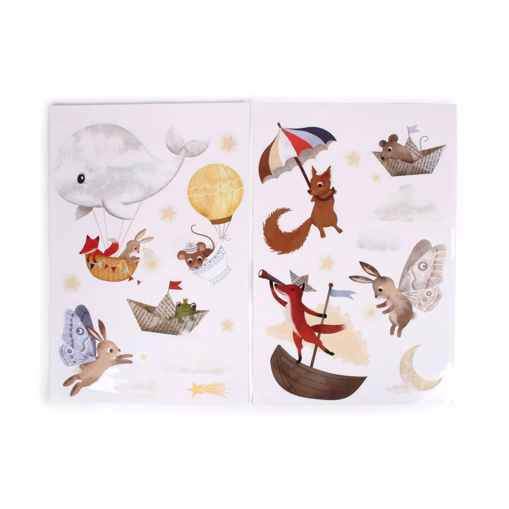 Das Set enthält 20 wunderschön illustrierte Aufkleber, darunter eine kleine Maus in einem Heißluftballon, funkelnde Sterne und sanfte Wolken. Handgezeichnete Abenteurer fliegen durch den Himmel auf der Suche nach neuen Abenteuern und bringen einen verspielten Charme in das Kinderzimmer.