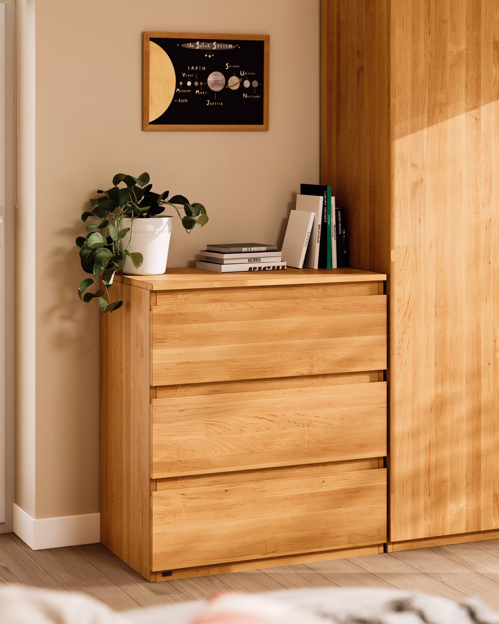 Die drei Schubladen mit kugelgelagerten Leichtlaufschienen und Vollauszug bieten genügend Stauraum und ermöglichen einen Einblick bis in den hintersten Teil der Schublade. Durch die Griffmulden sind sie auch für kleine Kinderhände leicht zu öffnen. Die Kommode sowie die Schubladen sind aus ganzen Massivholzplatten gefertigt und somit äußerst stabil und bruchsicher.