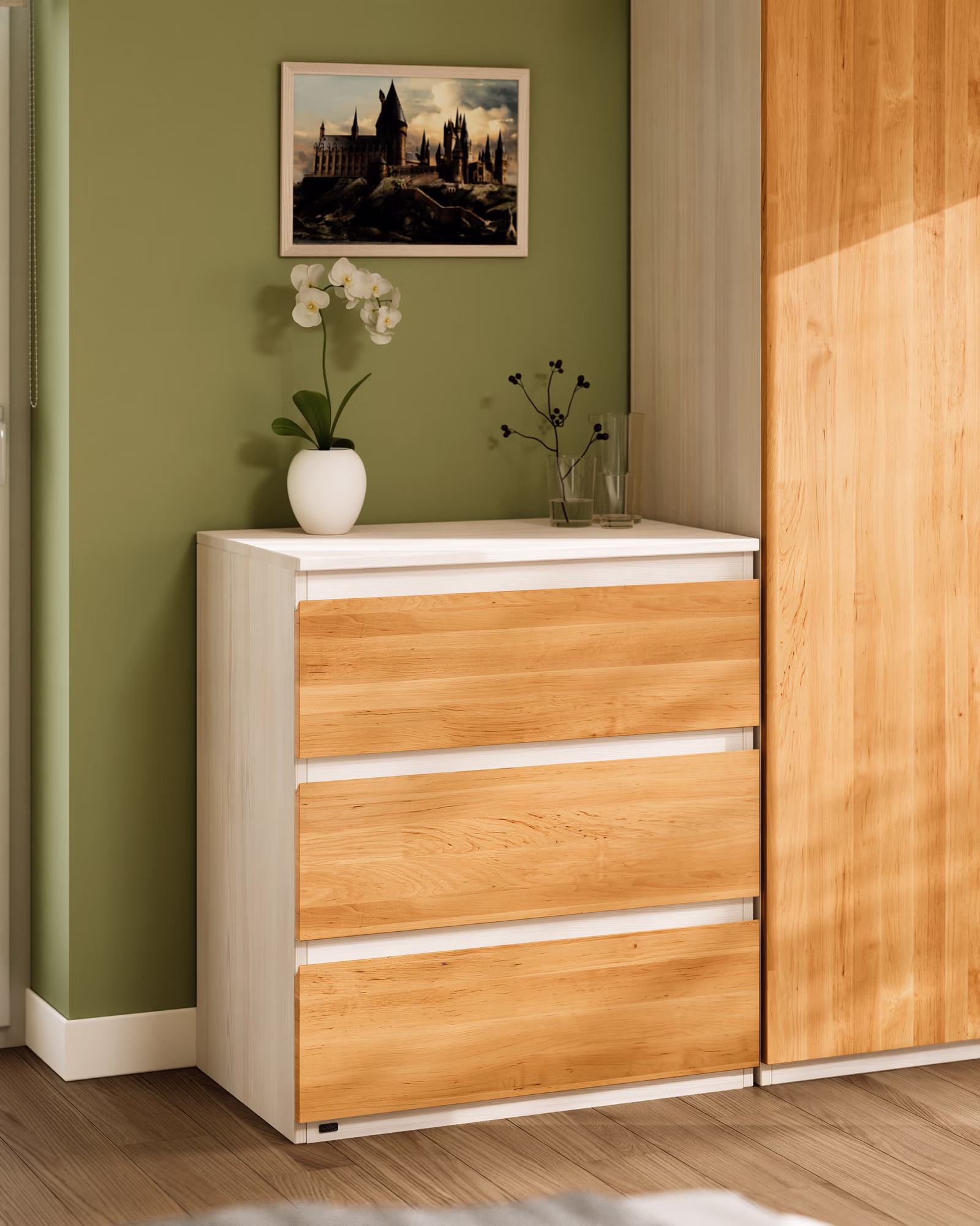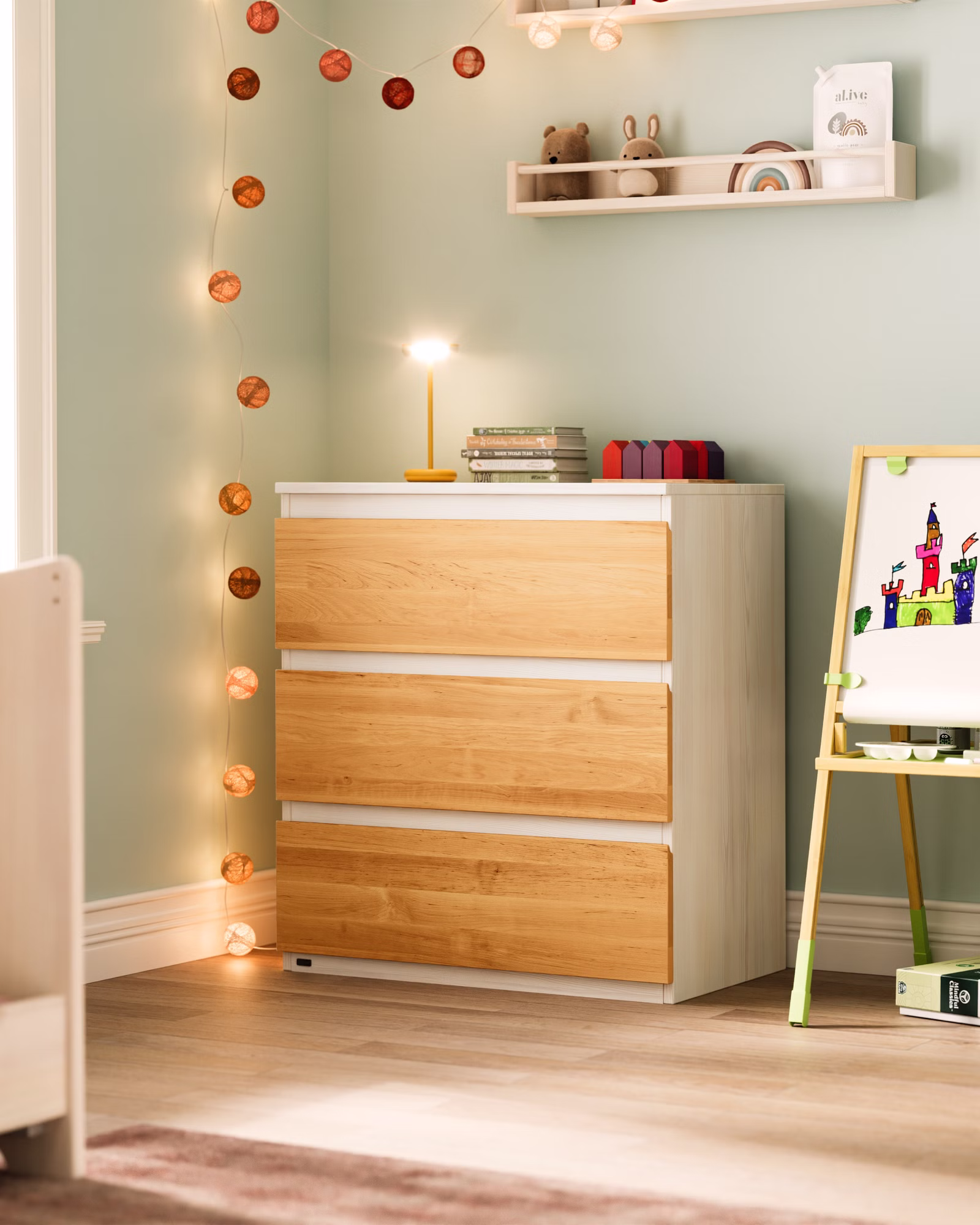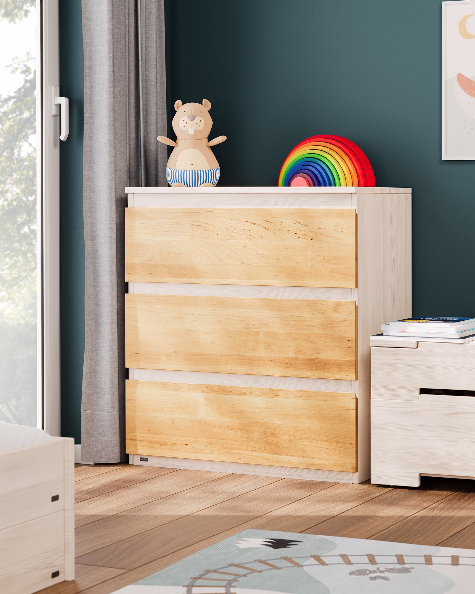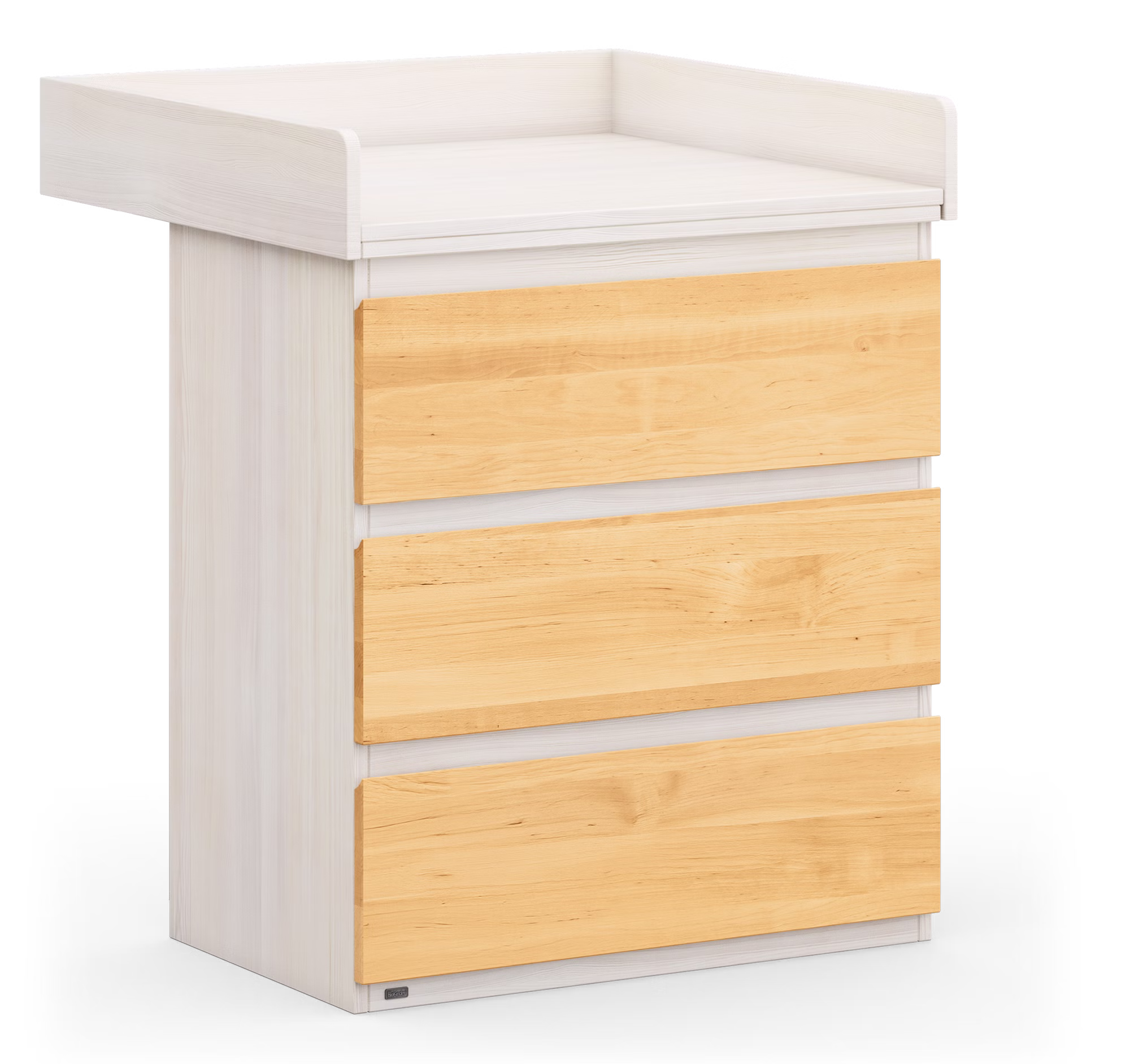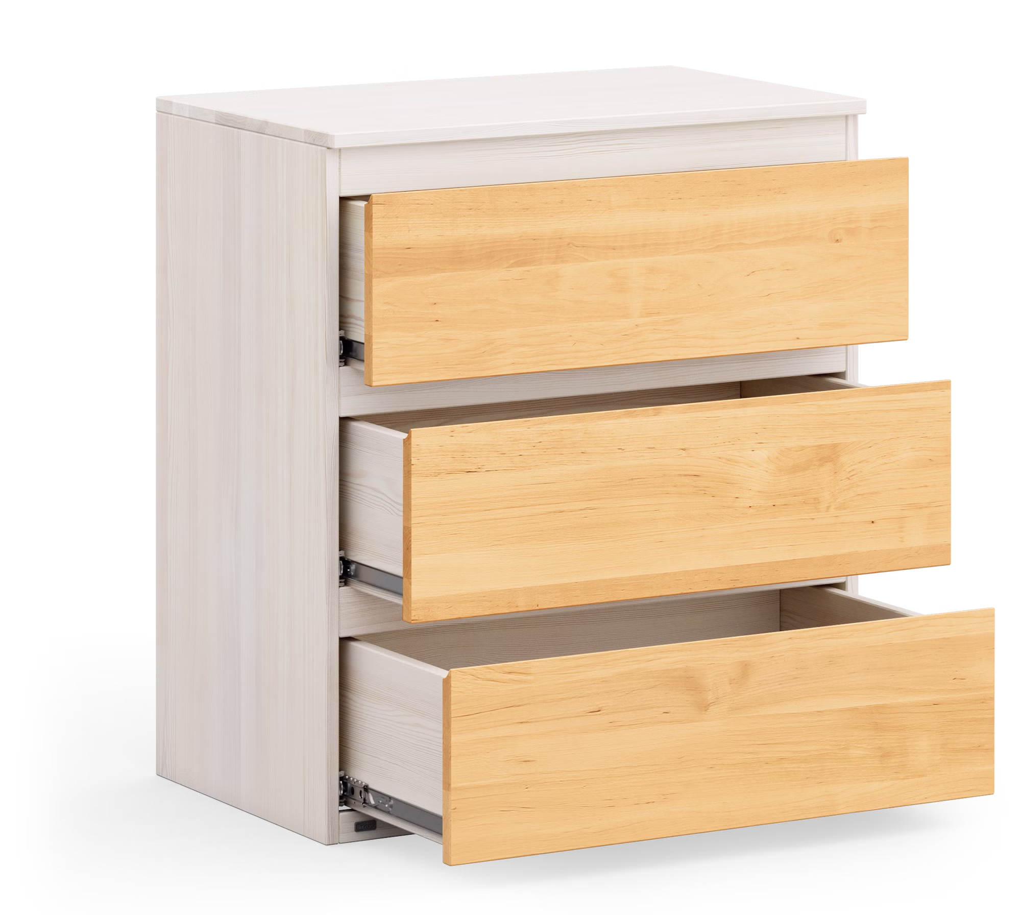 Die drei Schubladen mit kugelgelagerten Leichtlaufschienen und Vollauszug bieten genügend Stauraum und ermöglichen einen Einblick bis in den hintersten Teil der Schublade. Durch die Griffmulden sind sie auch für kleine Kinderhände leicht zu öffnen. Die Kommode sowie die Schubladen sind aus ganzen Massivholzplatten gefertigt und somit äußerst stabil und bruchsicher.