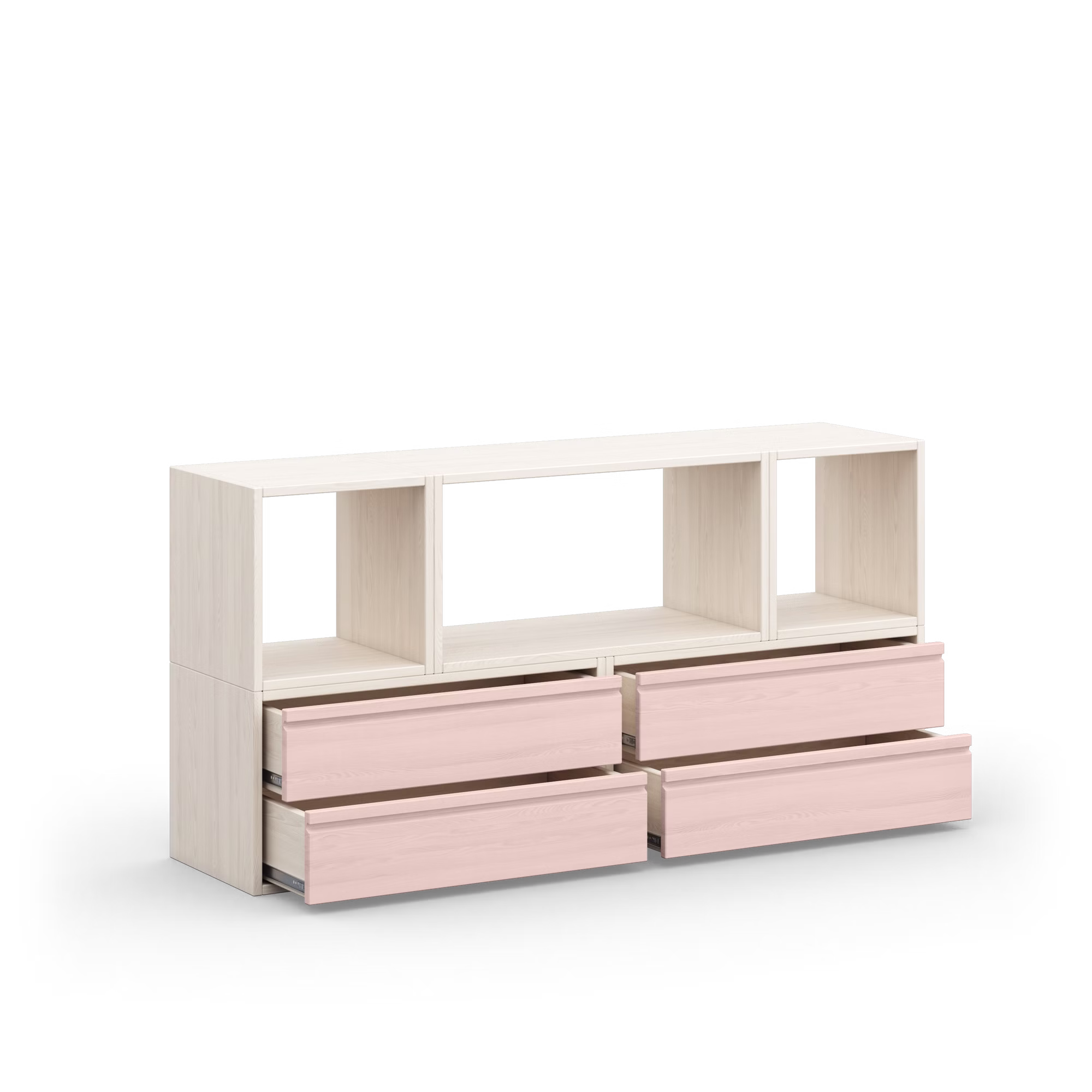 Das geräumige Spielregal mit einer Breite von 160 cm bietet viel Platz für Spielzeug, Bücher und kreative Werke. Mit einer komfortablen Höhe von 80 cm eignet es sich perfekt als Spielfläche und zur Aufbewahrung. In den vier praktischen Schubladen lassen sich Bausteine, Fahrzeuge und andere kleine Schätze ordentlich verstauen, während die drei offenen Fächer genügend Platz für Lieblingsspielzeug und Dekoration bieten.