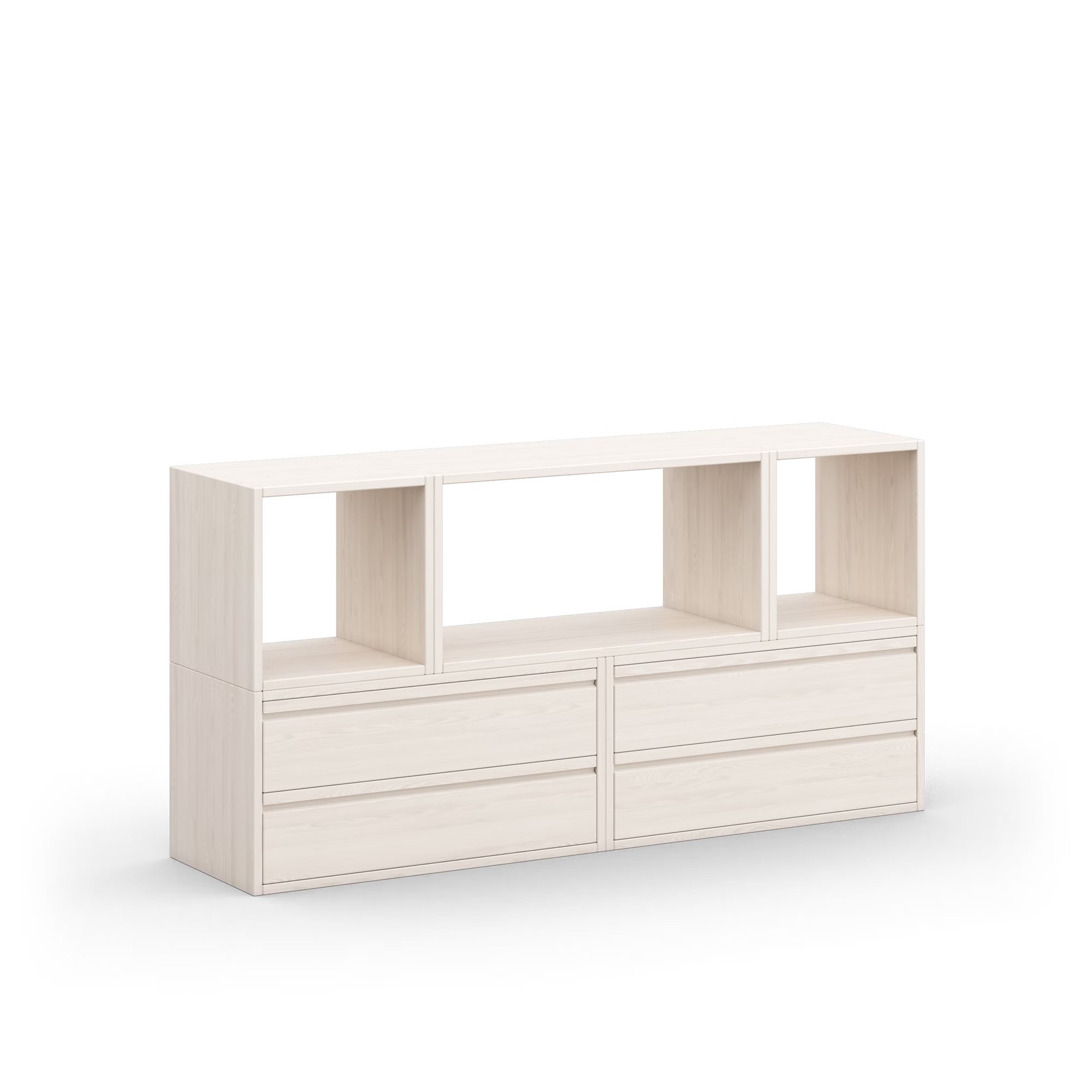 Das geräumige Spielregal mit einer Breite von 160 cm bietet viel Platz für Spielzeug, Bücher und kreative Werke. Mit einer komfortablen Höhe von 80 cm eignet es sich perfekt als Spielfläche und zur Aufbewahrung. In den vier praktischen Schubladen lassen sich Bausteine, Fahrzeuge und andere kleine Schätze ordentlich verstauen, während die drei offenen Fächer genügend Platz für Lieblingsspielzeug und Dekoration bieten.