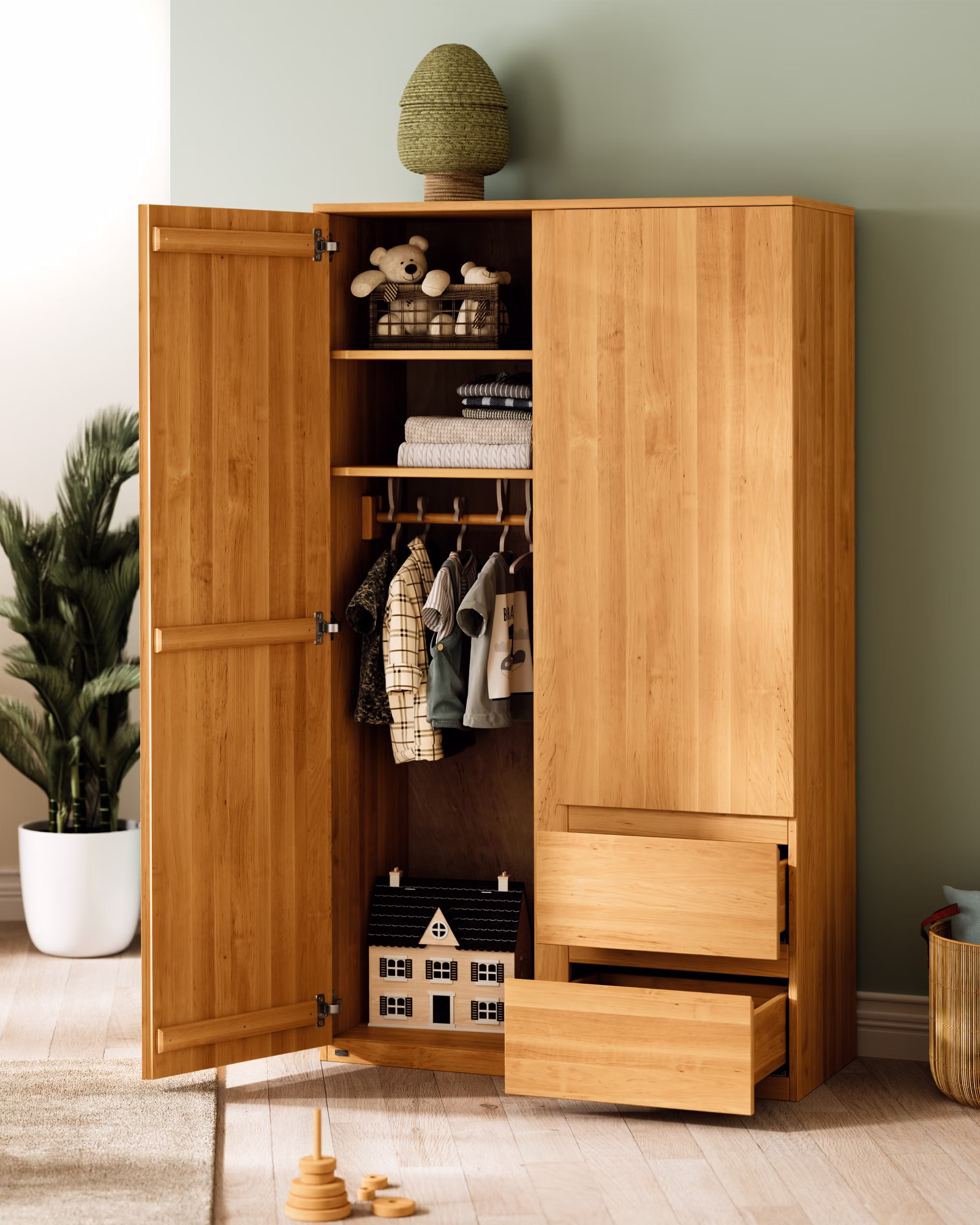 Unser Kleiderschrank Finn bietet großzügigen Stauraum und verbindet Funktionalität mit ansprechendem Design. Ob im Kinderzimmer oder auch im Wohn- oder im Eltern-Schlafzimmer, der Kleiderschrank aus 100% Bio-Massivholz fügt sich harmonisch in jedes Raumkonzept ein. Seine klare Linienführung und die schöne Maserung des Holzes auf den breiten Fronten verleihen jedem Raum eine besondere Note.