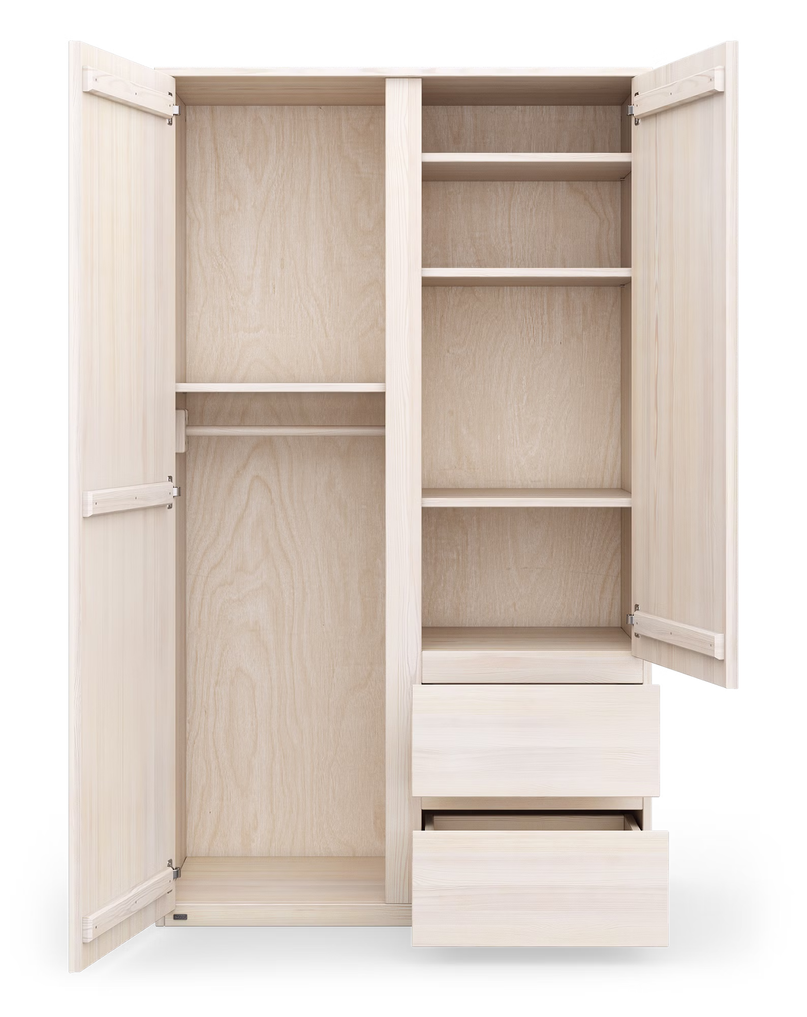 Lieferung inklusive vier Einlegeböden und einer Kleiderstange. Kann mit zusätzliche Einlegeböden oder Kleiderstangen ergänzt werden.