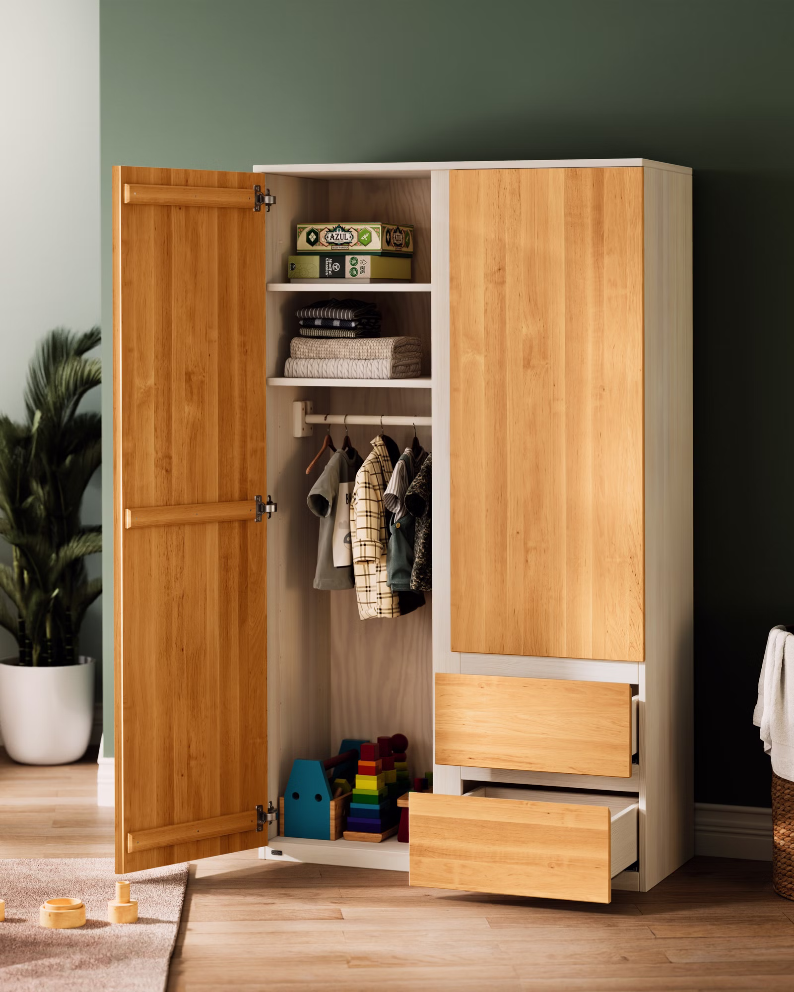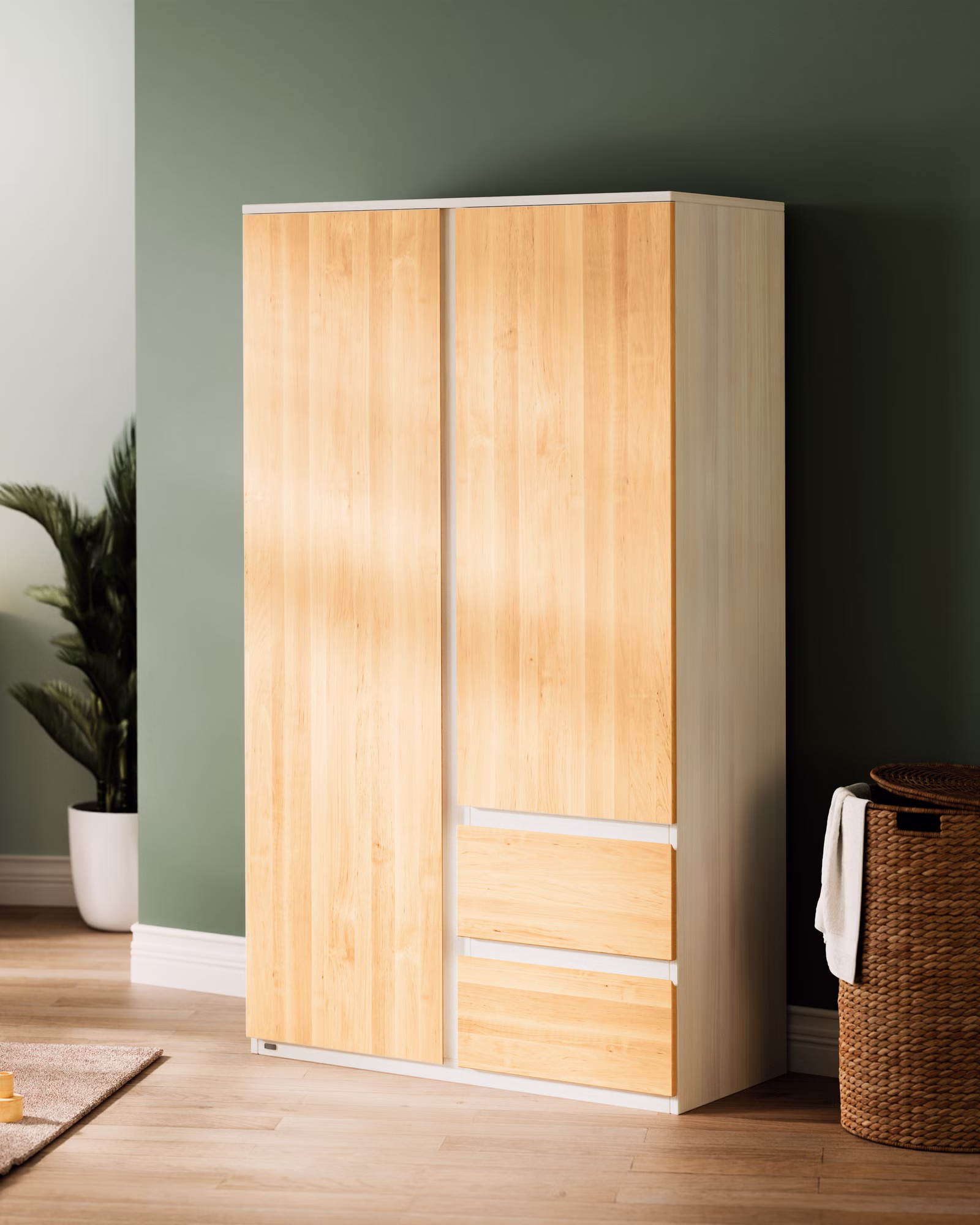 Unser Kleiderschrank Finn bietet großzügigen Stauraum und verbindet Funktionalität mit ansprechendem Design. Ob im Kinderzimmer oder auch im Wohn- oder im Eltern-Schlafzimmer, der Kleiderschrank aus 100% Bio-Massivholz fügt sich harmonisch in jedes Raumkonzept ein. Seine klare Linienführung und die schöne Maserung des Holzes auf den breiten Fronten verleihen jedem Raum eine besondere Note.