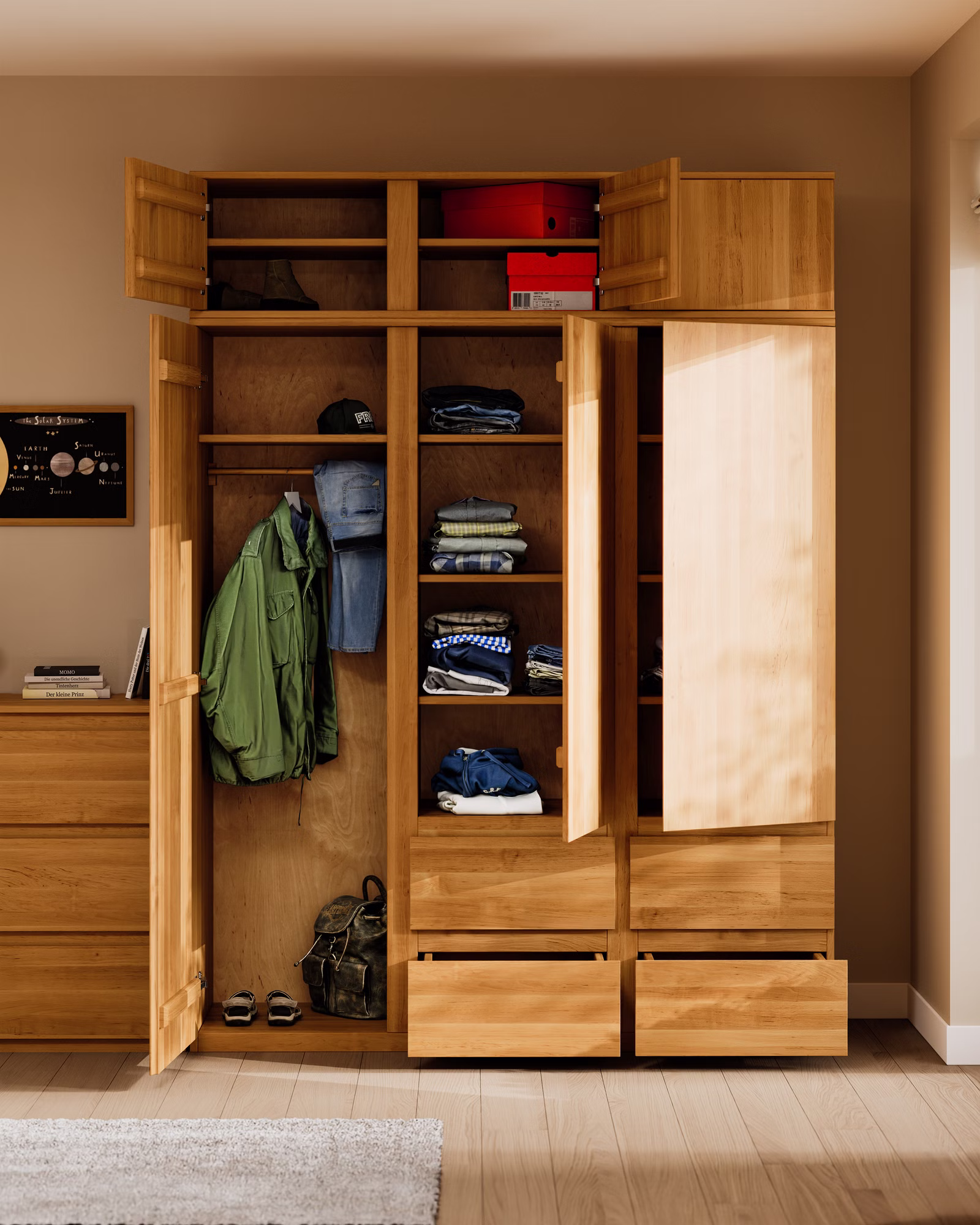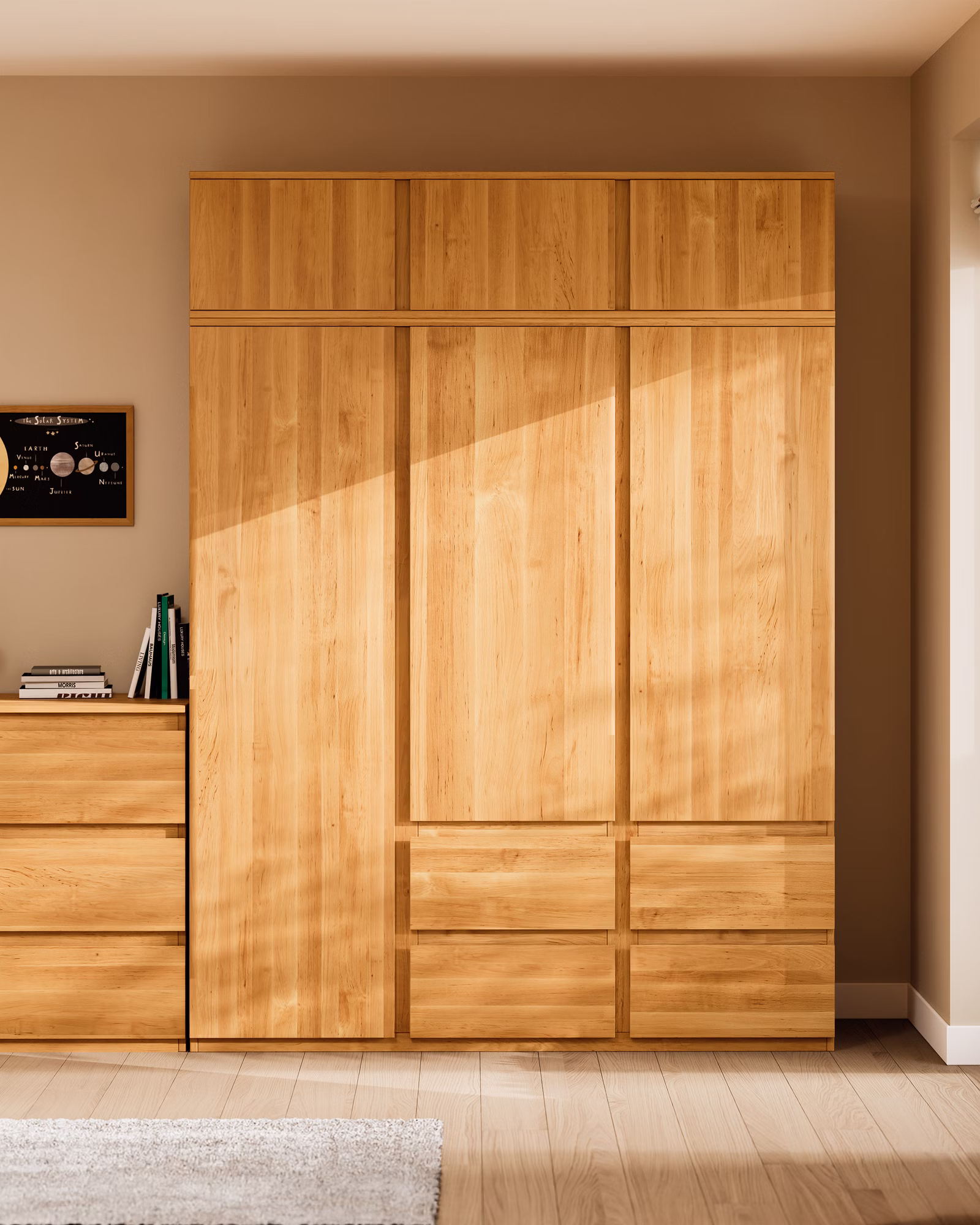 Kombiniert mit dem Finn Kleiderschrank ergibt sich eine Gesamthöhe von 228 cm, so entsteht leicht noch mehr Stauraum.