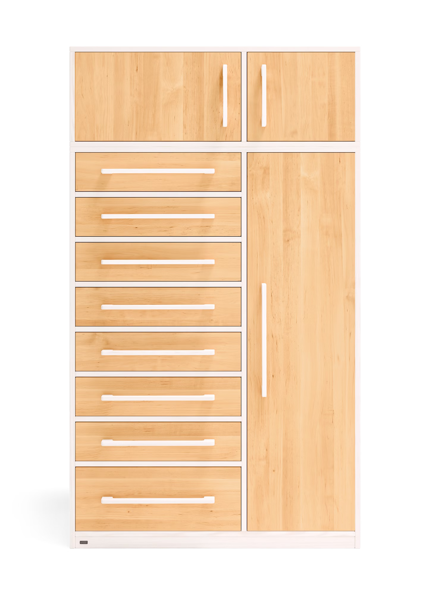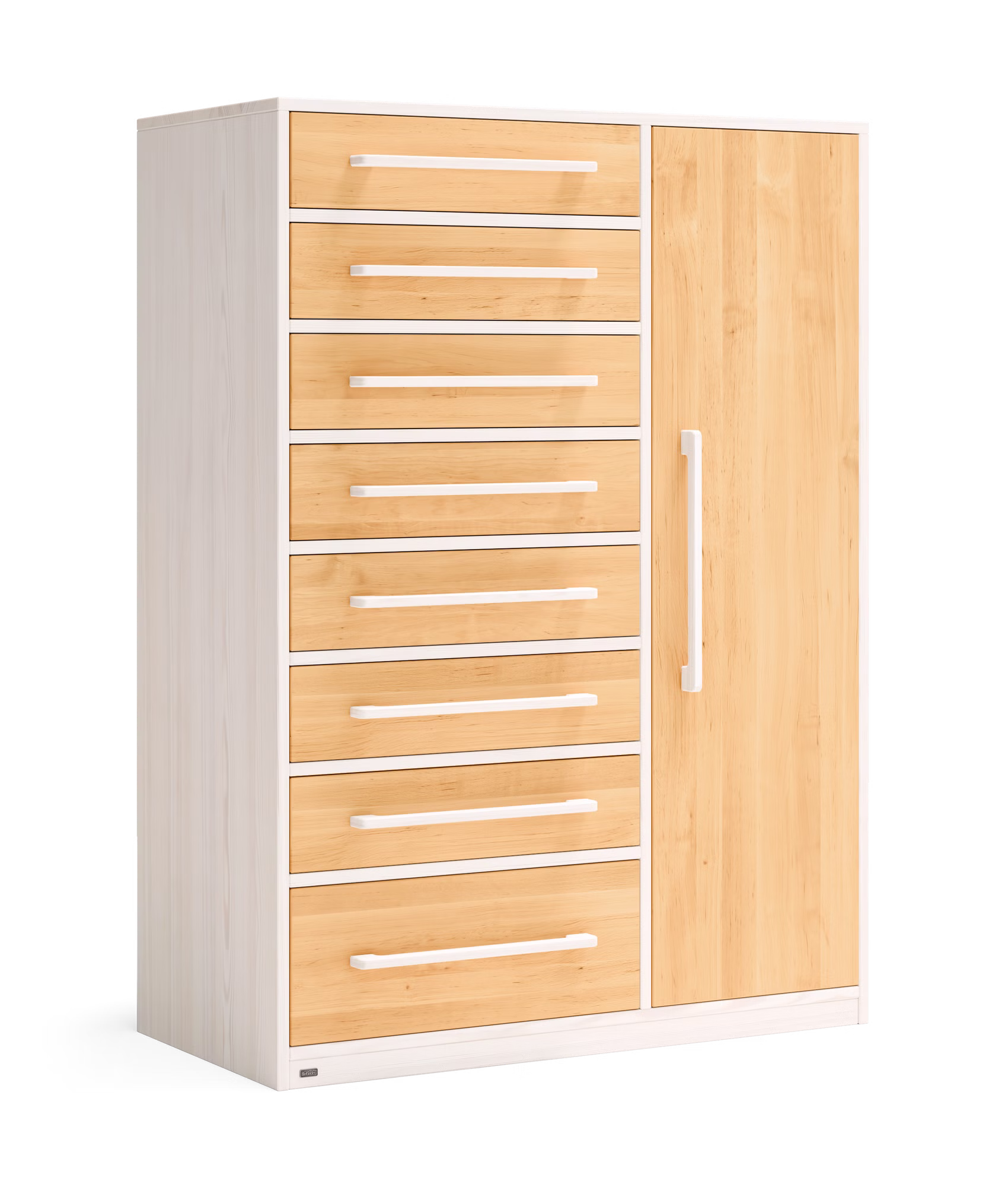 Unser Henry Kommodenschrank findet in jedem Kinder- und Schlafzimmer, aber auch im Flur als Garderobenschrank Platz. Die acht leichtlaufenden Schubladen des Kommodenschranks sind mit Selbsteinzug und Soft-Close-Mechanismus für sicheres und geräuscharmes Schließen ausgestattet. Zudem lassen sie sich voll ausziehen und bieten so einen einfachen Einblick bis in den hintersten Bereich der Schubkästen.