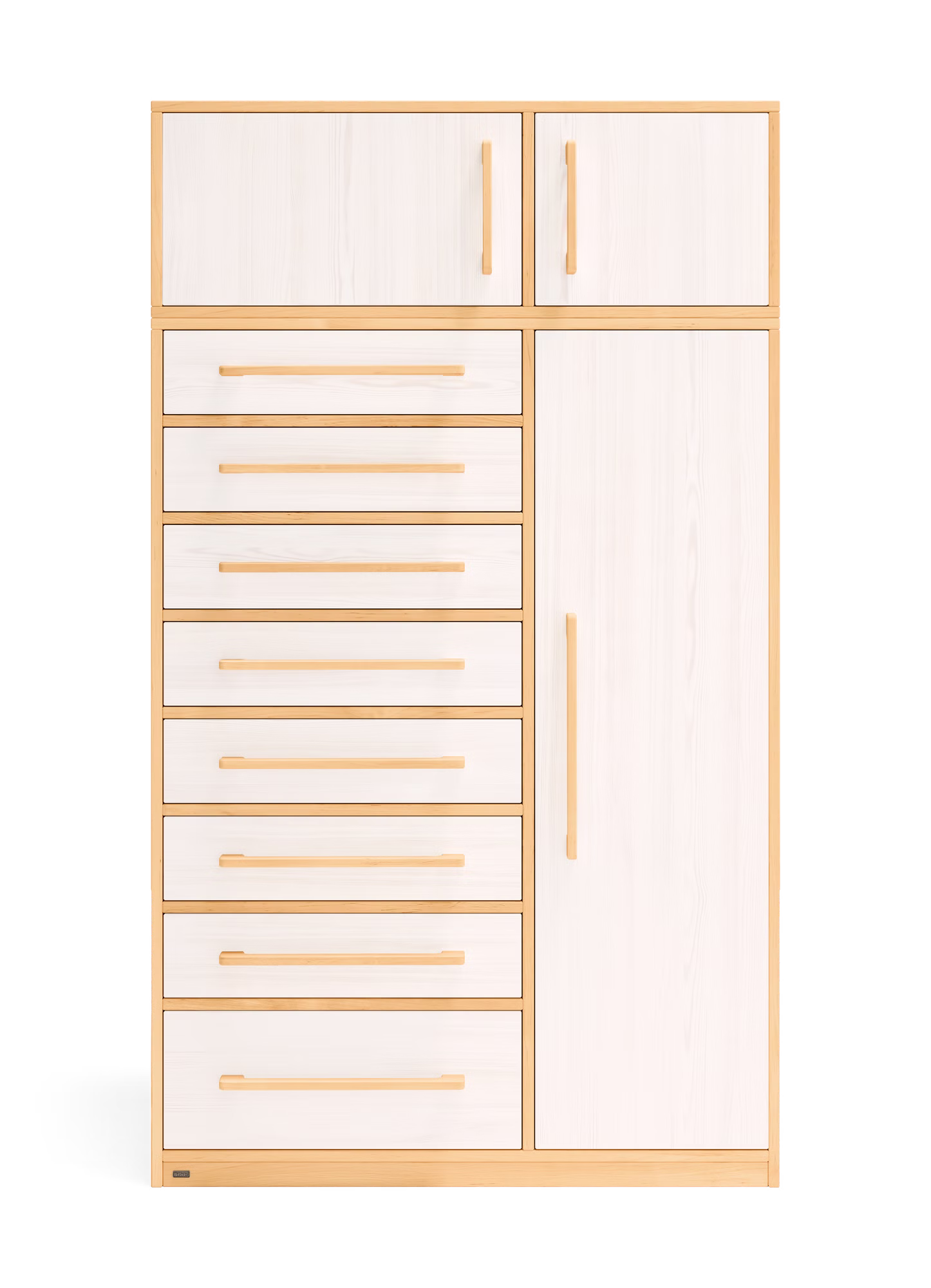 Unser Henry Kommodenschrank findet in jedem Kinder- und Schlafzimmer, aber auch im Flur als Garderobenschrank Platz. Die acht leichtlaufenden Schubladen des Kommodenschranks sind mit Selbsteinzug und Soft-Close-Mechanismus für sicheres und geräuscharmes Schließen ausgestattet. Zudem lassen sie sich voll ausziehen und bieten so einen einfachen Einblick bis in den hintersten Bereich der Schubkästen.