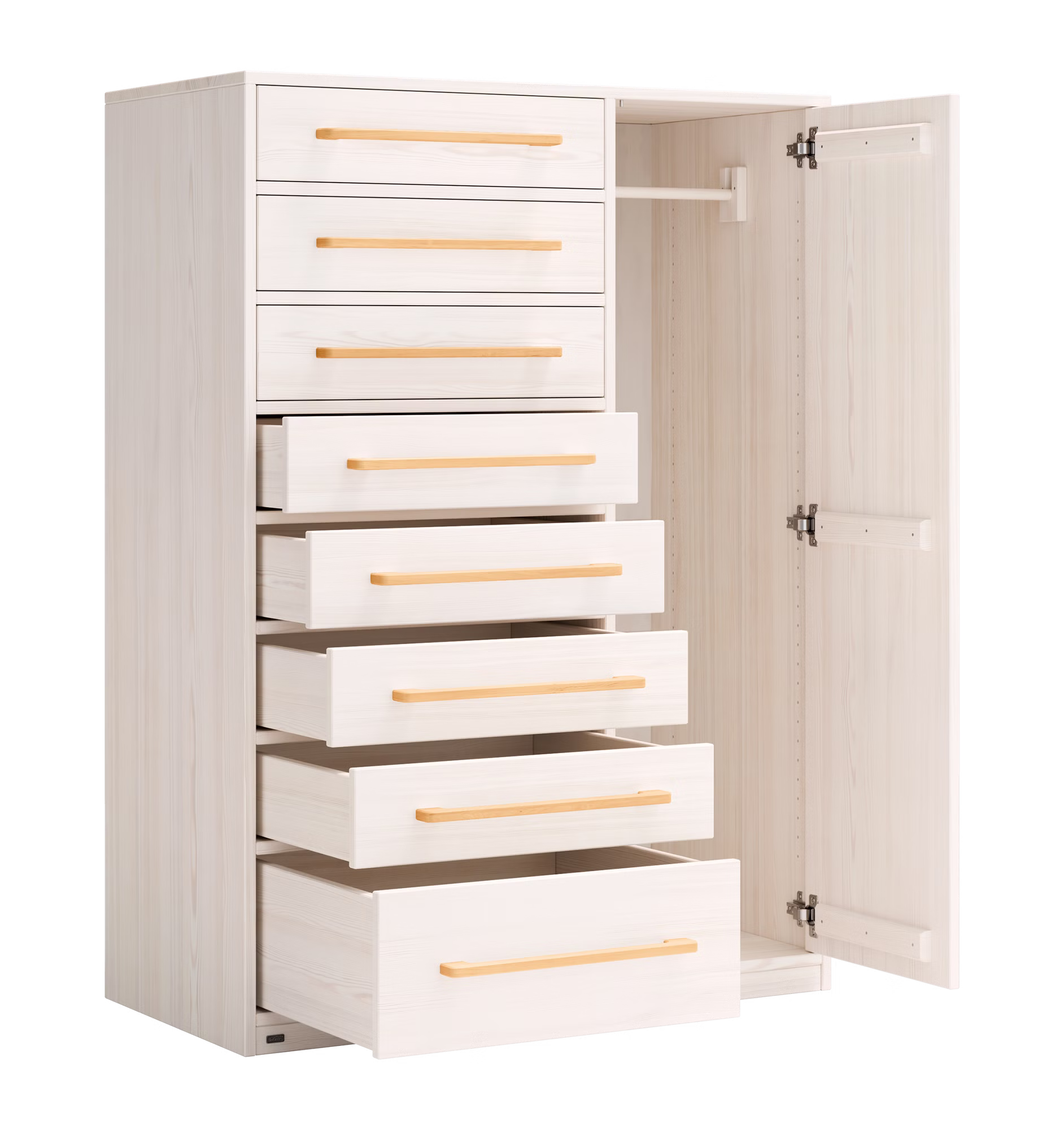 Unser Henry Kommodenschrank findet in jedem Kinder- und Schlafzimmer, aber auch im Flur als Garderobenschrank Platz. Die acht leichtlaufenden Schubladen des Kommodenschranks sind mit Selbsteinzug und Soft-Close-Mechanismus für sicheres und geräuscharmes Schließen ausgestattet. Zudem lassen sie sich voll ausziehen und bieten so einen einfachen Einblick bis in den hintersten Bereich der Schubkästen.