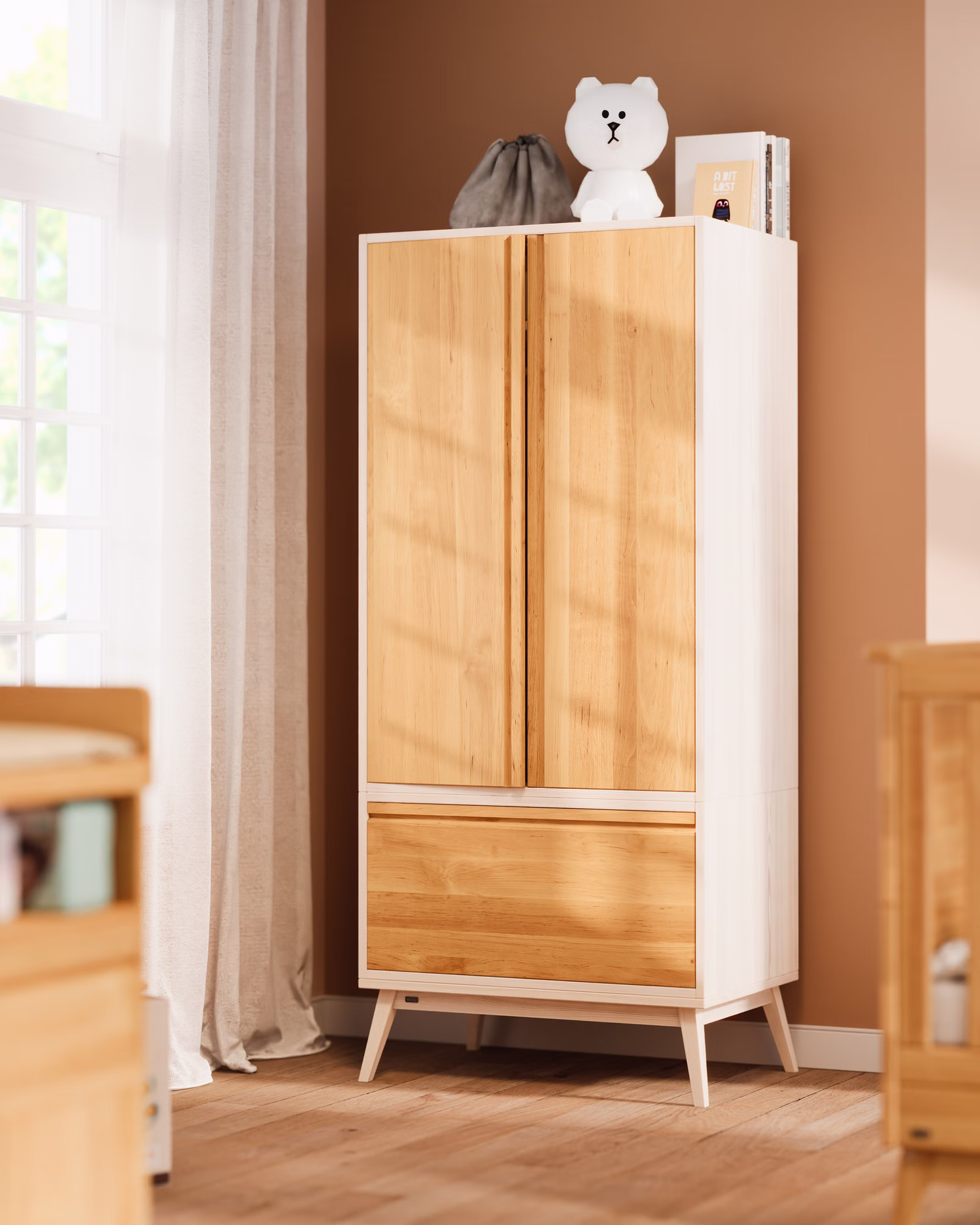 Unser 2-türiger Lina Kinder-Kleiderschrank wird aus Bio-Massivholz gefertigt und bietet vielfältige Gestaltungsmöglichkeiten. Der Schrank lässt sich mit weiteren unserer Laura Schrankelemente individuell kombinieren und so flexibel erweitern.