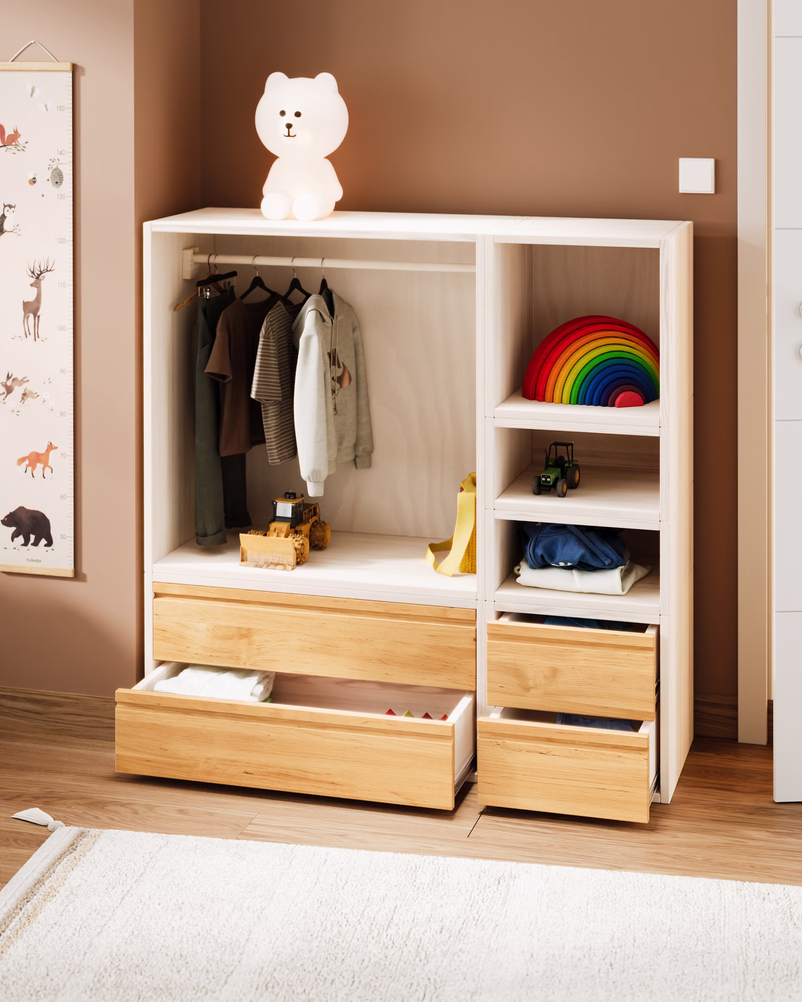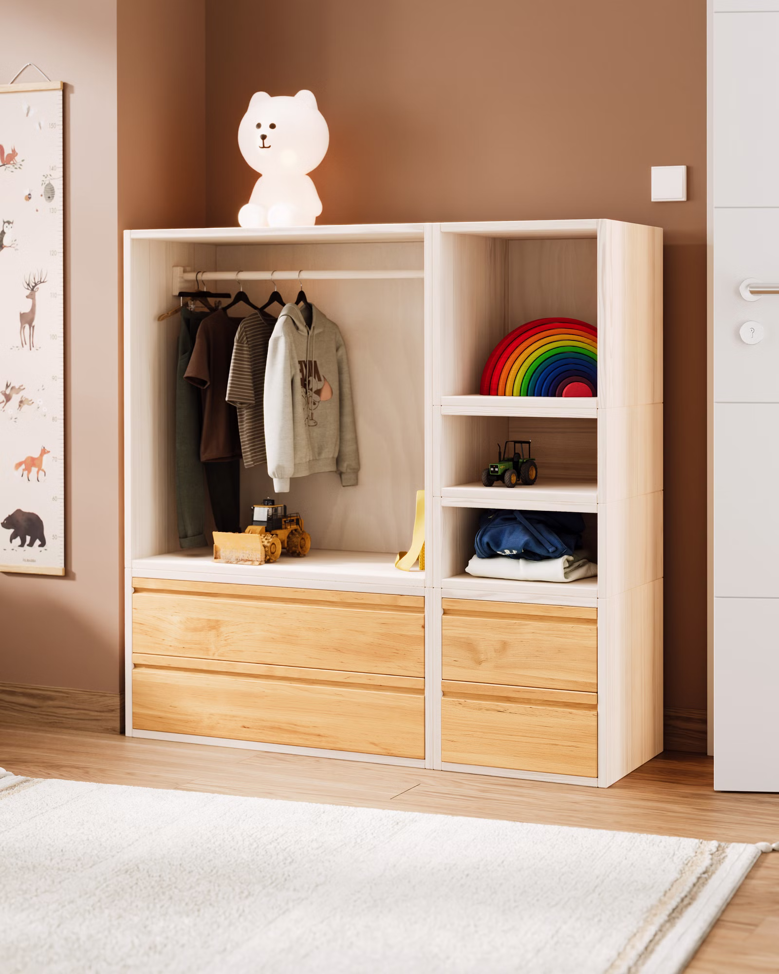 Durch seine sanfte Holzstruktur und das natürliche Design entsteht eine warme, beruhigende Atmosphäre. Der Schrank fügt sich harmonisch in jedes Kinderzimmer ein und unterstützt die kleinen Bewohner dabei, ihre Umwelt auf eigene Weise zu gestalten – spielerisch, sicher und natürlich.