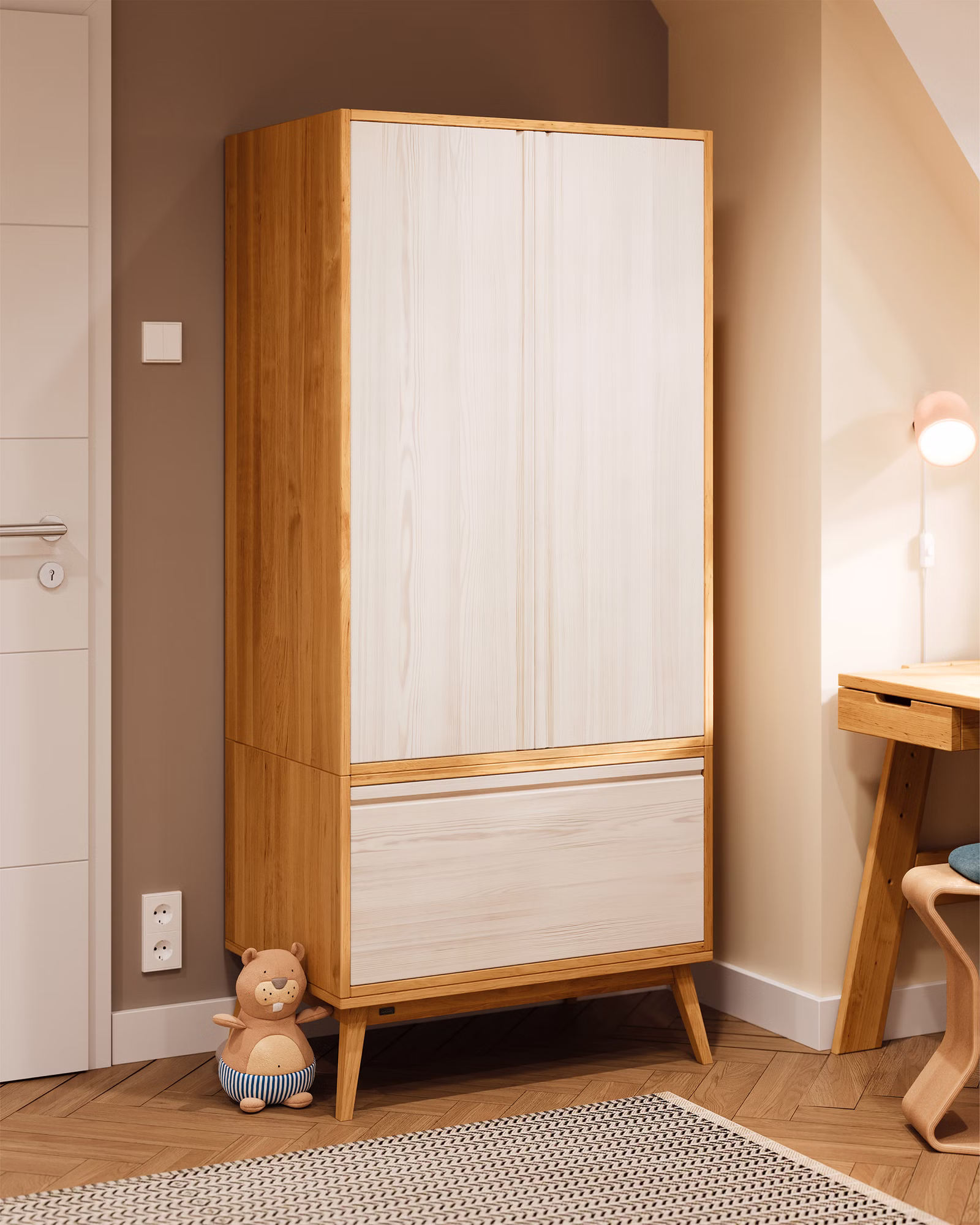 Unser Set Laura Retro Schrank mit Schubkasten und Sockel wird aus Bio-Massivholz gefertigt und ist die ideale Ausstattung für jedes Kinderzimmer. Dank des nostalgischen Charms und der elegant gefrästen Griffmulden wird dieser Kleiderschrank zu einem echten Hingucker, der jede Einrichtung harmonisch ergänzt.