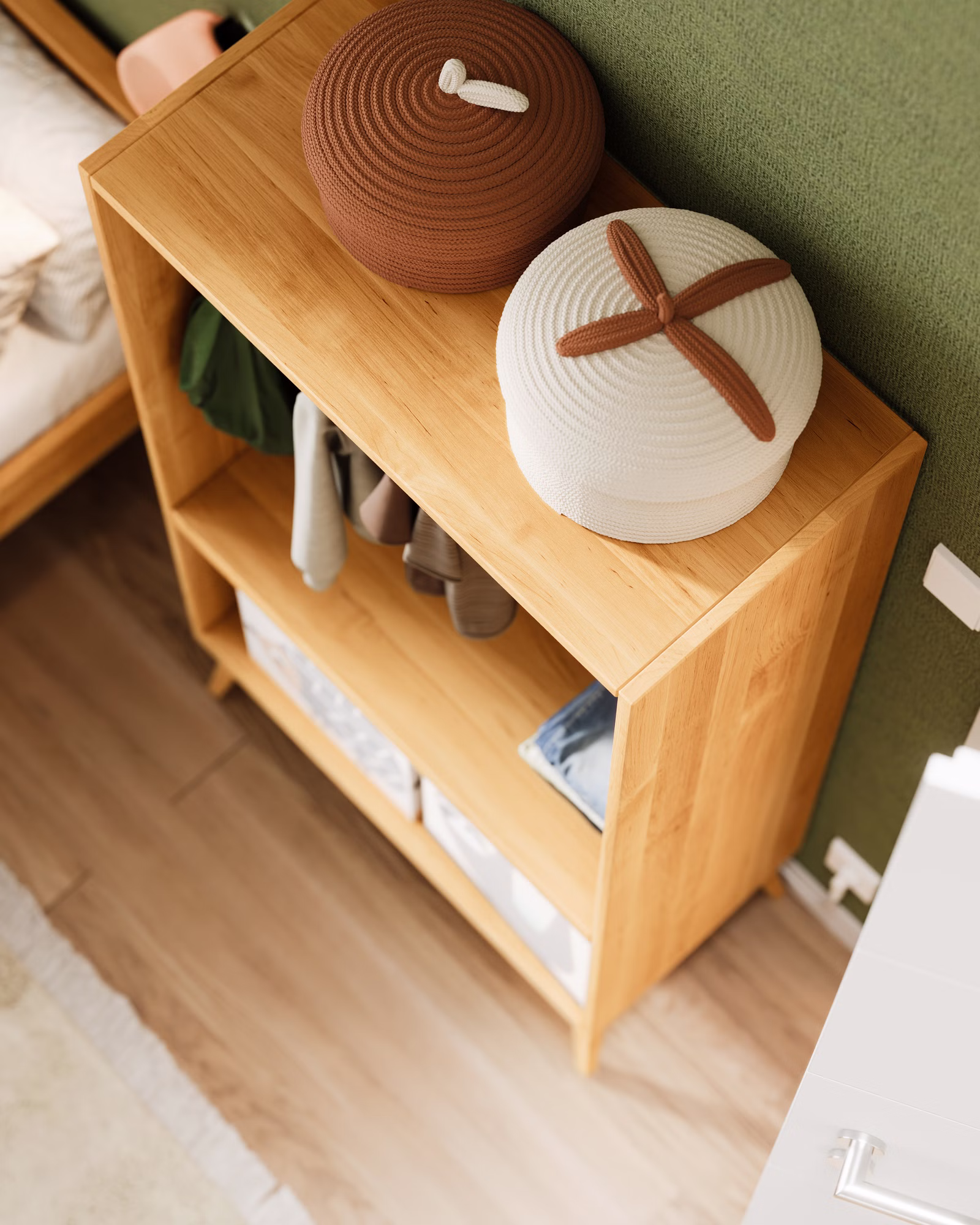 Das Set vereint zeitloses Retro-Design mit durchdachter, kindgerechter Funktionalität. Seine offene Bauweise mit Kleiderstange und großzügigen Ablagefächern gibt Kindern die Möglichkeit, ihre Kleidung, Schuhe und Accessoires selbstständig zu erreichen und ordentlich zu verstauen. Das stärkt spielerisch ihr Selbstvertrauen und unterstützt sie dabei, den Alltag eigenverantwortlich zu gestalten. Die leicht ausgestellten Füße verleihen dem Schrank seinen charakteristischen Retro-Charme, während die natürliche Holzoptik für Wärme und Geborgenheit sorgt. Ob als Kinderkleiderschrank, Garderobe im Flur oder Raumteiler – dieses Set ist vielseitig einsetzbar und lädt zum kreativen Spielen und Entdecken ein.