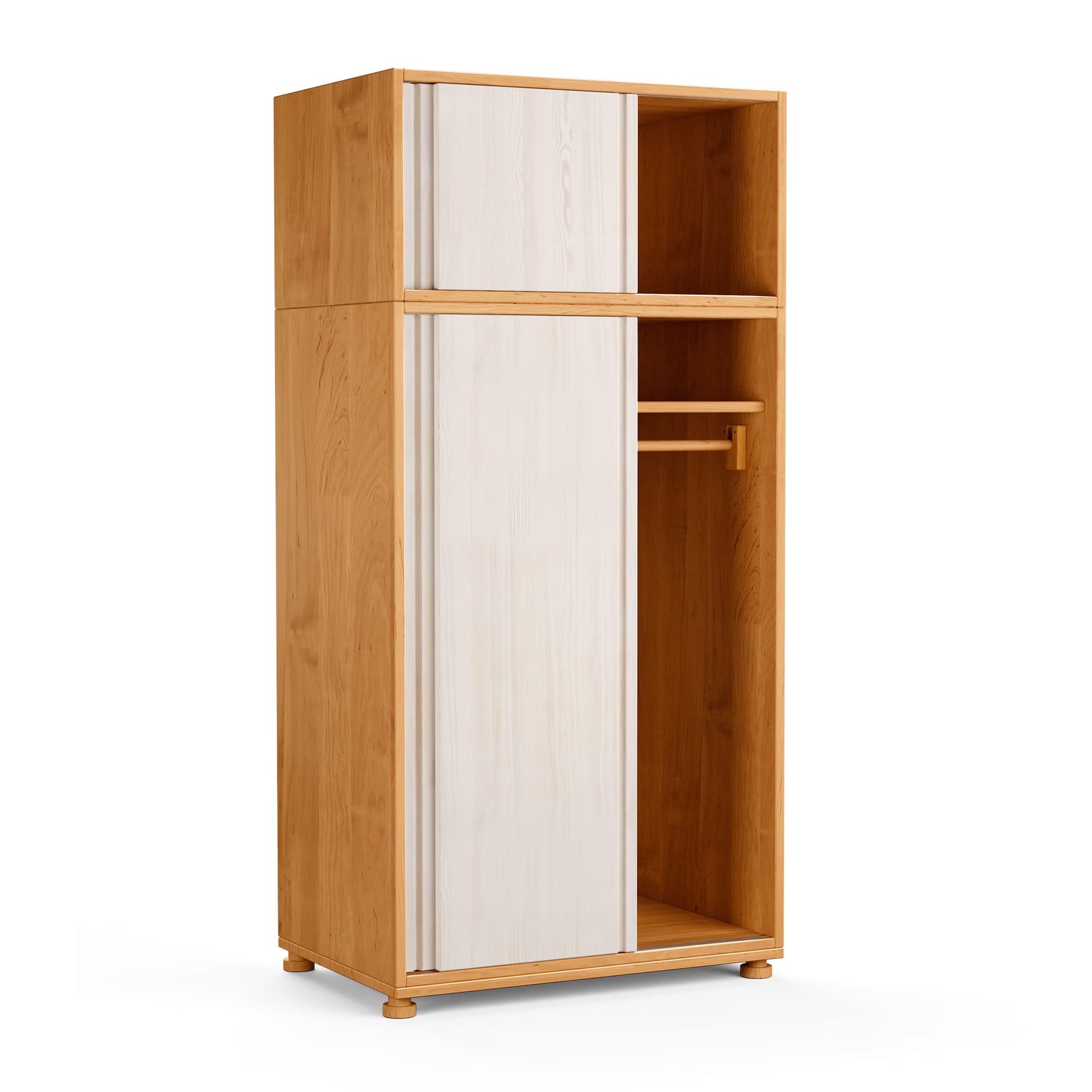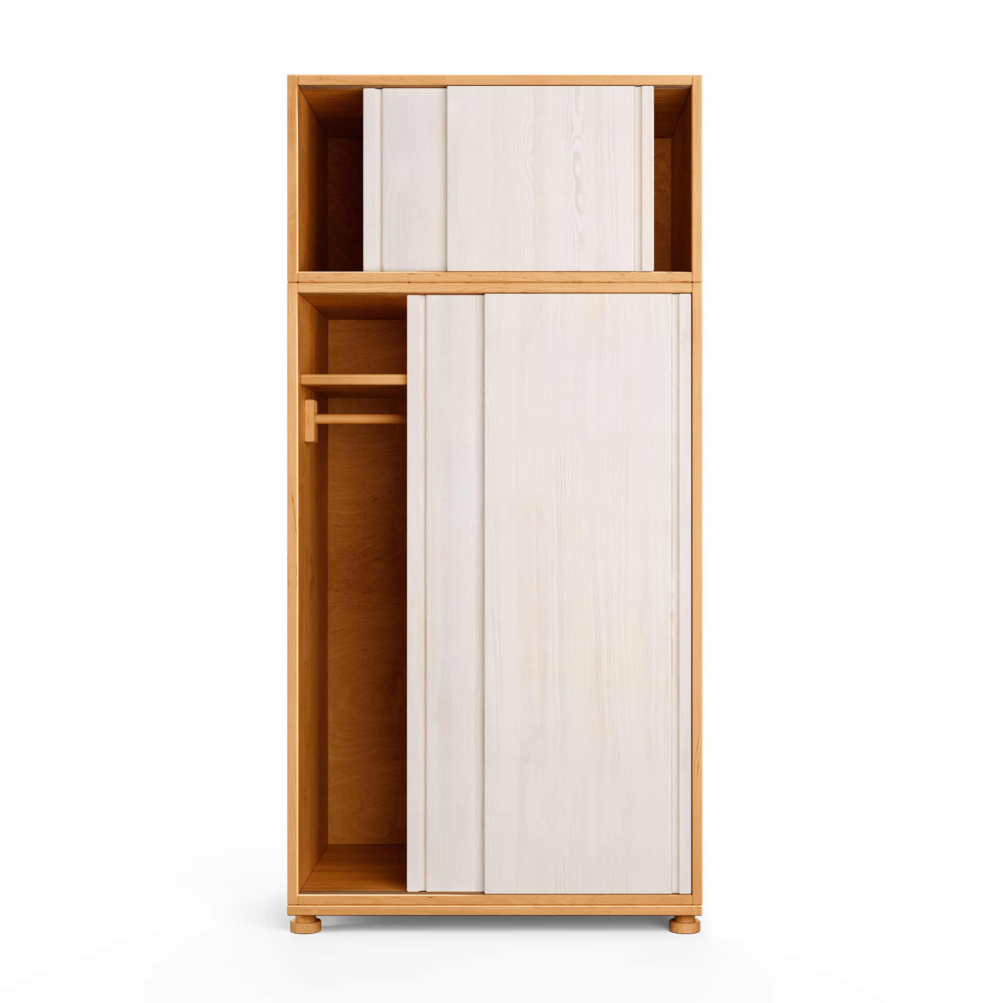 Unser Set Laura Schiebetürenschrank wird aus Bio-Massivholz gefertigt und lässt sich vielfältig einsetzen. Das große Schrankelement verfügt über eine fest installierte Kleiderstange für Jacken, Kleider, Blusen und Hemden. Oberhalb der Kleiderstange bietet das feste Ordnungsfach Platz für weitere Kleidungsstücke wie T-Shirts und Pullover. Das kleine Schrankelement bietet dank des Einlegebodens zwei Fächer zum bequemen Verstauen weiterer Gegenstände. So sorgt die durchdachte Inneneinrichtung für eine verbesserte Übersichtlichkeit und Ordnung.
