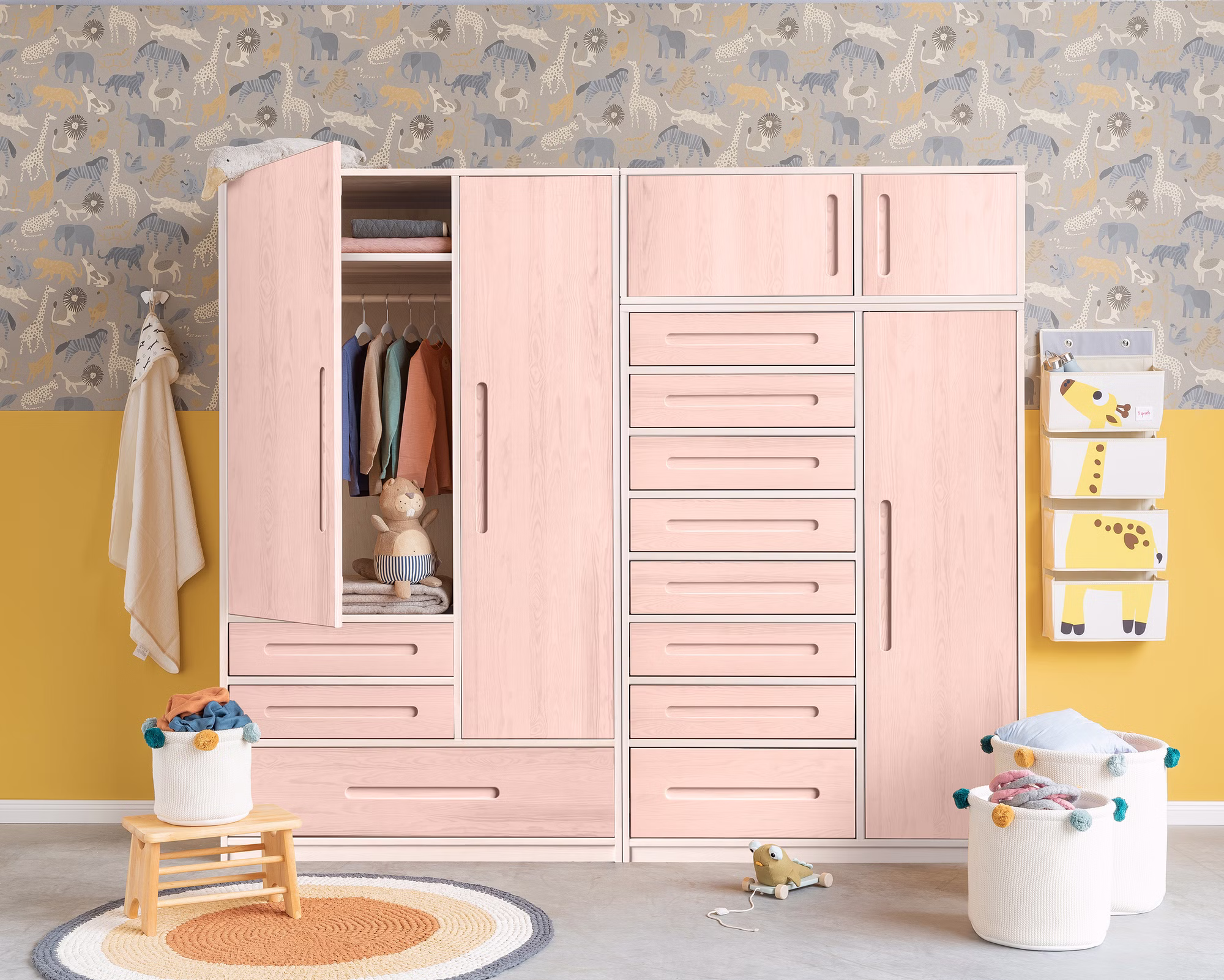 Unsere Lina Möbel bilden dabei die Grundlage für ein zeitlos schönes Kinderzimmer, das vom Baby- bis zum Jugendzimmer mitwächst. Modernes geometrisches Design und elegant gefräste Griffmulden zeichnen die Schrankkombination aus.