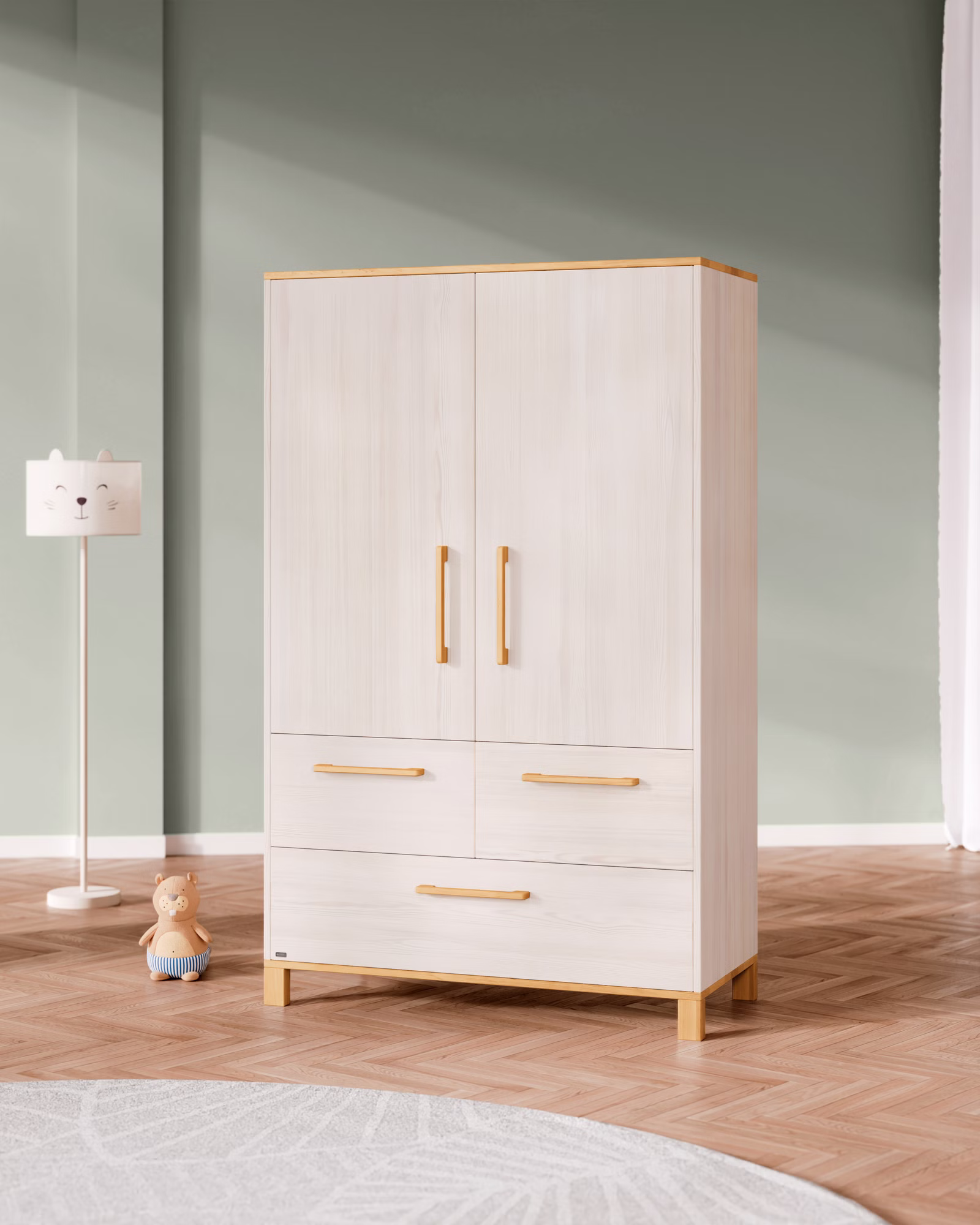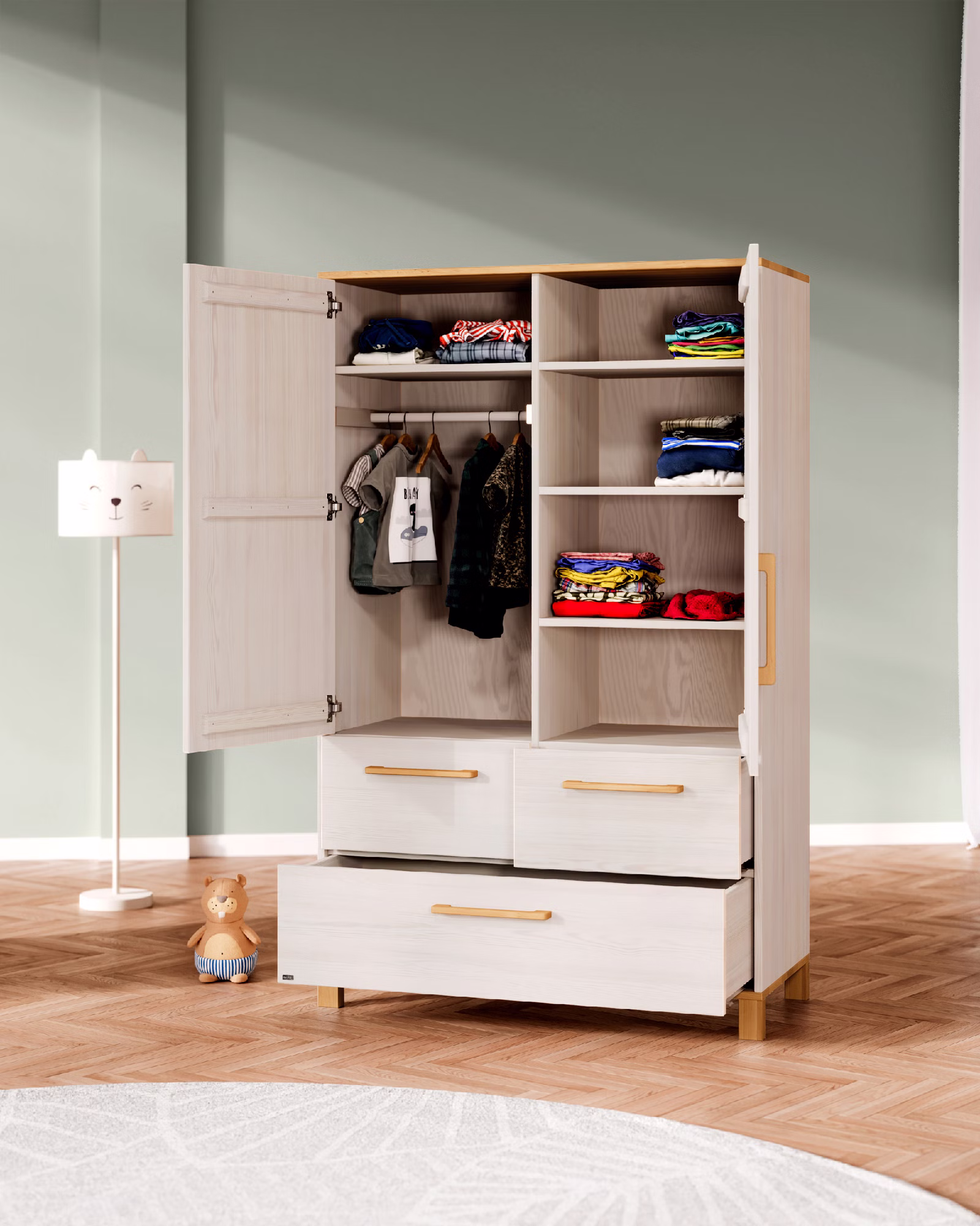 Der Theo Kleiderschrank überzeugt mit natürlichen Materialien, hochwertiger Verarbeitung und funktionalen Extras für den Familienalltag: