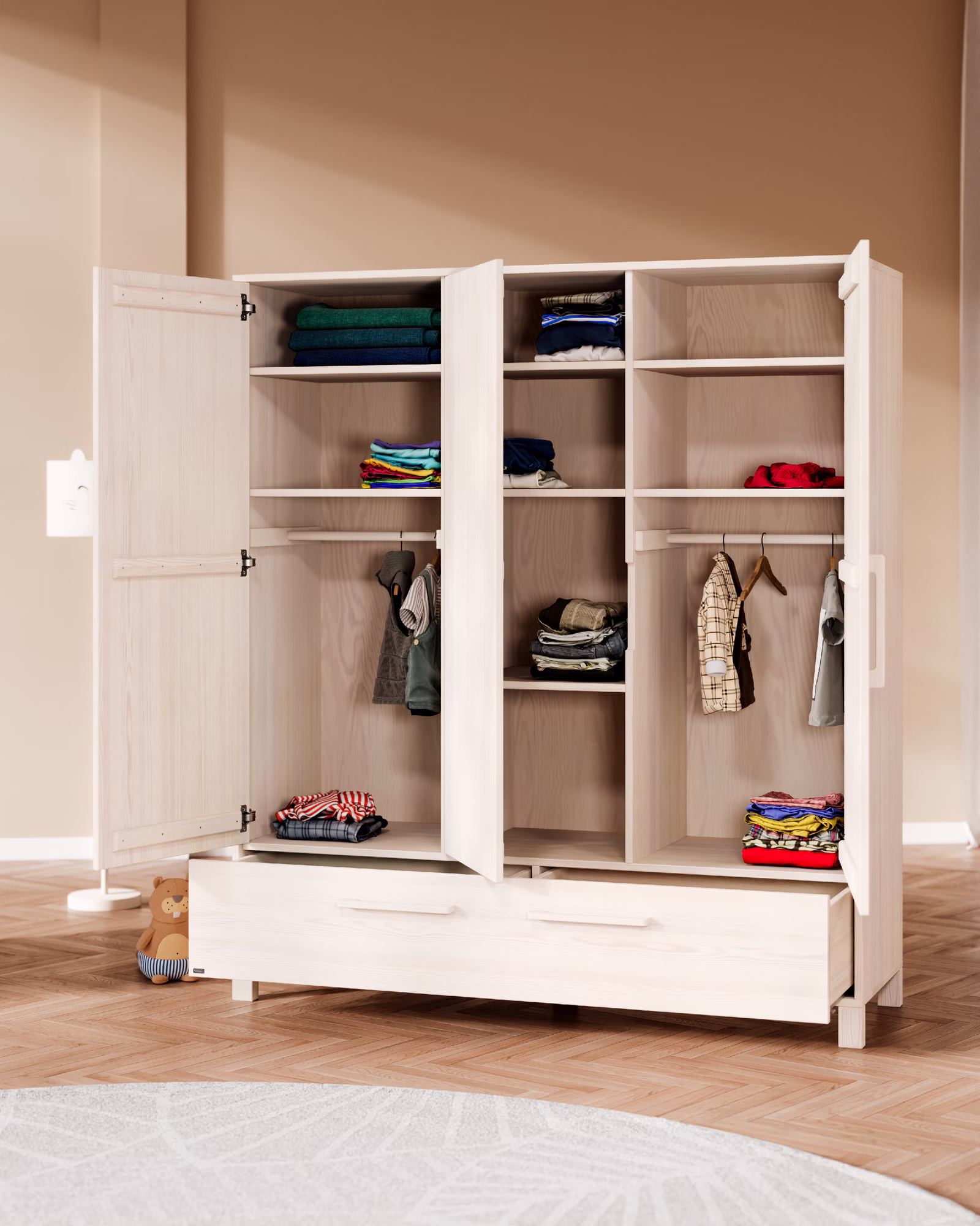 Die durchdachte Innenaufteilung sorgt für maximale Übersicht und Flexibilität im Familienalltag. Hinter drei Türen bietet der großzügige Kleiderschrank vielseitigen Stauraum: Fünf flexibel positionierbare Einlegeböden lassen sich individuell anpassen oder bei Bedarf erweitern. Eine praktische Kleiderstange ergänzt den Innenraum ideal und schafft Platz für Jacken, Hemden und Kleider – so wächst der Stauraum mit den Bedürfnissen Ihres Kindes mit.