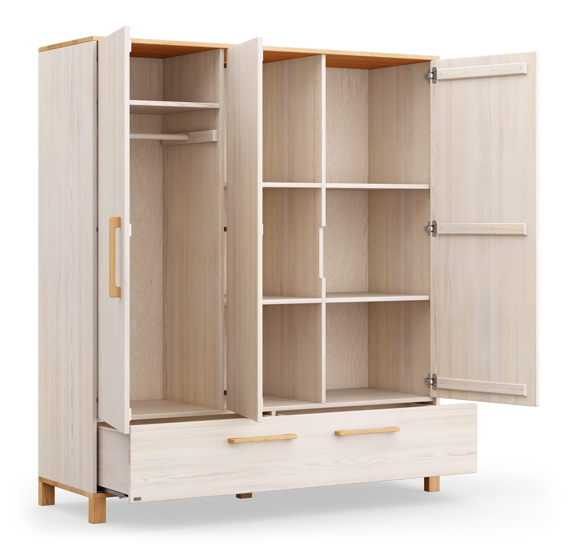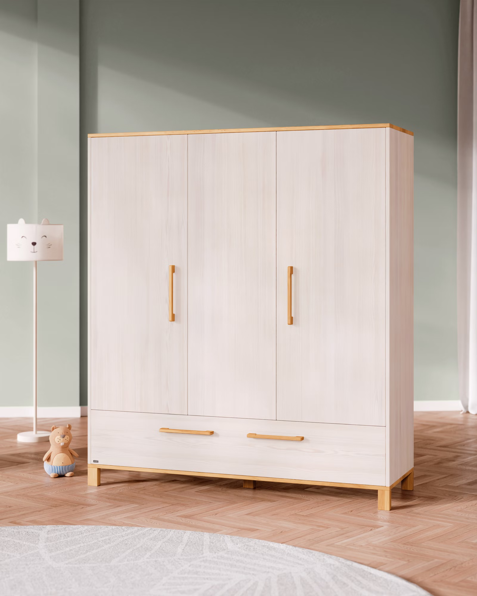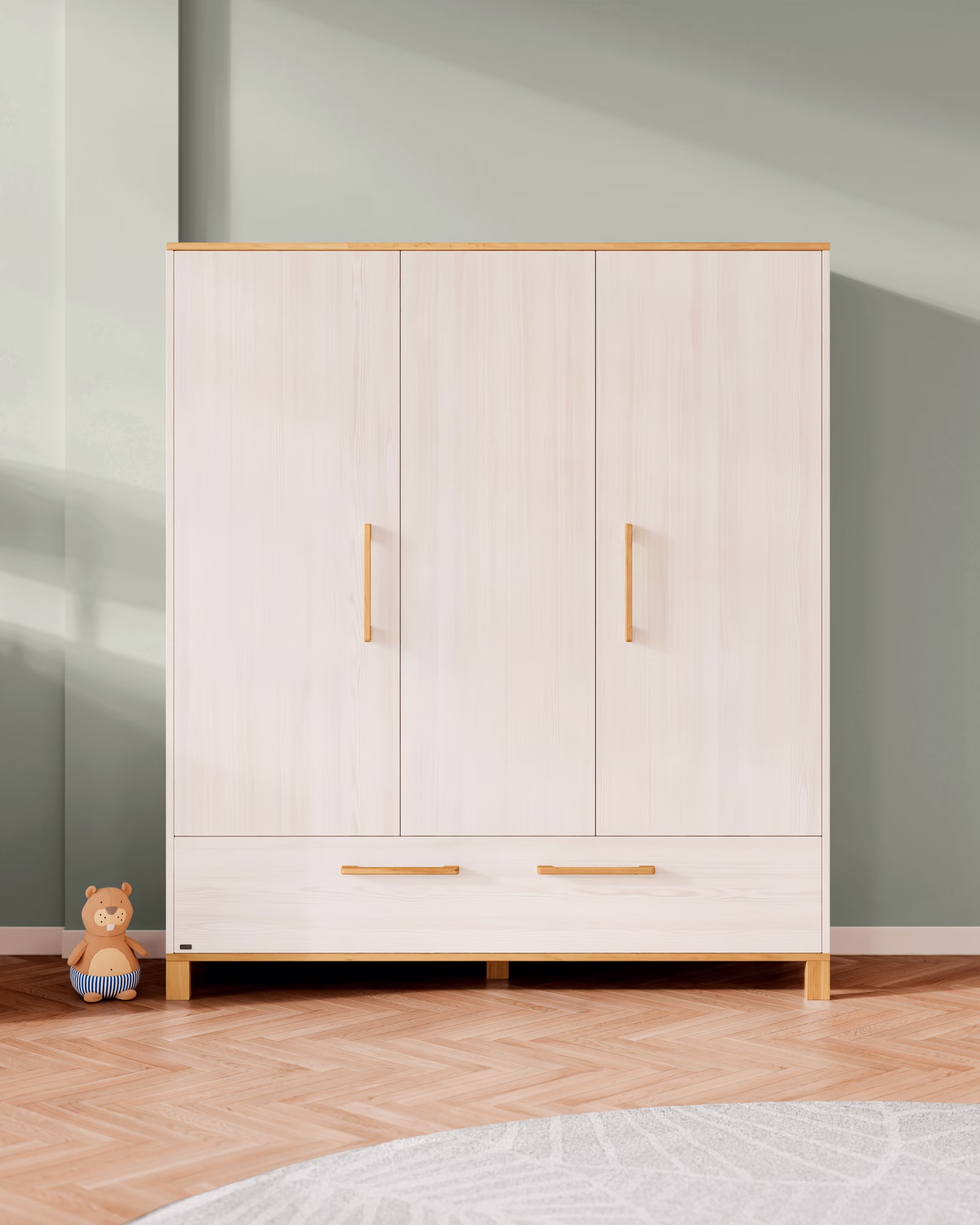 Der Theo Kleiderschrank 3-türig vereint zeitloses skandinavisches Design mit einer besonders hochwertigen Verarbeitung aus reinem Massivholz. Von Eltern für Familien entwickelt und von Schreinermeistern in bester Qualität umgesetzt. Ein treuer Weggefährte für die ganze Kindheit und weit darüber hinaus.