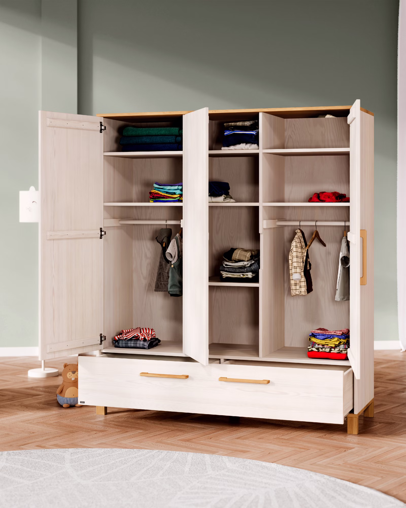 Die durchdachte Innenaufteilung sorgt für maximale Übersicht und Flexibilität im Familienalltag. Hinter drei Türen bietet der großzügige Kleiderschrank vielseitigen Stauraum: Fünf flexibel positionierbare Einlegeböden lassen sich individuell anpassen oder bei Bedarf erweitern. Eine praktische Kleiderstange ergänzt den Innenraum ideal und schafft Platz für Jacken, Hemden und Kleider – so wächst der Stauraum mit den Bedürfnissen Ihres Kindes mit.