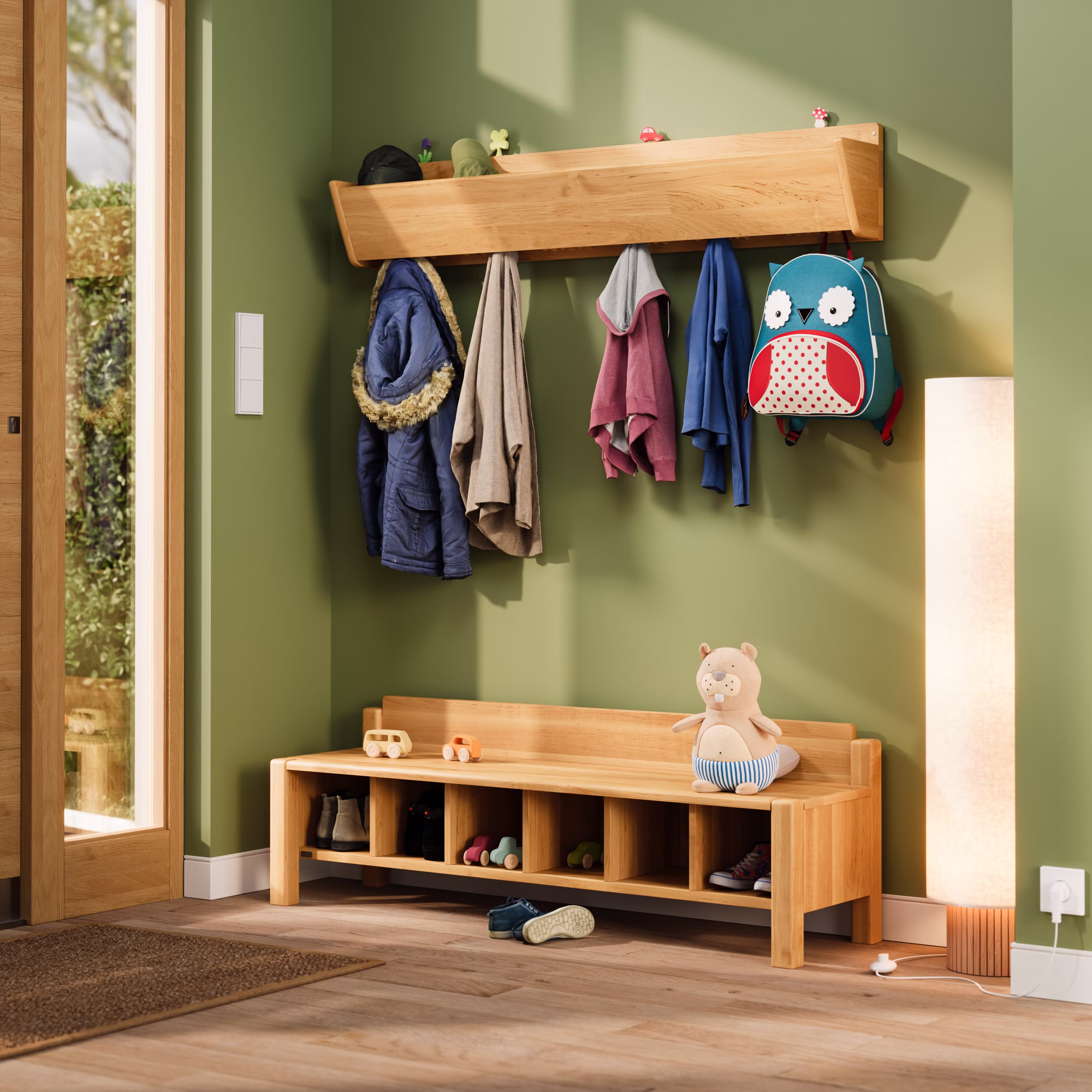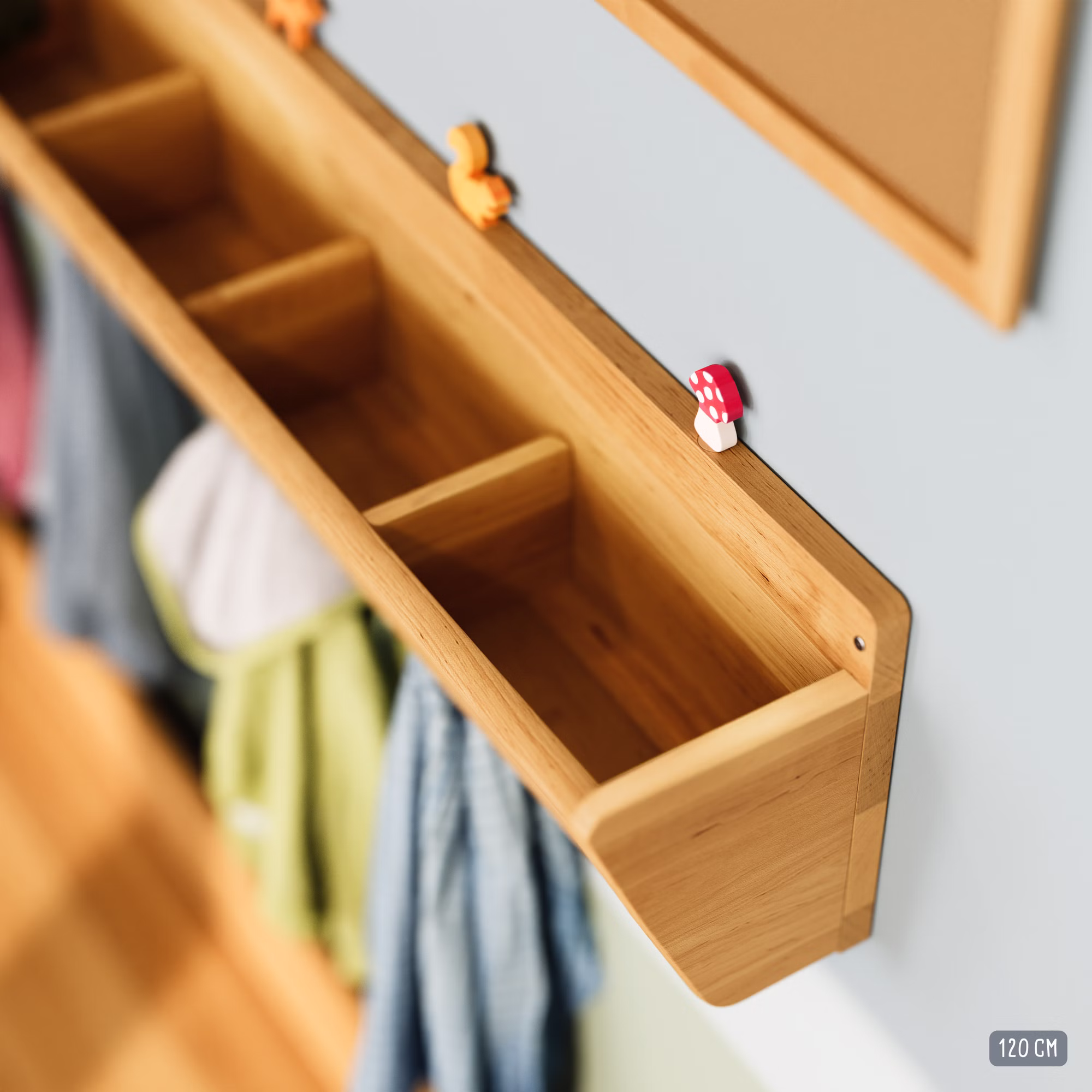 Die Robin Hänge-Garderobe aus massivem Bio-Erlenholz schafft natürliche Ordnung und unterstützt Kinder im Flur, Kinderzimmer oder in der Kita beim selbstständigen Aufhängen von Jacken, Rucksäcken und Accessoires. Die Hänge-Garderobe überzeugt durch kindgerechte Funktionalität, robuste Qualität und eine warme, natürliche Ausstrahlung.