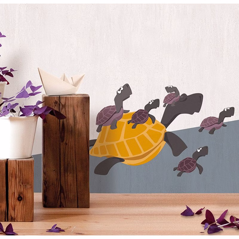 Wandstickerset mit Schildkrötenfamilie. Der Wandsticker besteht aus einer farbig bedruckten matten Folie, die sich rückstandsfrei wieder von der Wand entfernen lässt. Auch geeignet für Innenscheiben von Fenstern, Fliesen oder Möbel. Das Aufkleben auf glattem und staubfreiem Untergrund ist kinderleicht und wird in der Verpackung detailliert beschrieben. Hinweise: Haftet nicht auf Wandfarbe mit Silikon- oder Latexanteilen. Die Folie ist bedruckt und auf der Rückseite weiß.
