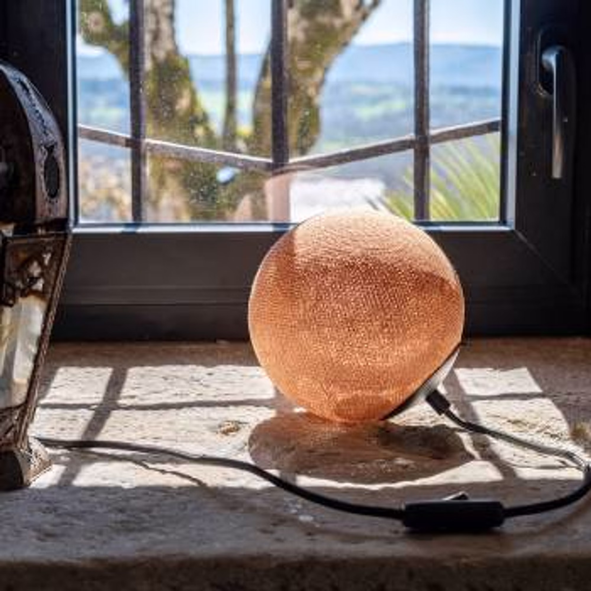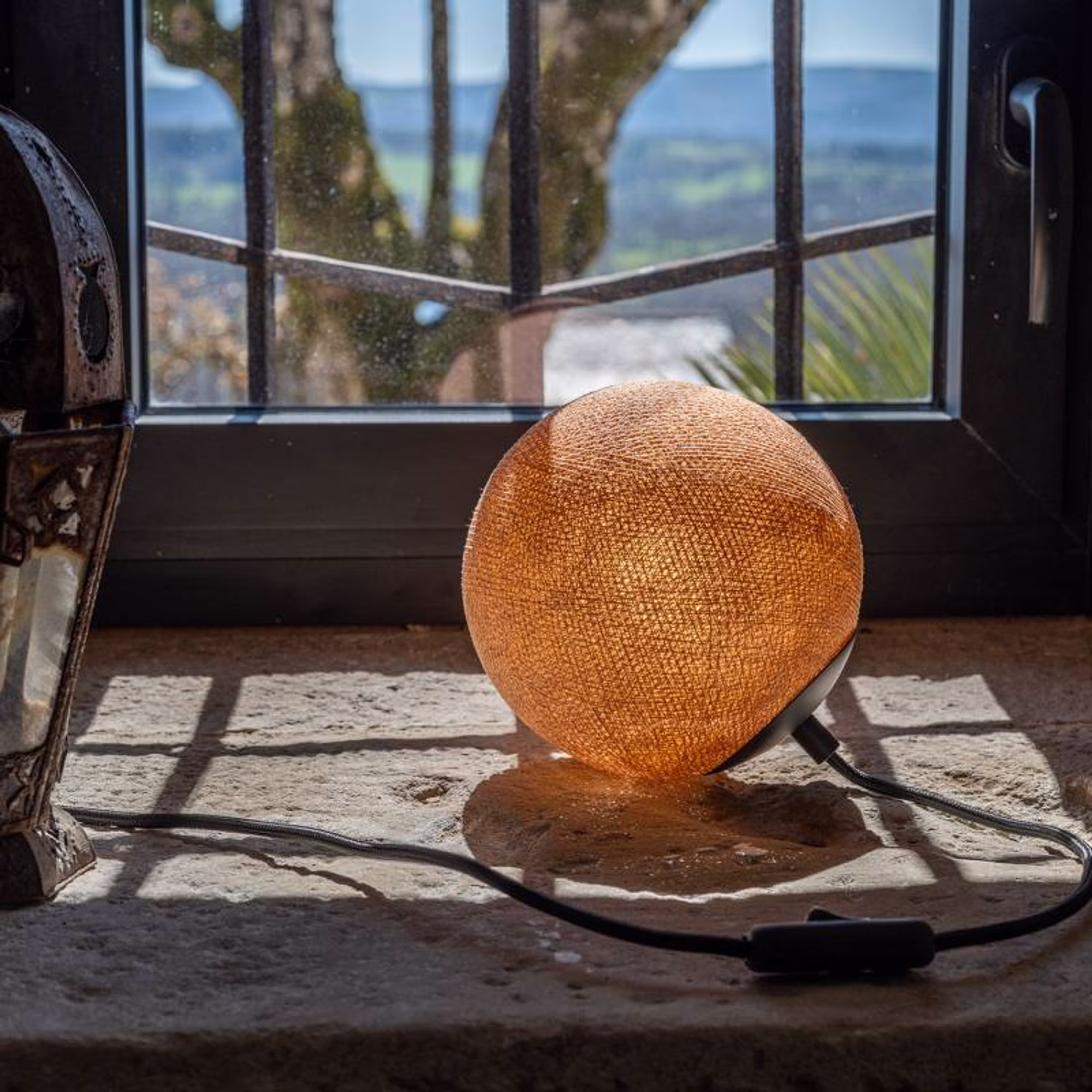 Die nomadische Apapa-Aufhängung wird mit einer magnetischen Kugel, einem 3,50 m langen schwarzen gewebten Kabel und einem schwarzen Metallbecher geliefert und kann nach Belieben an Balken Haken oder Geländern befestigt werden.