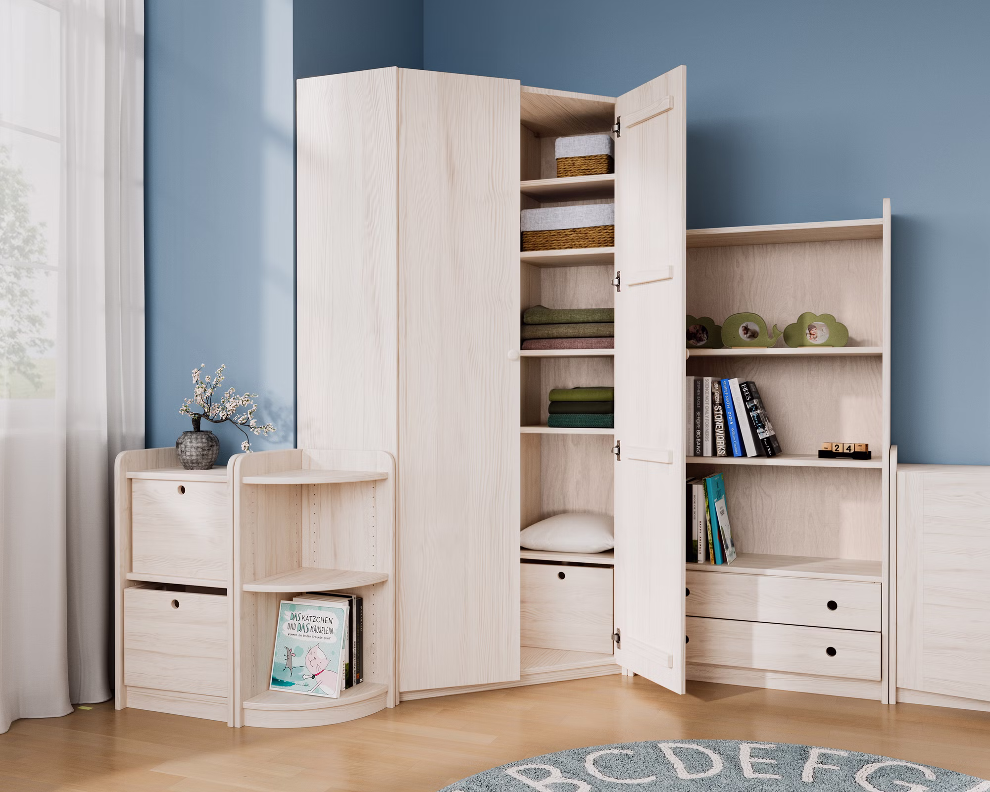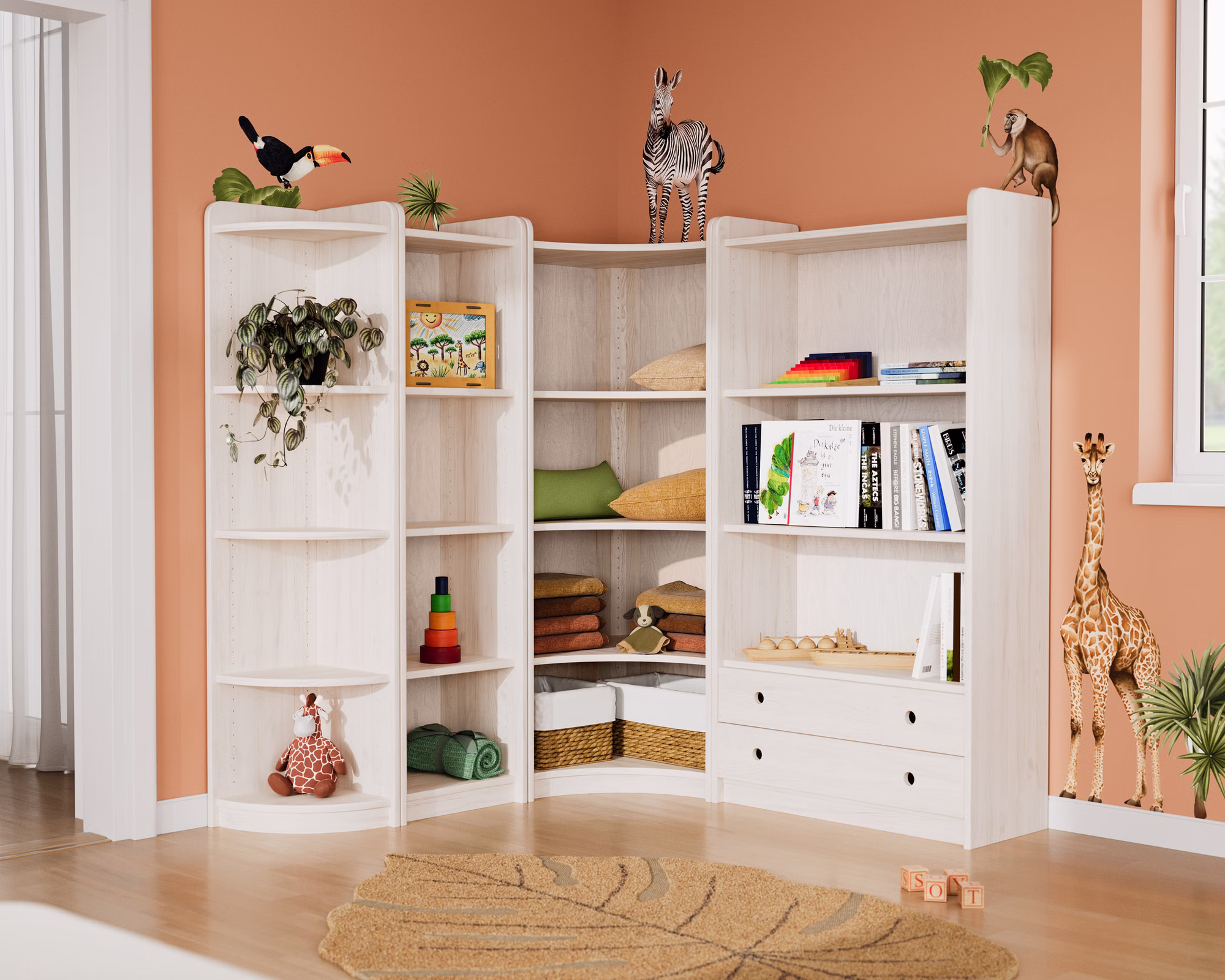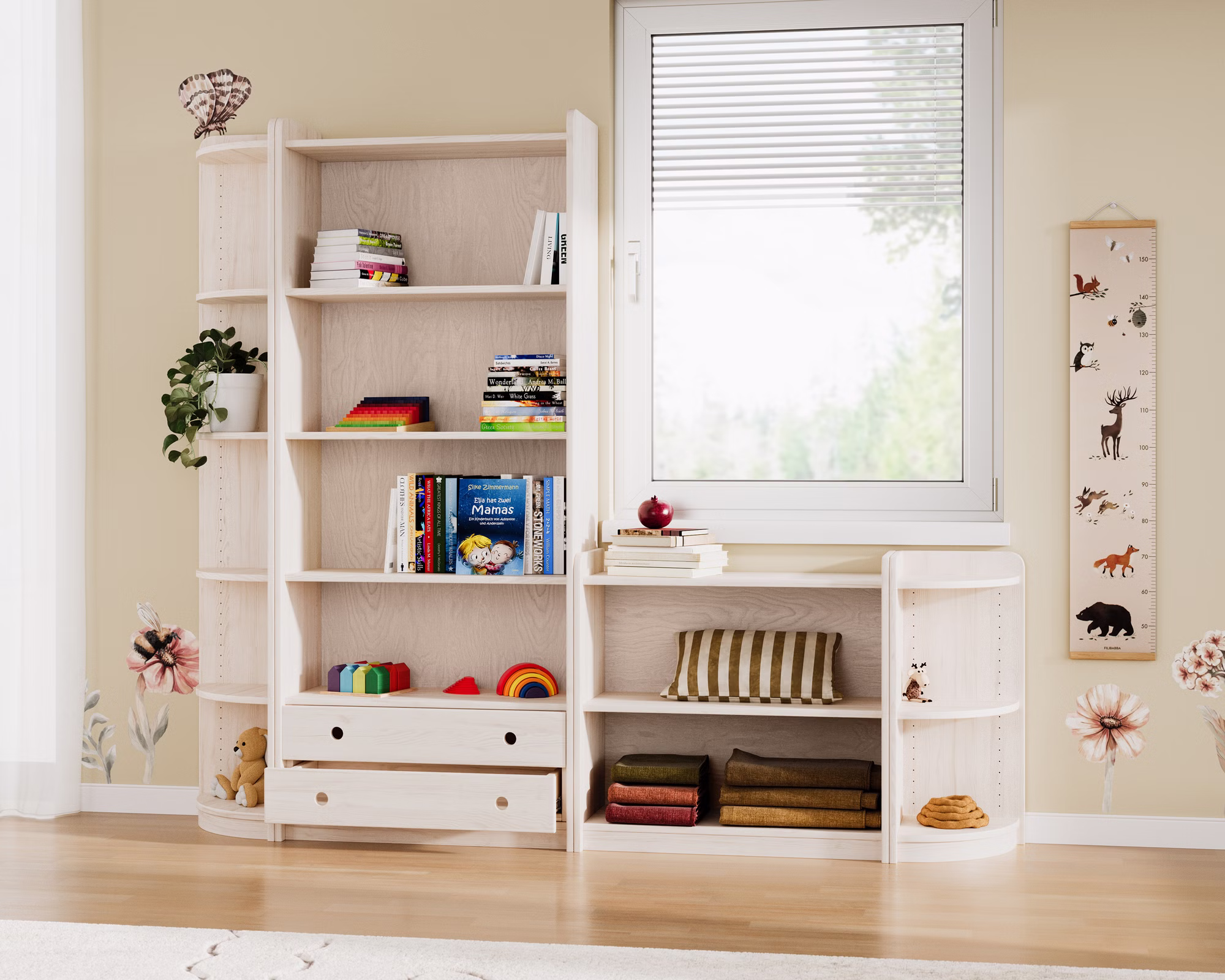 Das formschöne und flexible BioKinder Lara Regalsystem aus ökologischem Vollholz schafft eine natürliche Wohnatmosphäre in jedem Zimmer. Die Regalelemente lassen sich variabel kombinieren und bieten optimale Ordnungslösungen für jeden Raum. Erweiterbar und mitwachsend durch Regal-, Schubladen-, Unterbauelemente und Türen. Aus nachhaltigem Erlen-Massivholz, biologisch geölt und gewachst bzw. Bio-Kiefernmassivholz natürlich weiß lasiert.